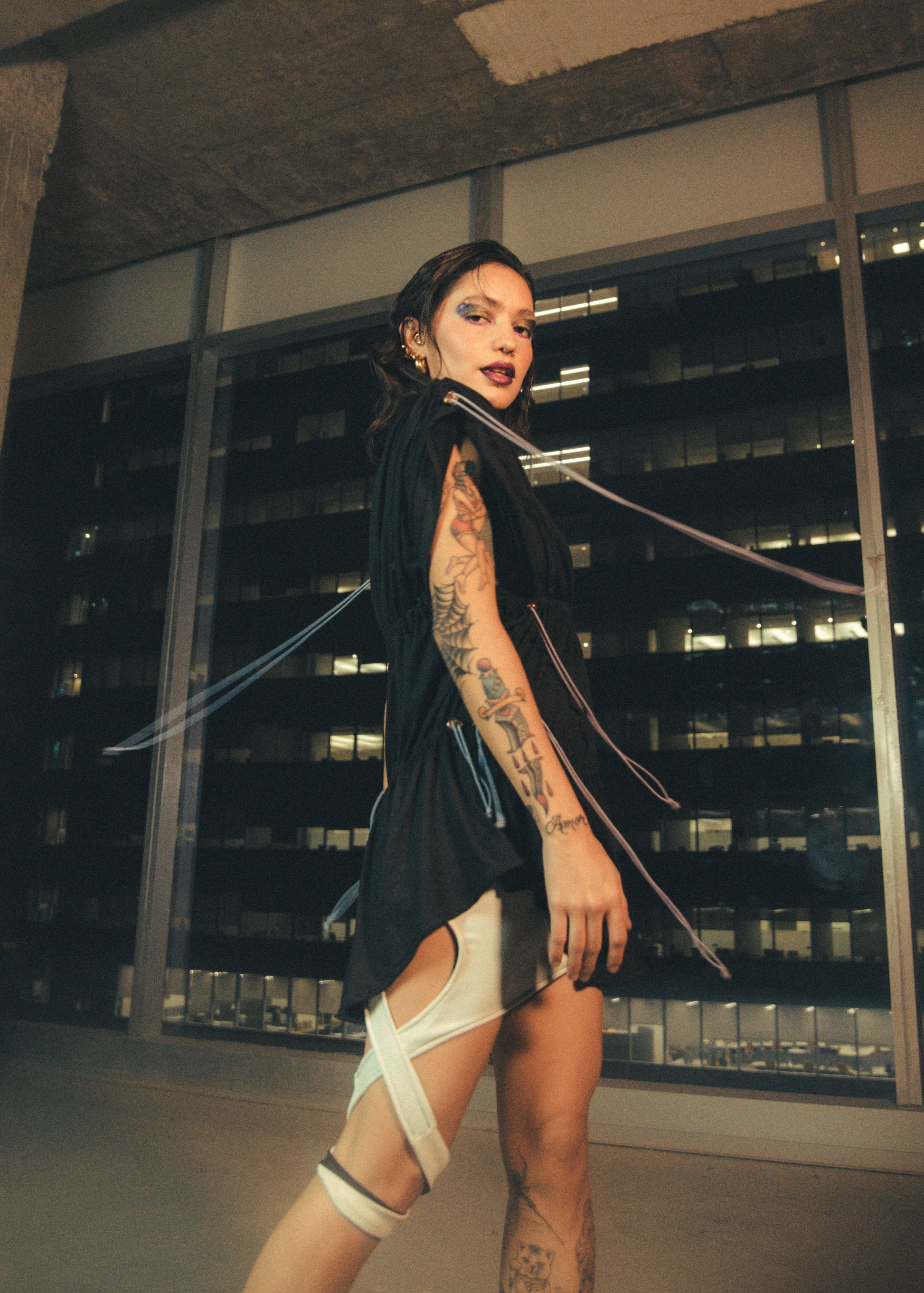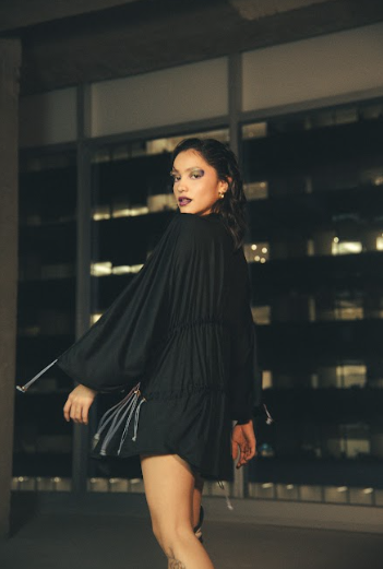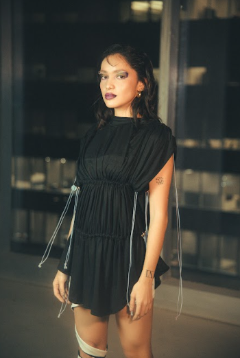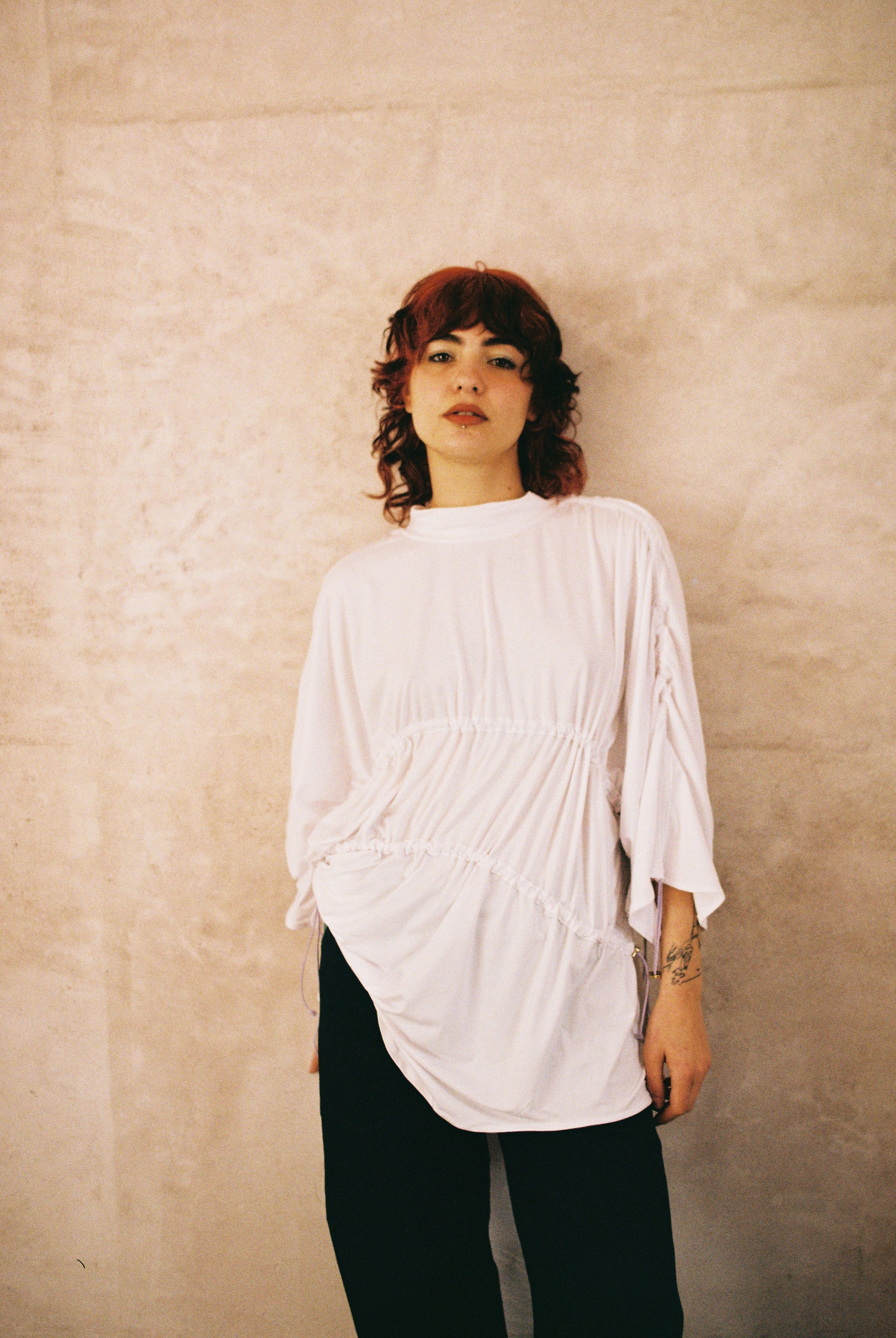 A versatile garment that can be worn as a loose oversized tee or as a draped dress. It features horizontal drawstrings at the shoulders, chest, and waist to transform your look, adjusting it to your liking. Made from a very fine and soft cotton/spandex blend. The hardware is gold-tone hardware. Ethically made in Mexico.