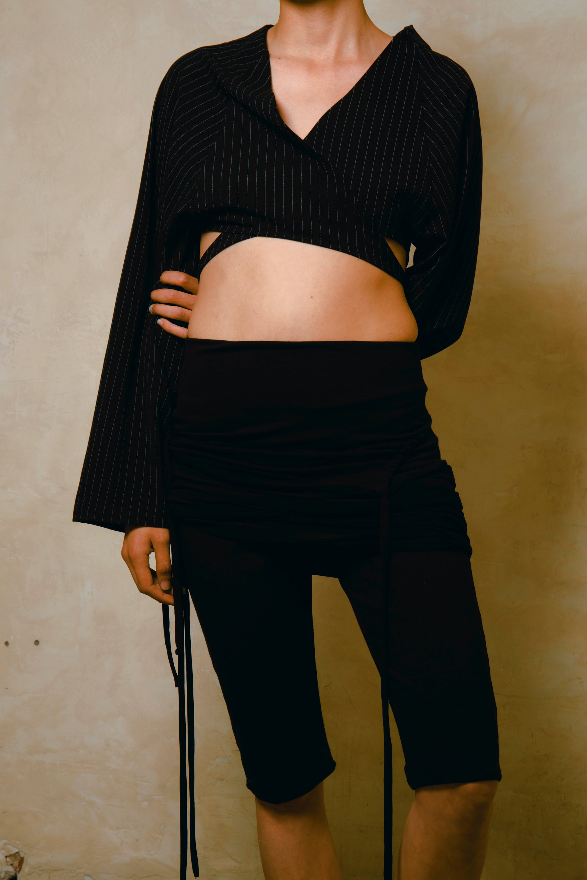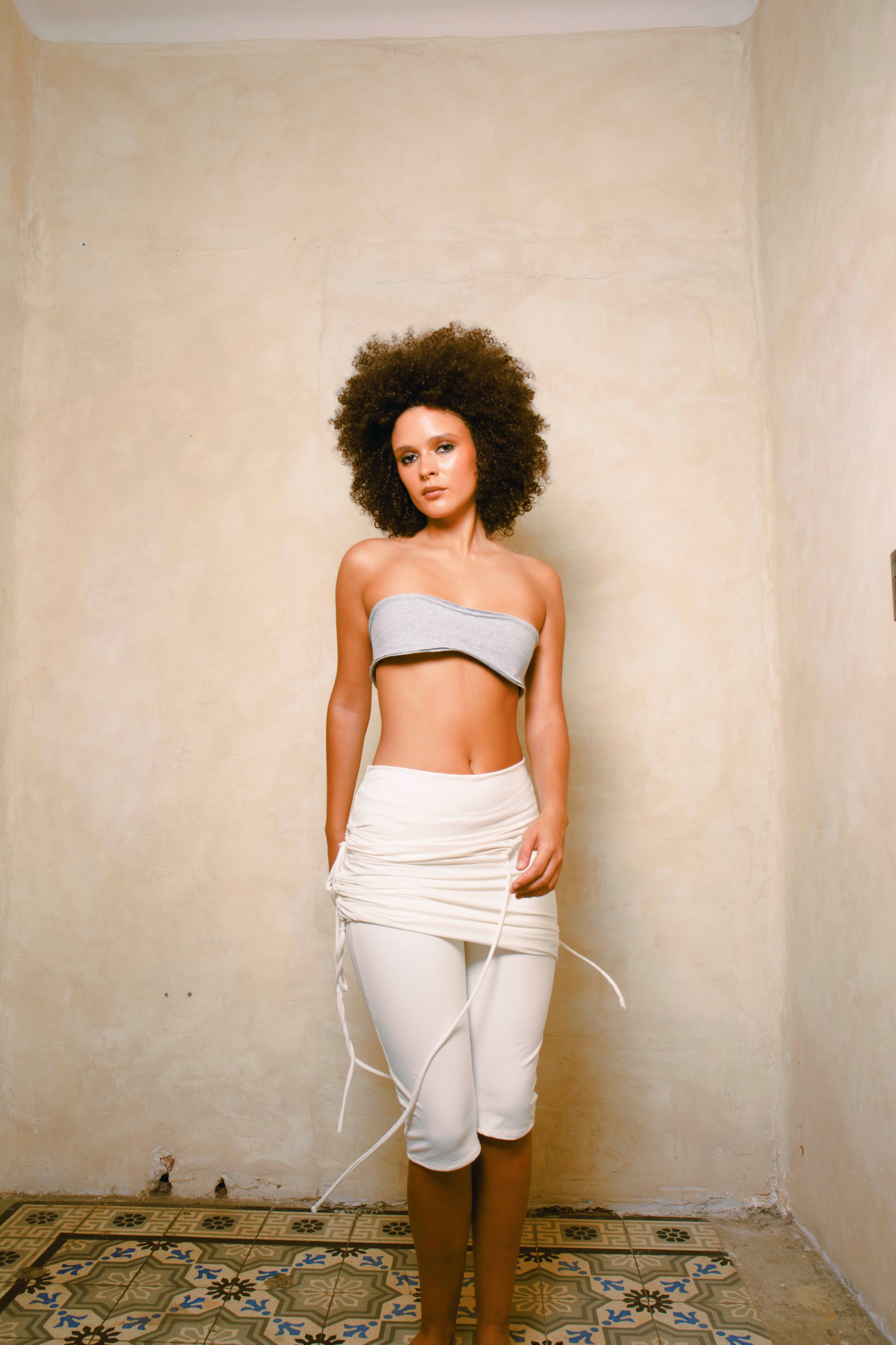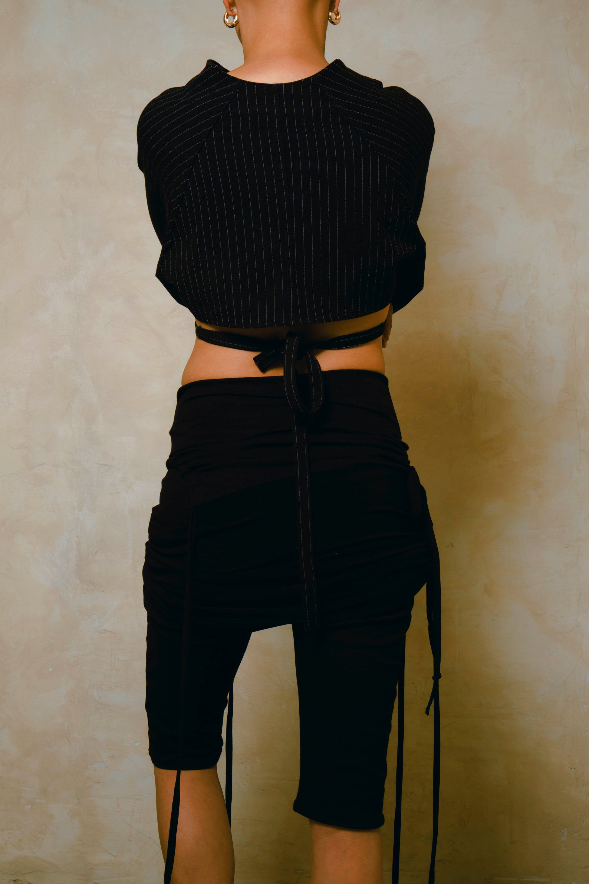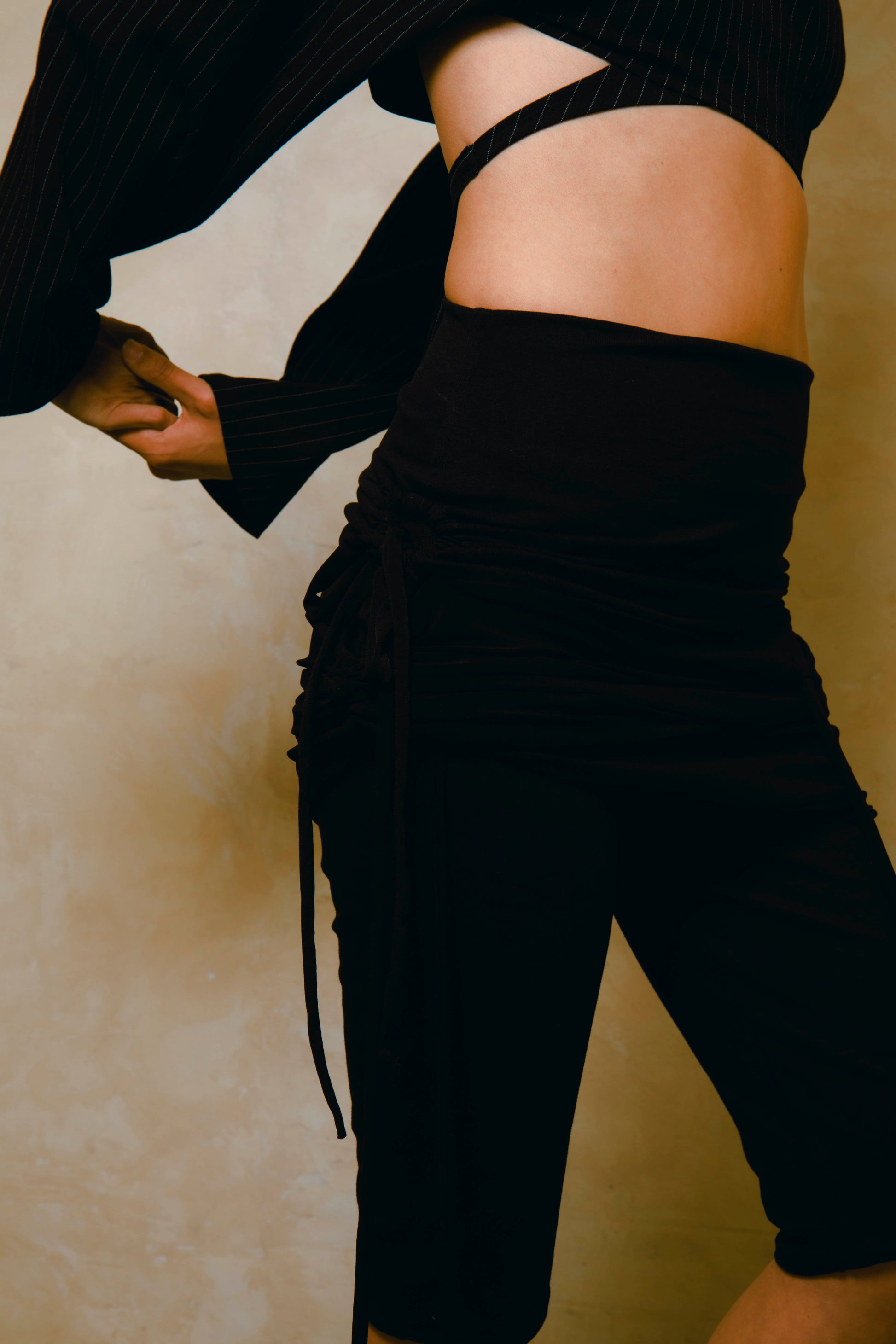 And can also be worn as a pant - untying the shoulder straps and sliding the torso piece down, until you reach the hip part. The drawstrings pass through two channels on the side of the bustier that, when transformed into pants, are able to adjust to the hip measurement-