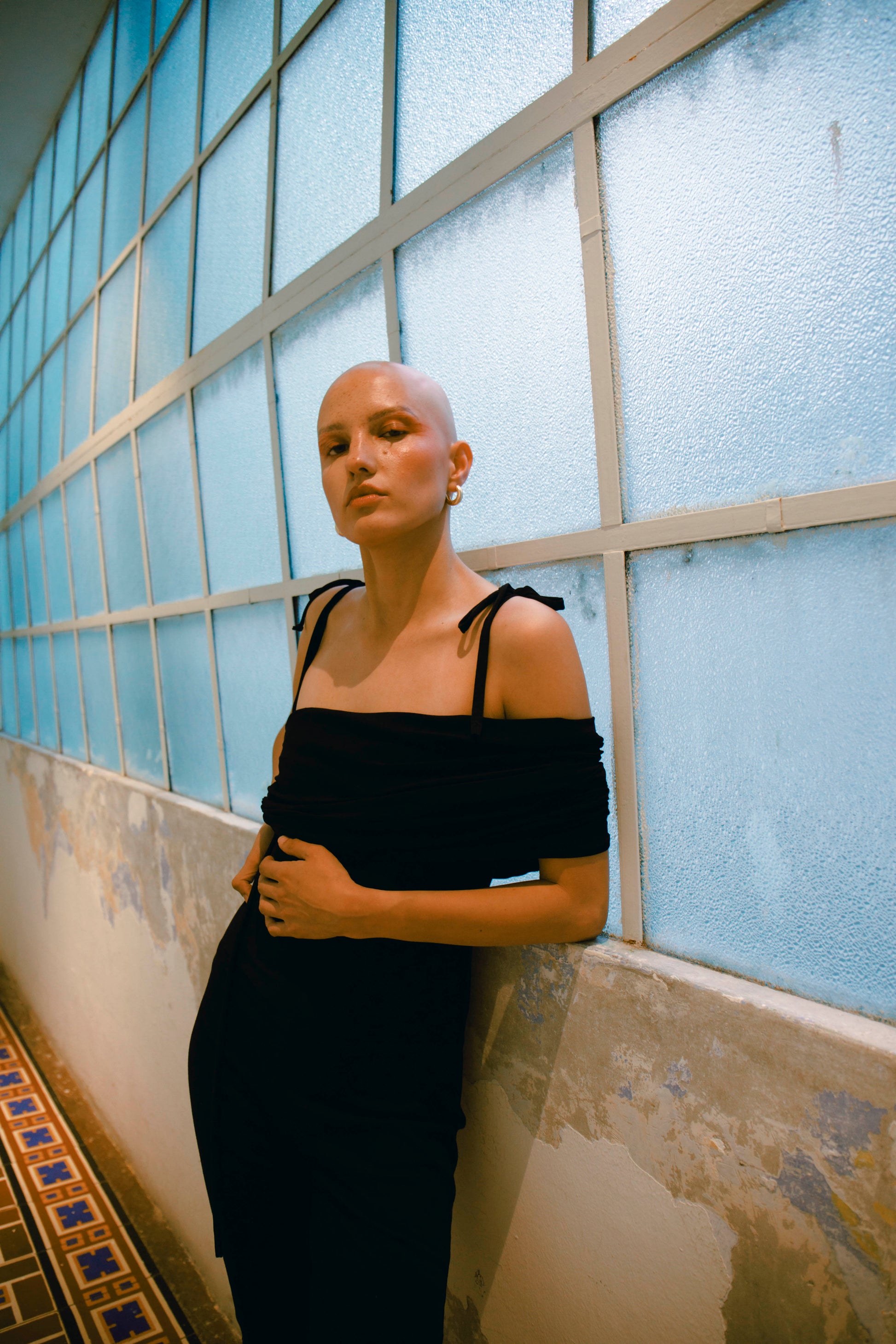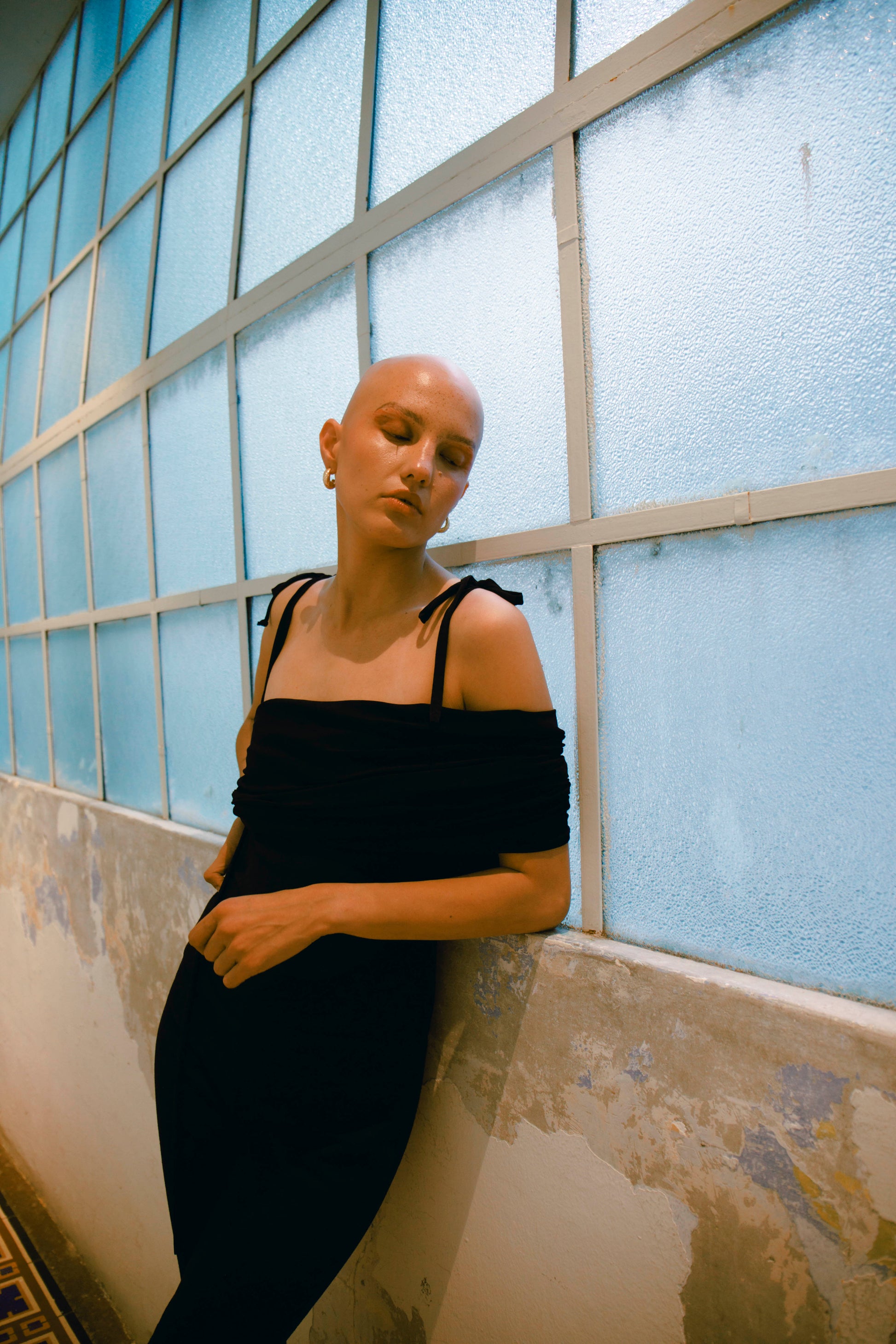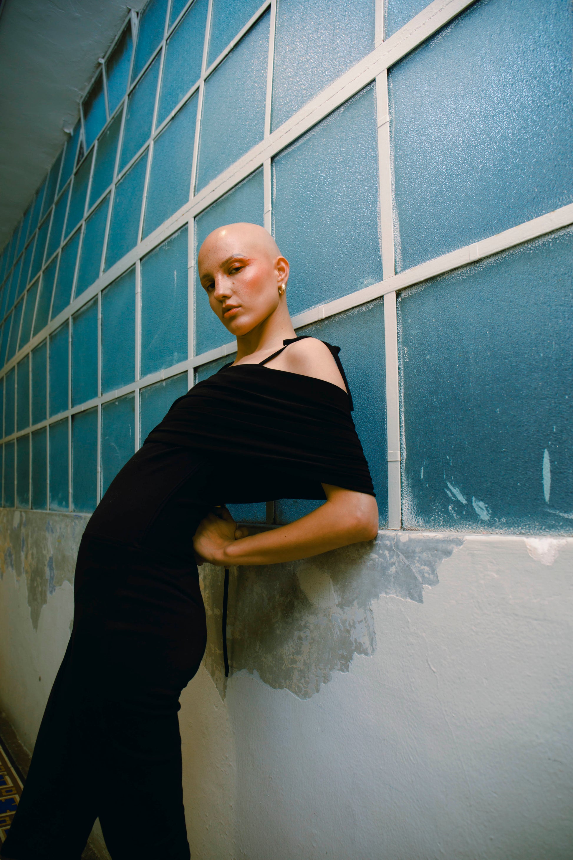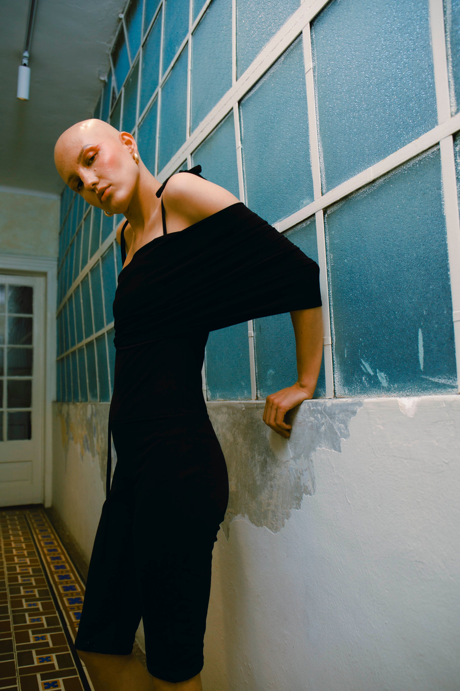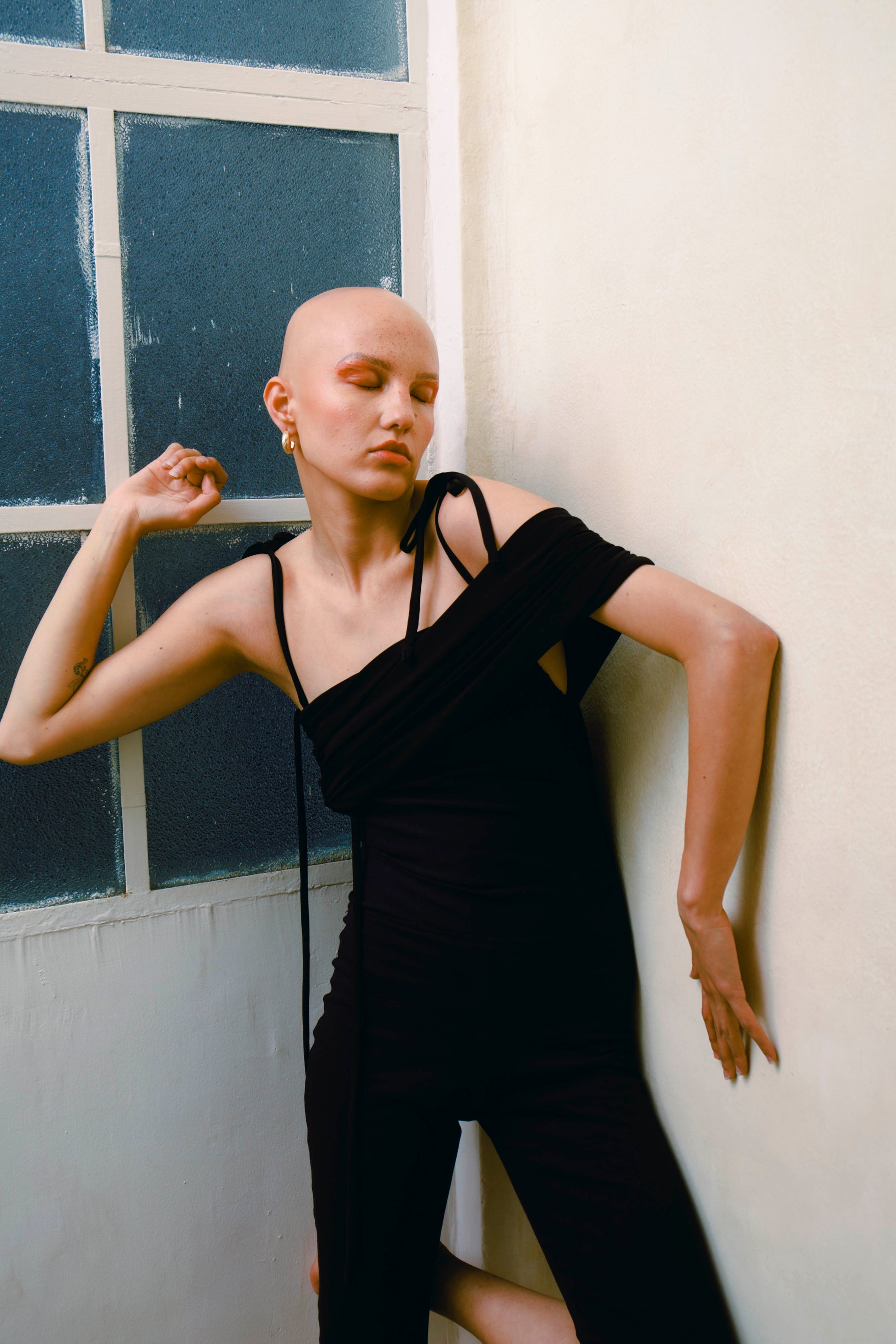 This piece can be worn as a jumpsuit - with the straps tied up on the shoulders. The sheer pleated overpiece covering one arm, emulating an off shoulder cut -