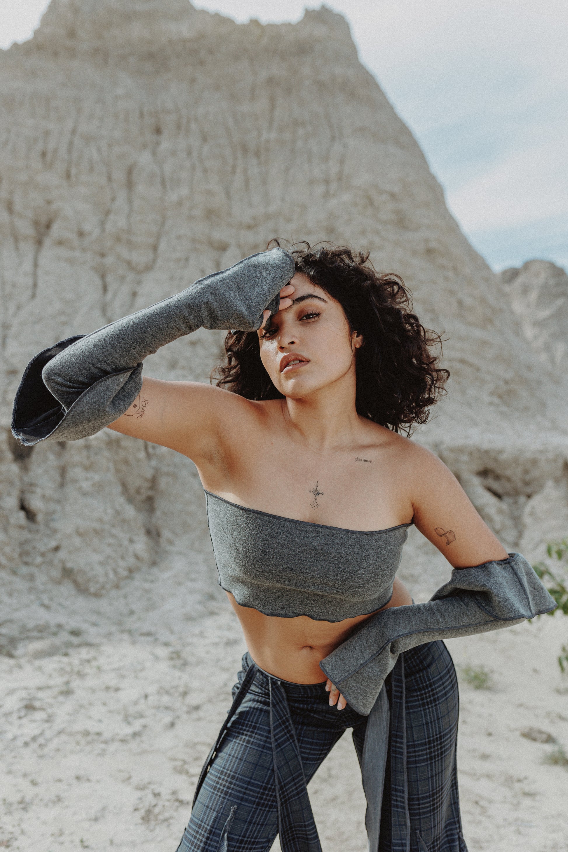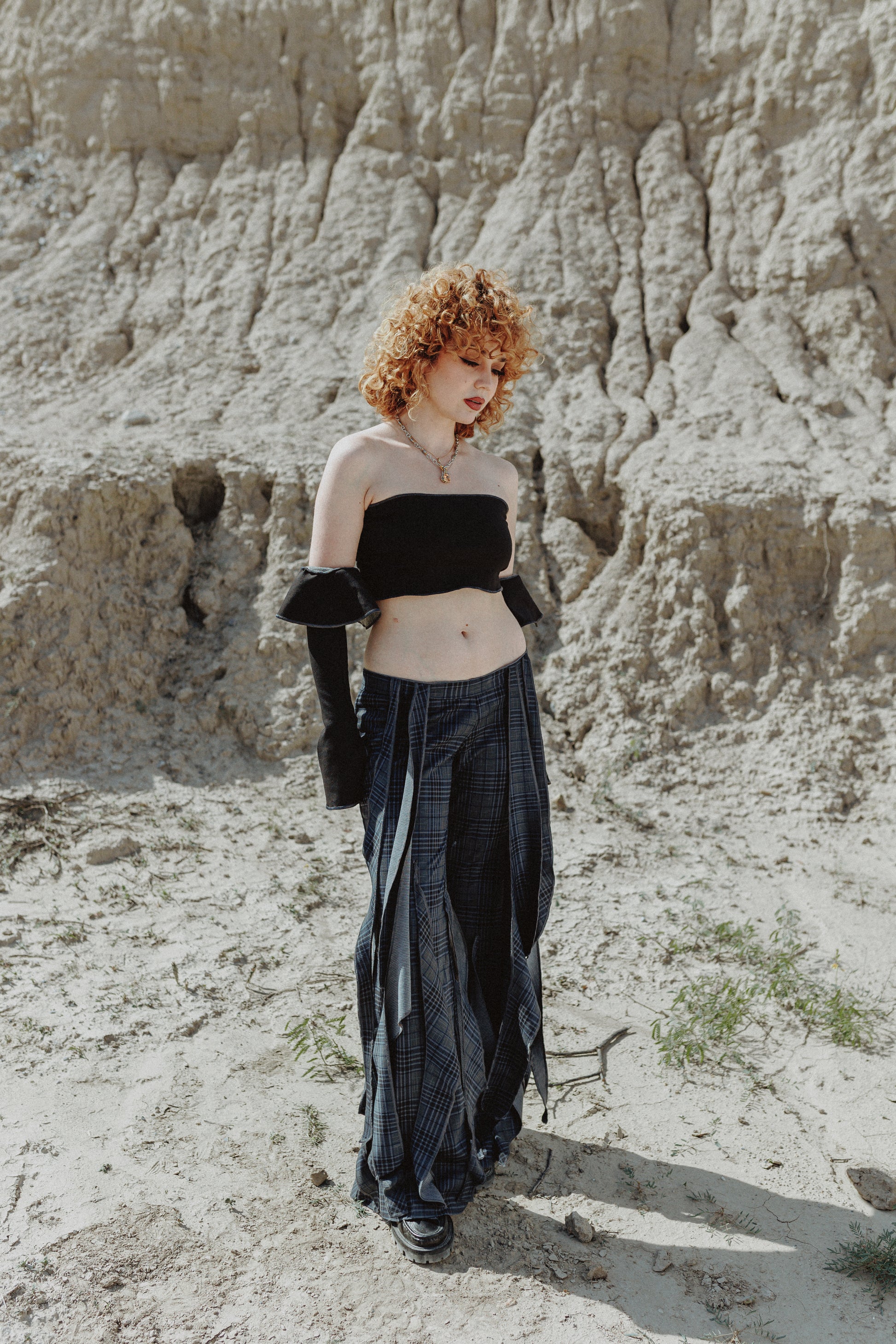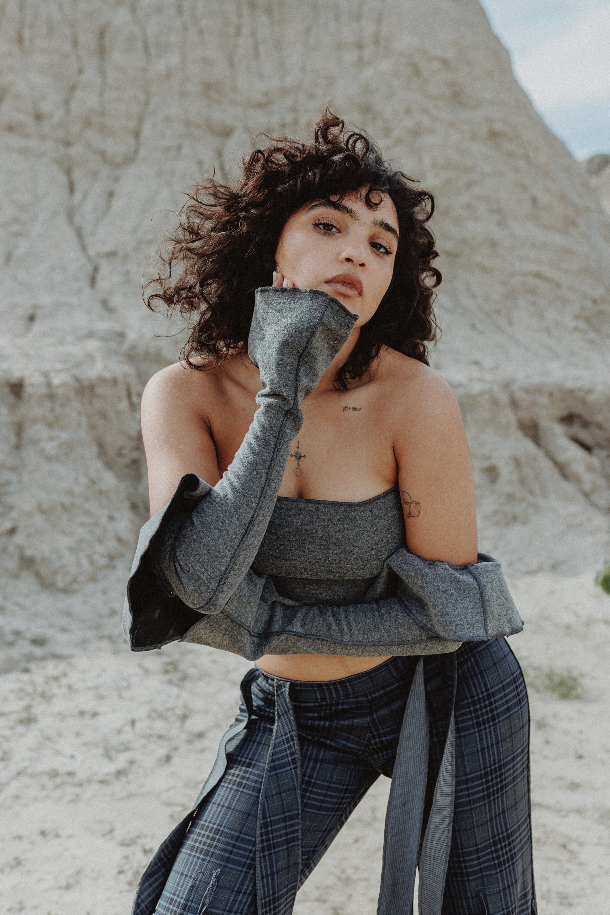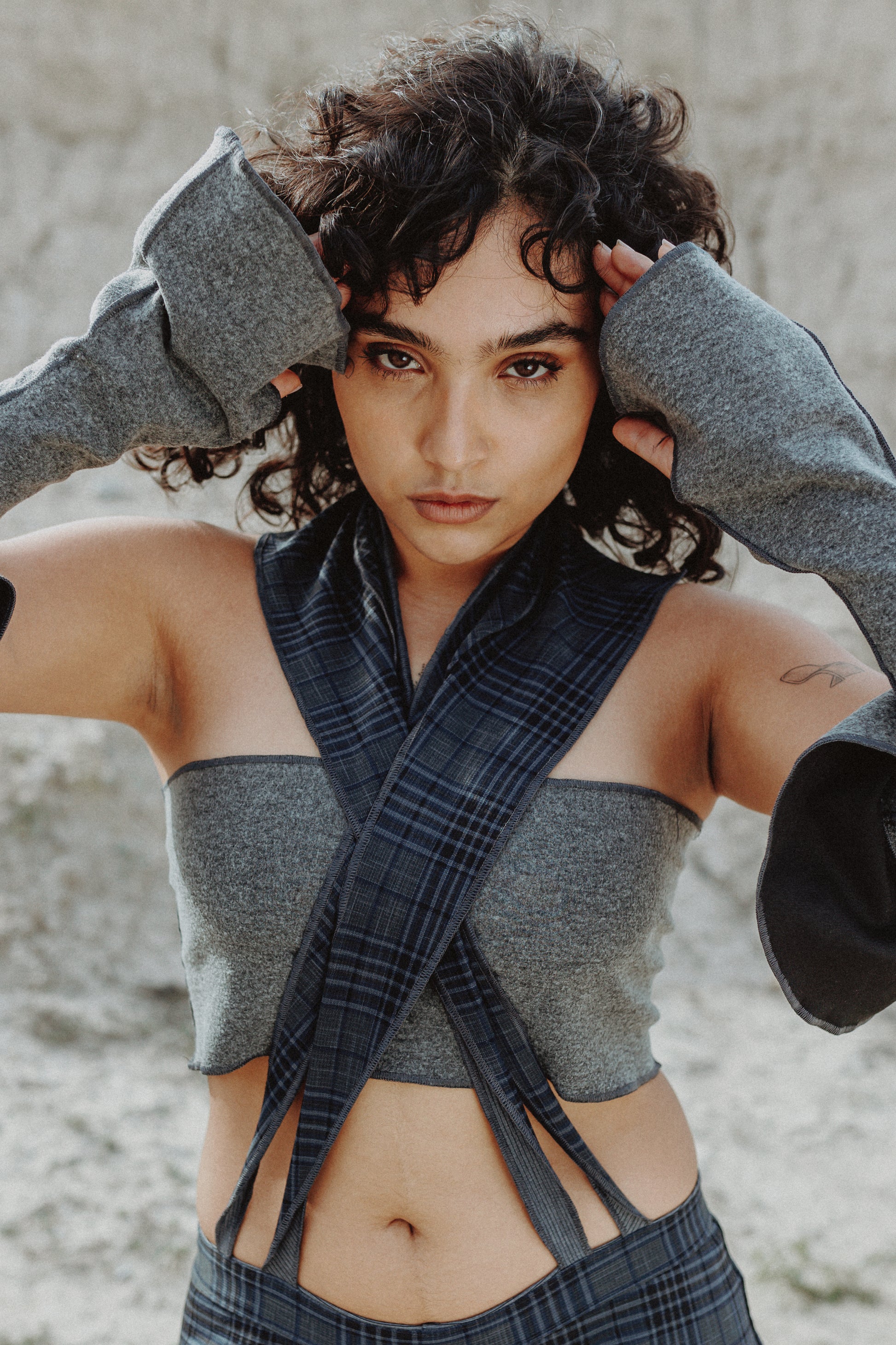 Reversible Top with gloves, the fabric is gray in one side and black in the other.