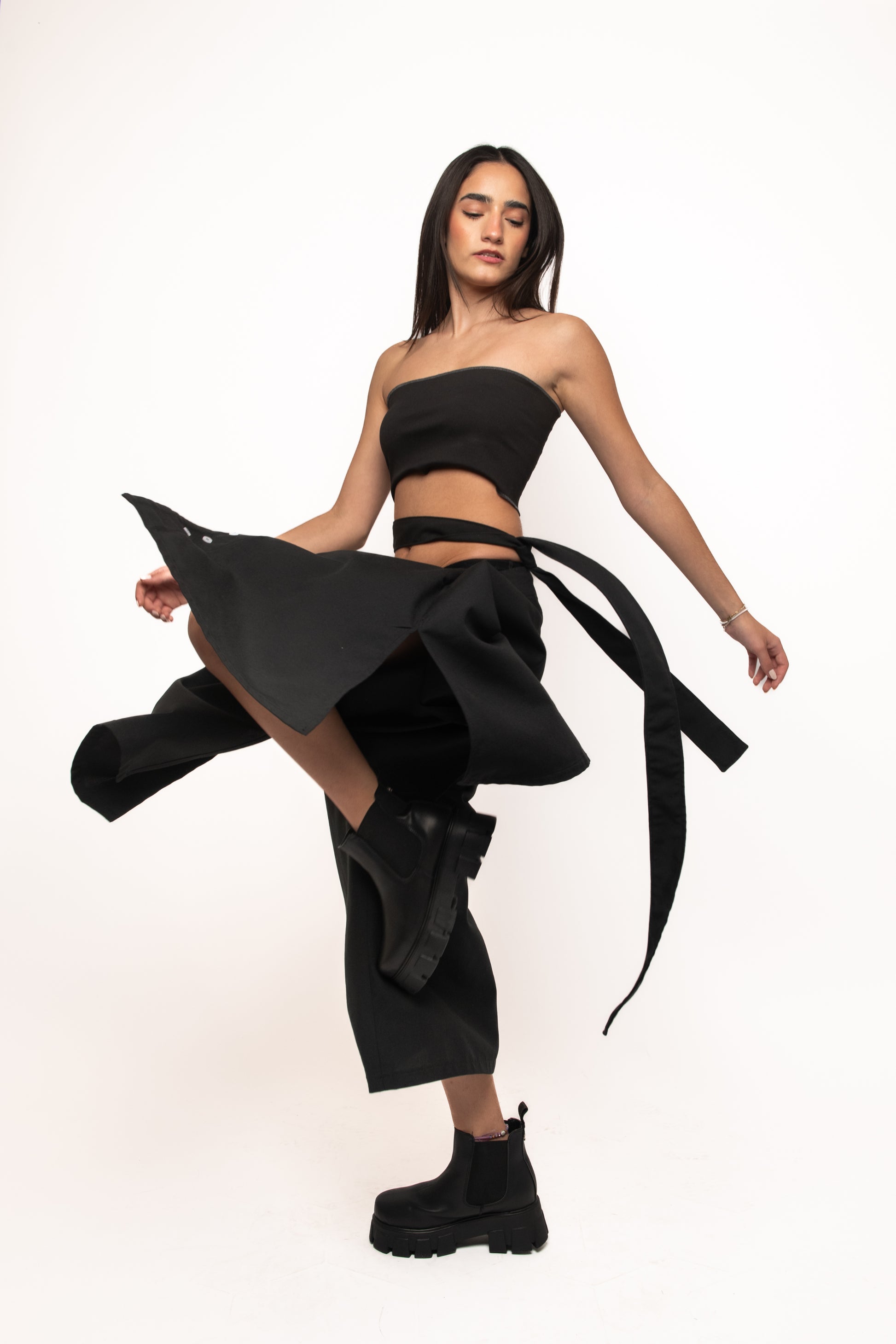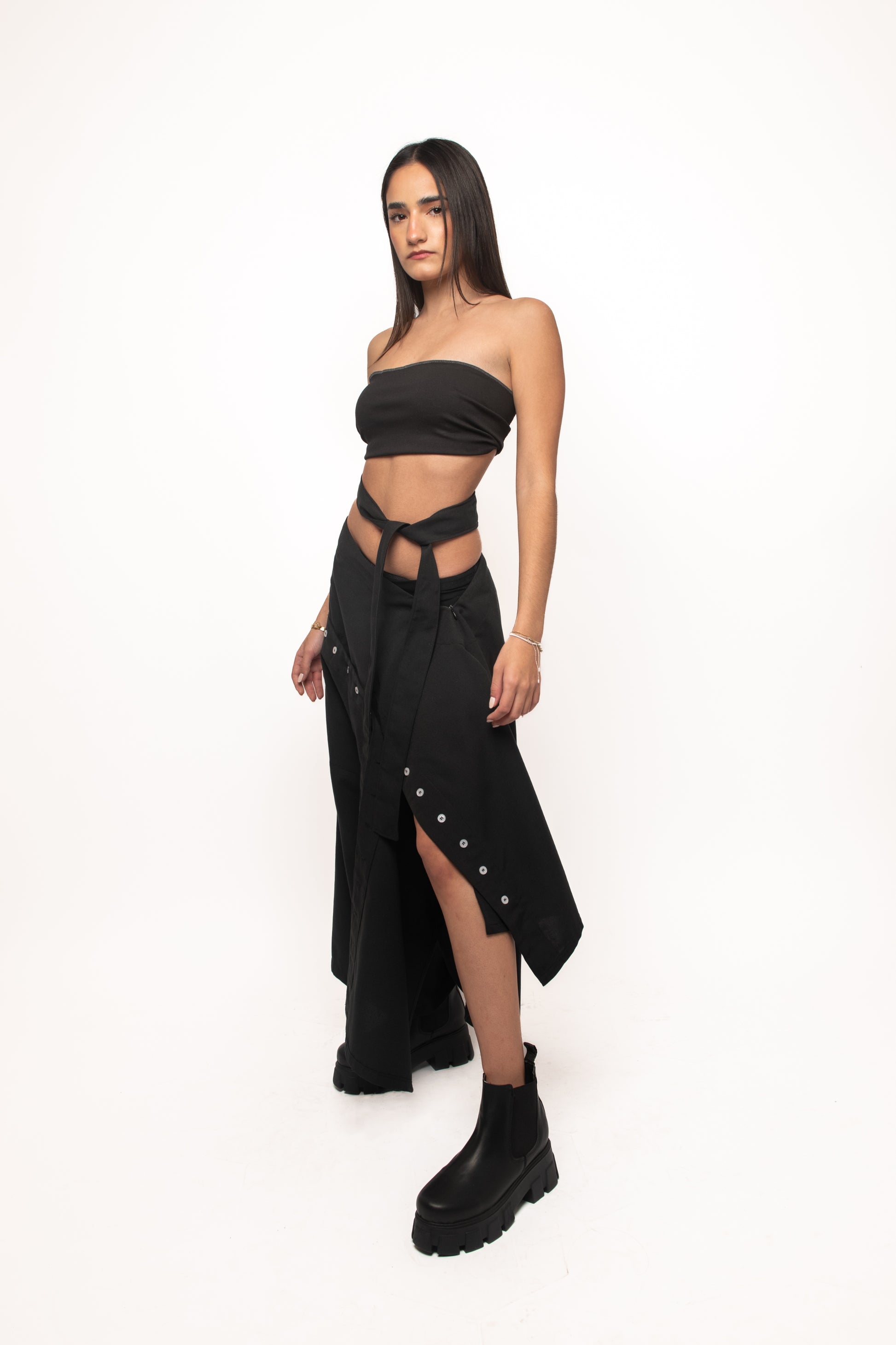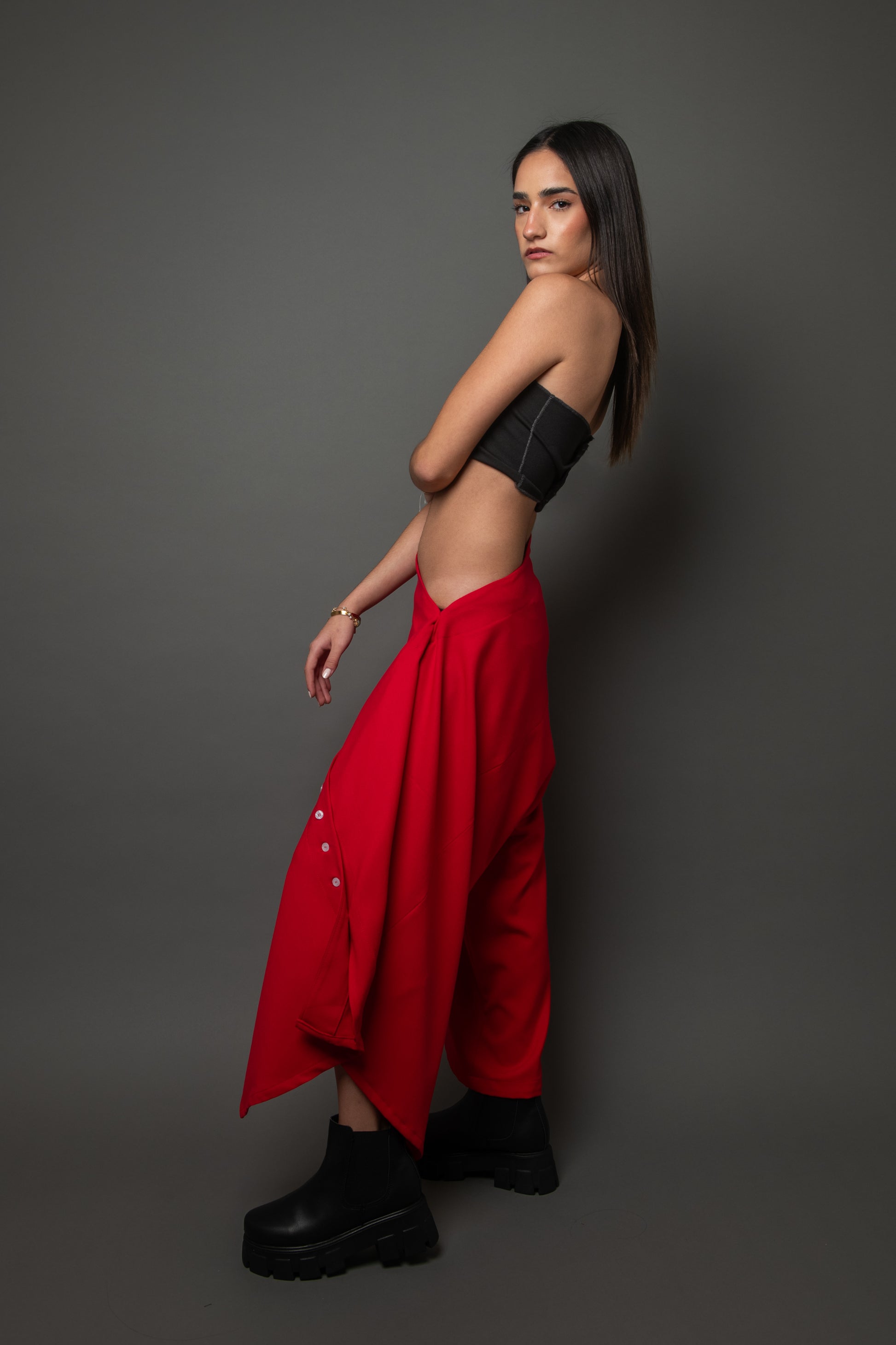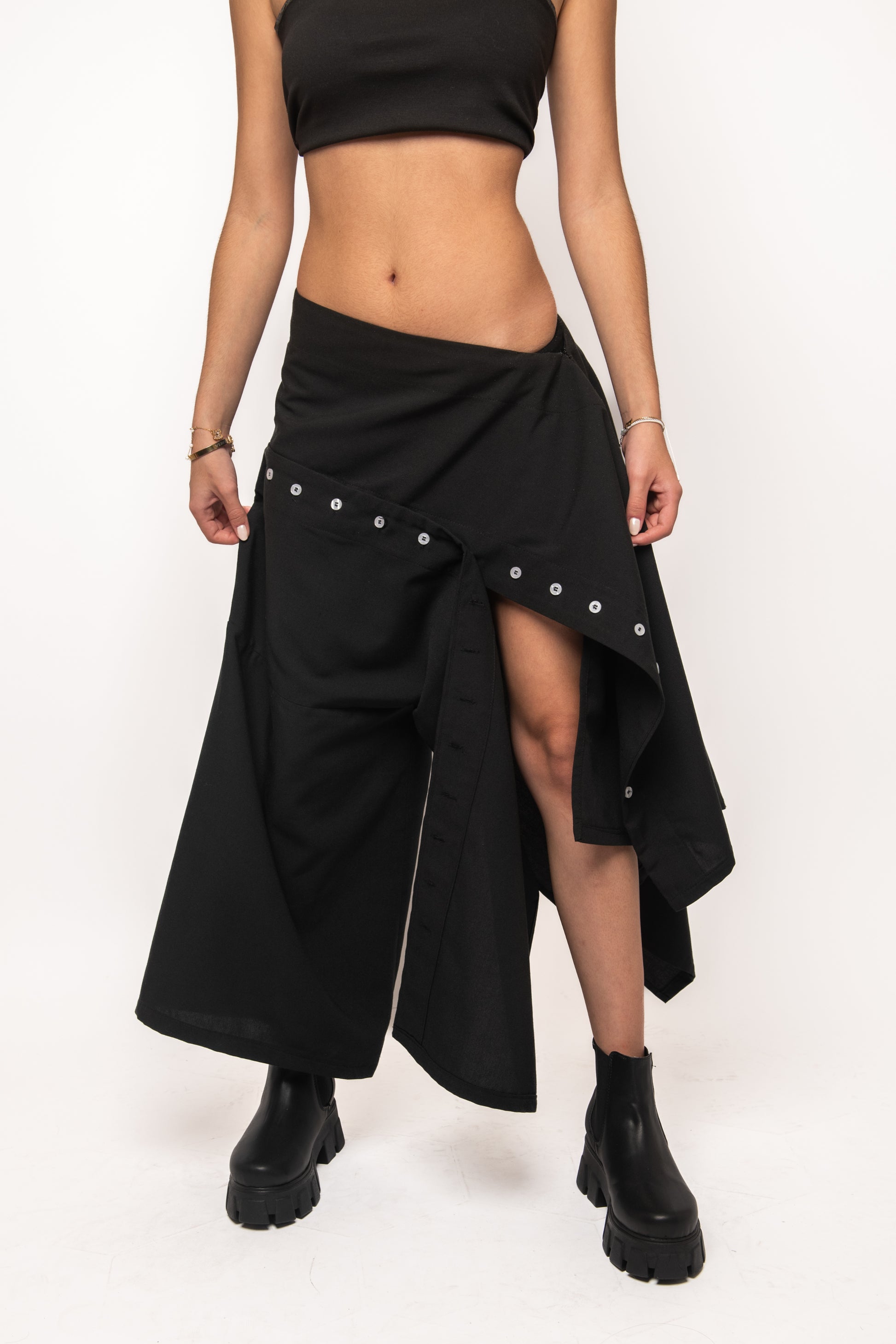 Lleva un zipper invisible en el costado y letillas de ojal y botón por el frente que al cerrarse completamente le otorga el look de pantalón.