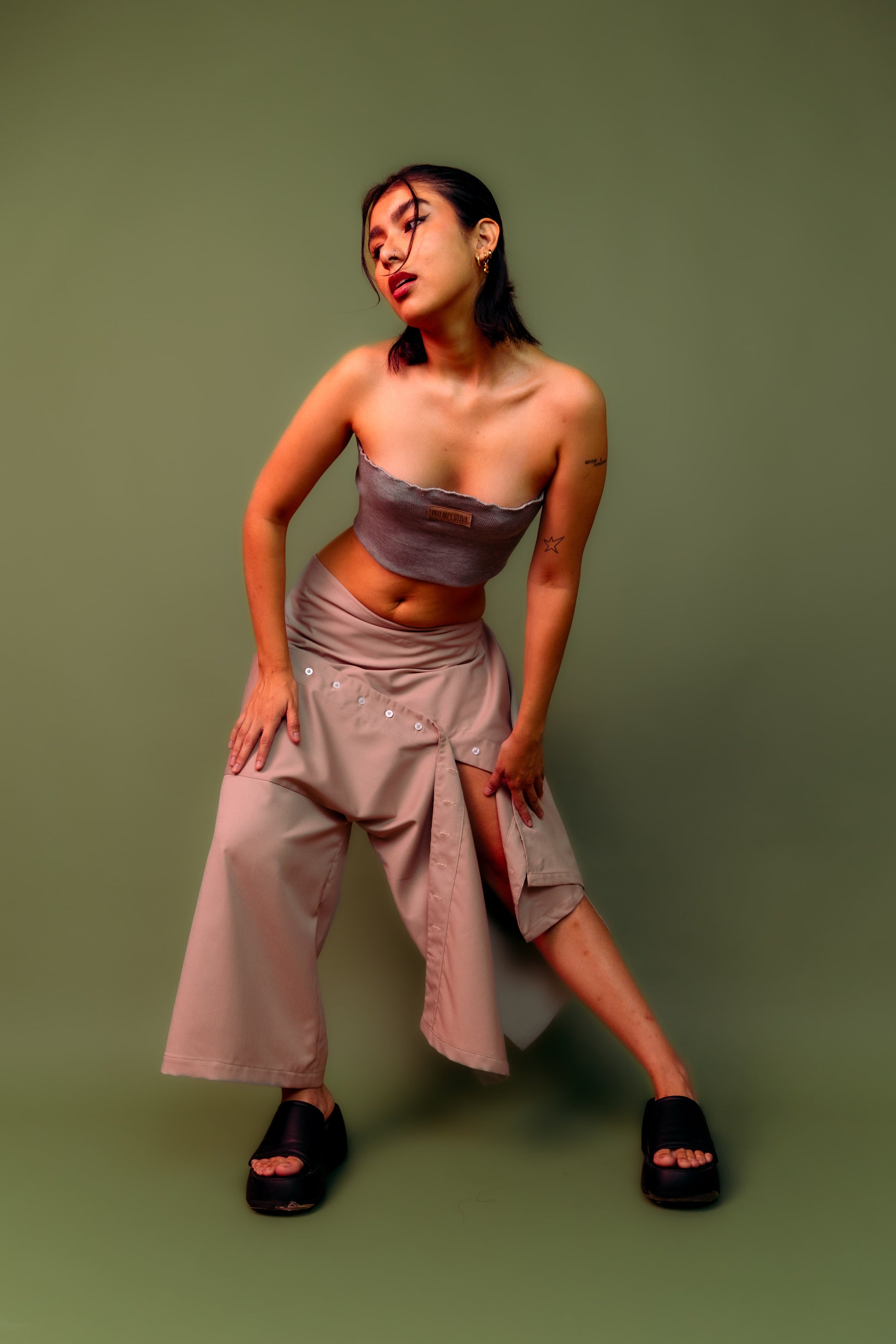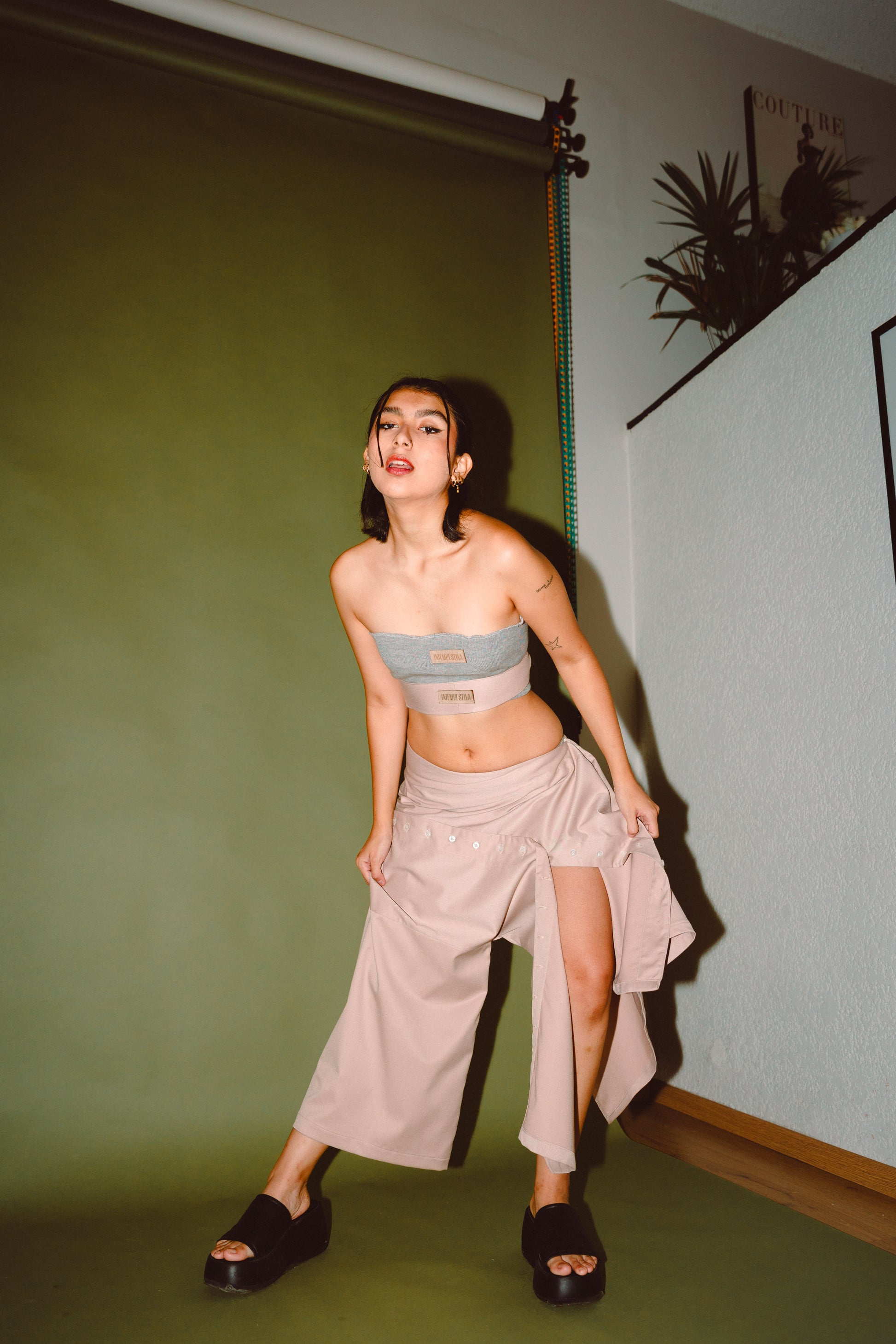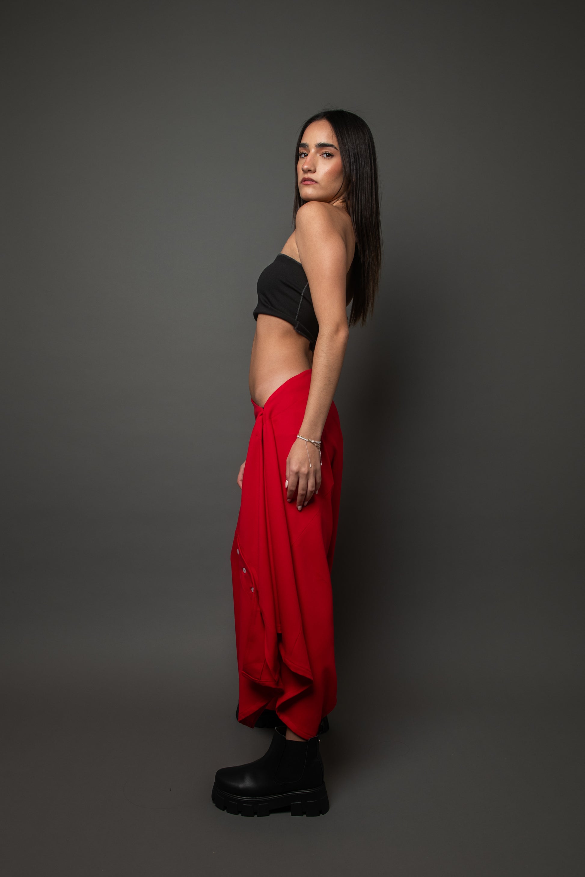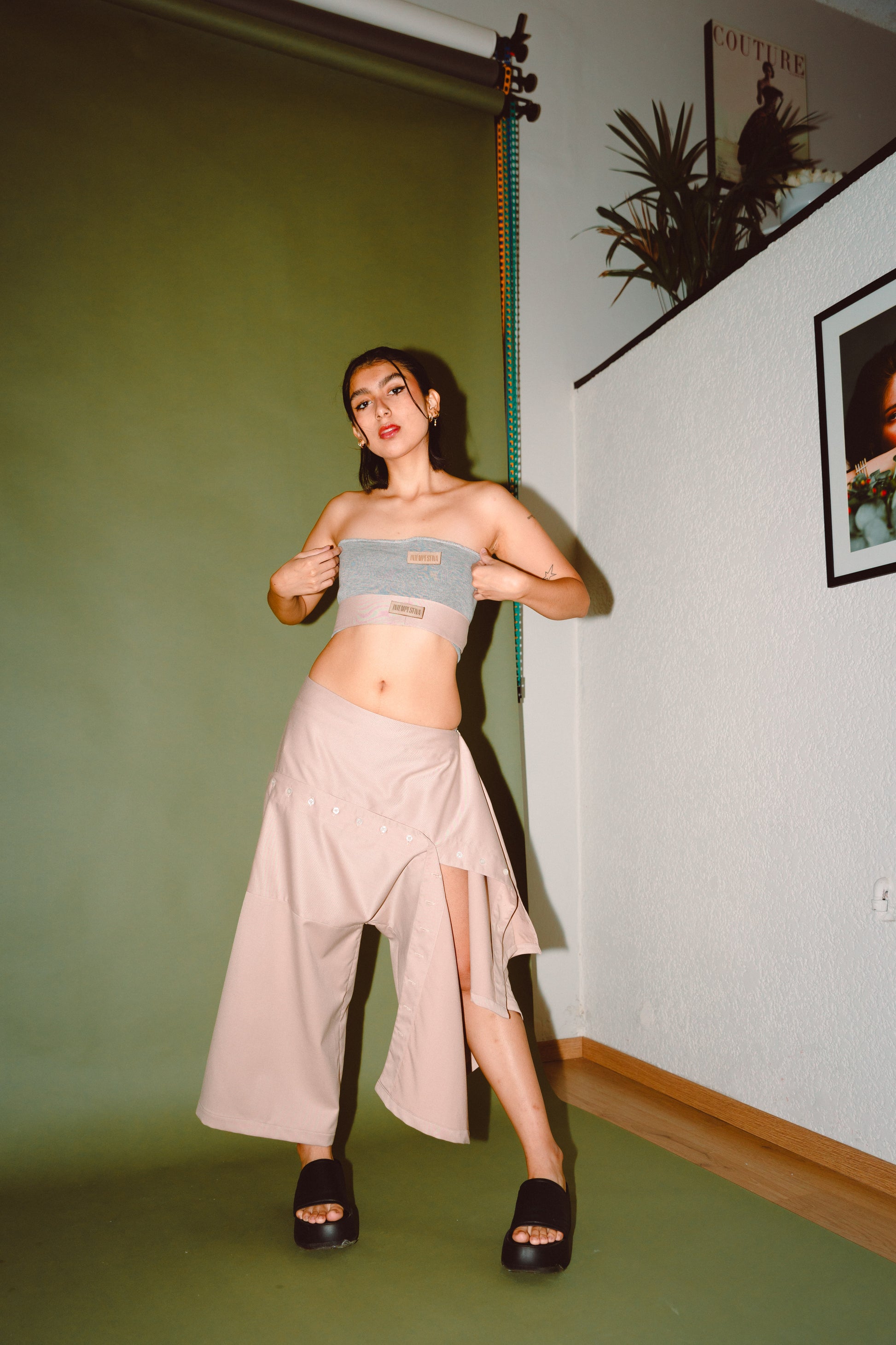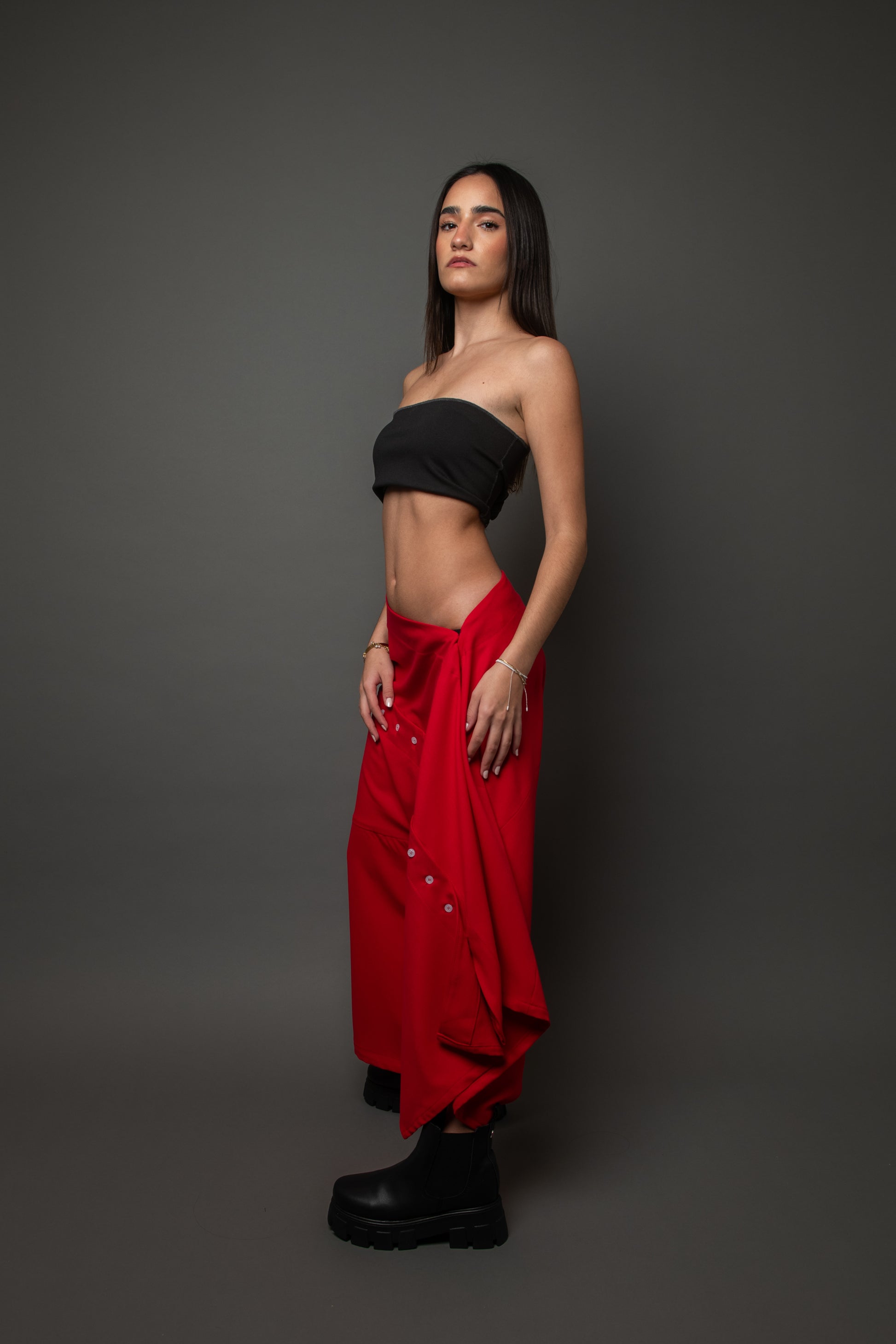 Lleva un zipper invisible en el costado y letillas de ojal y botón por el frente que al cerrarse completamente le otorga el look de pantalón.