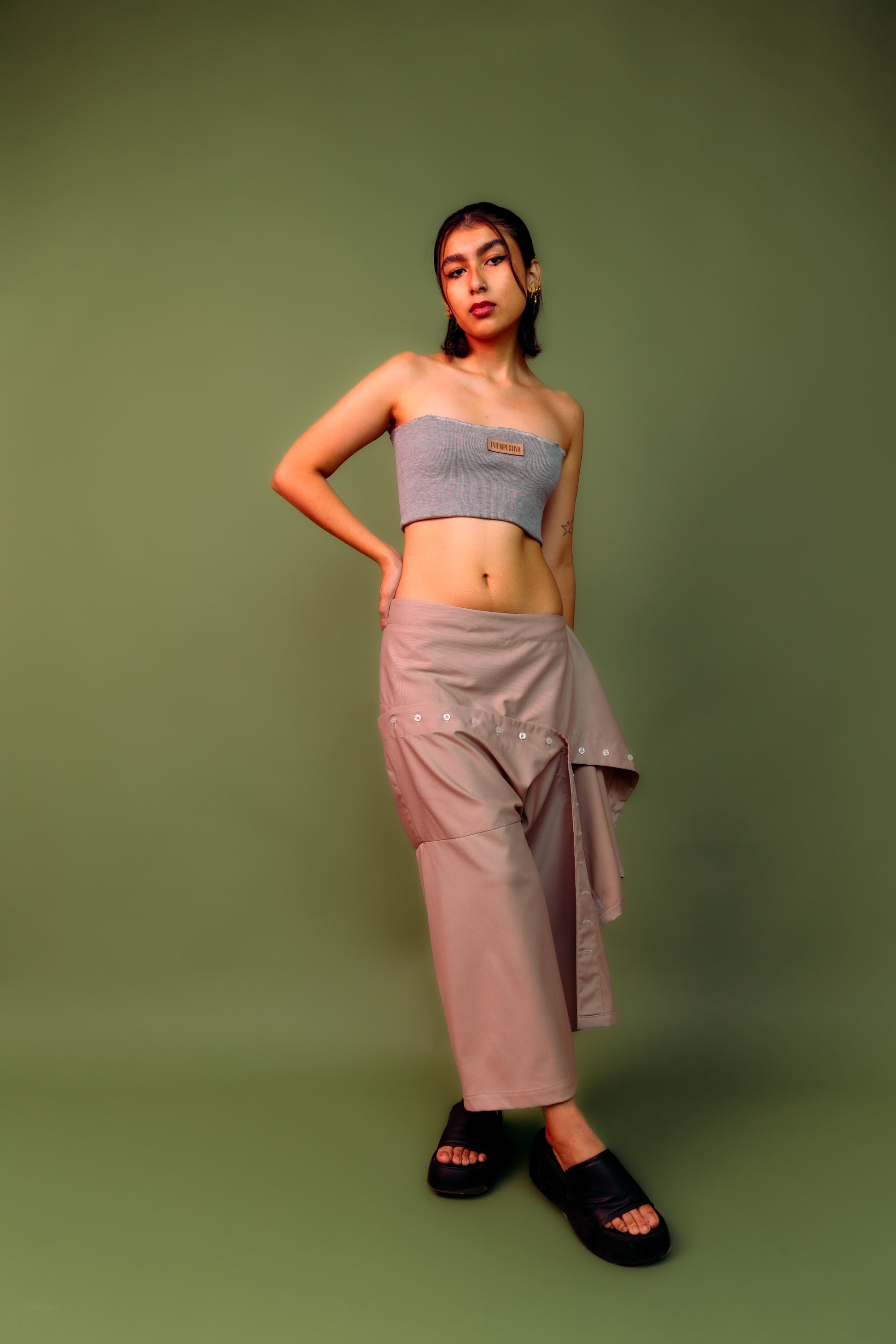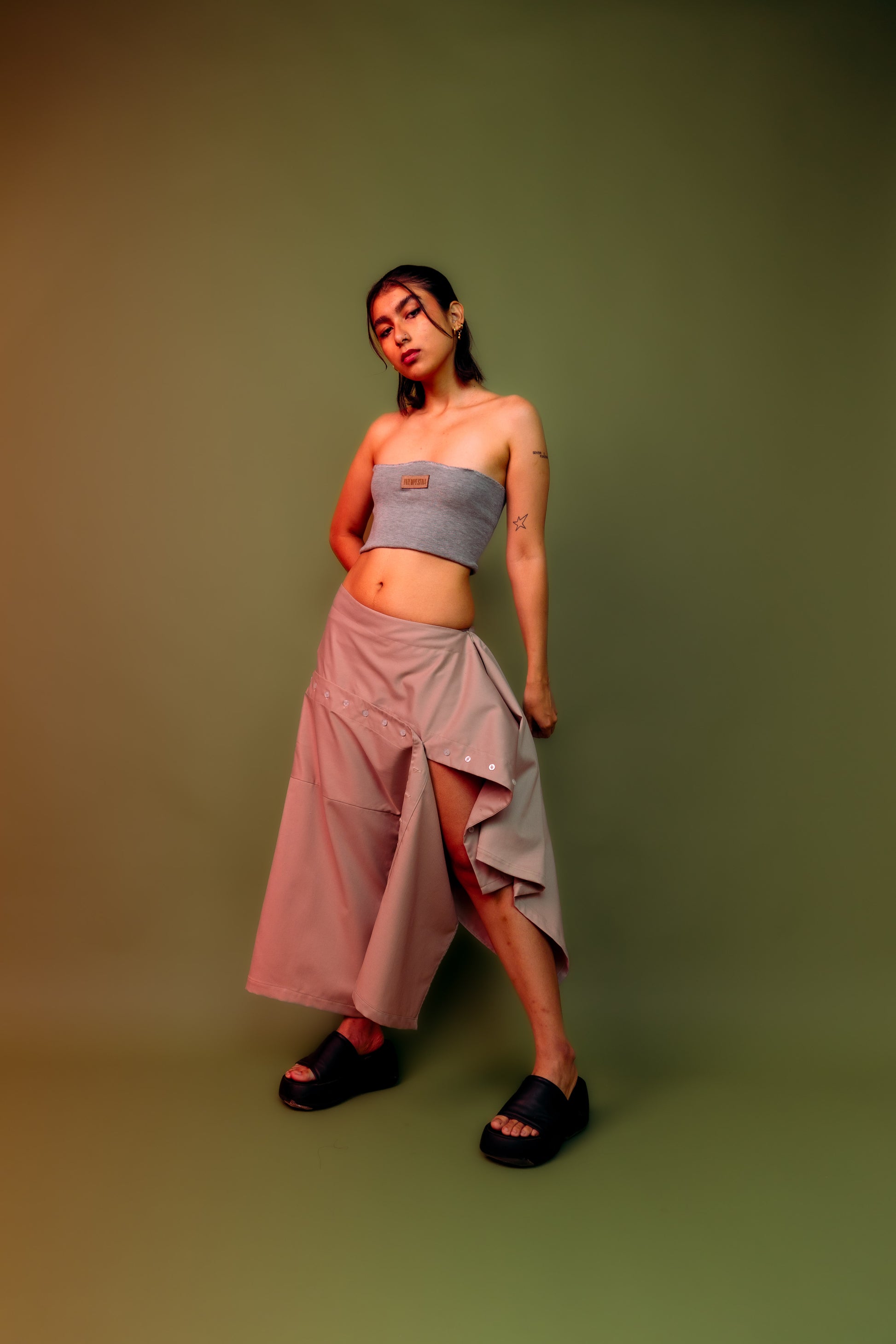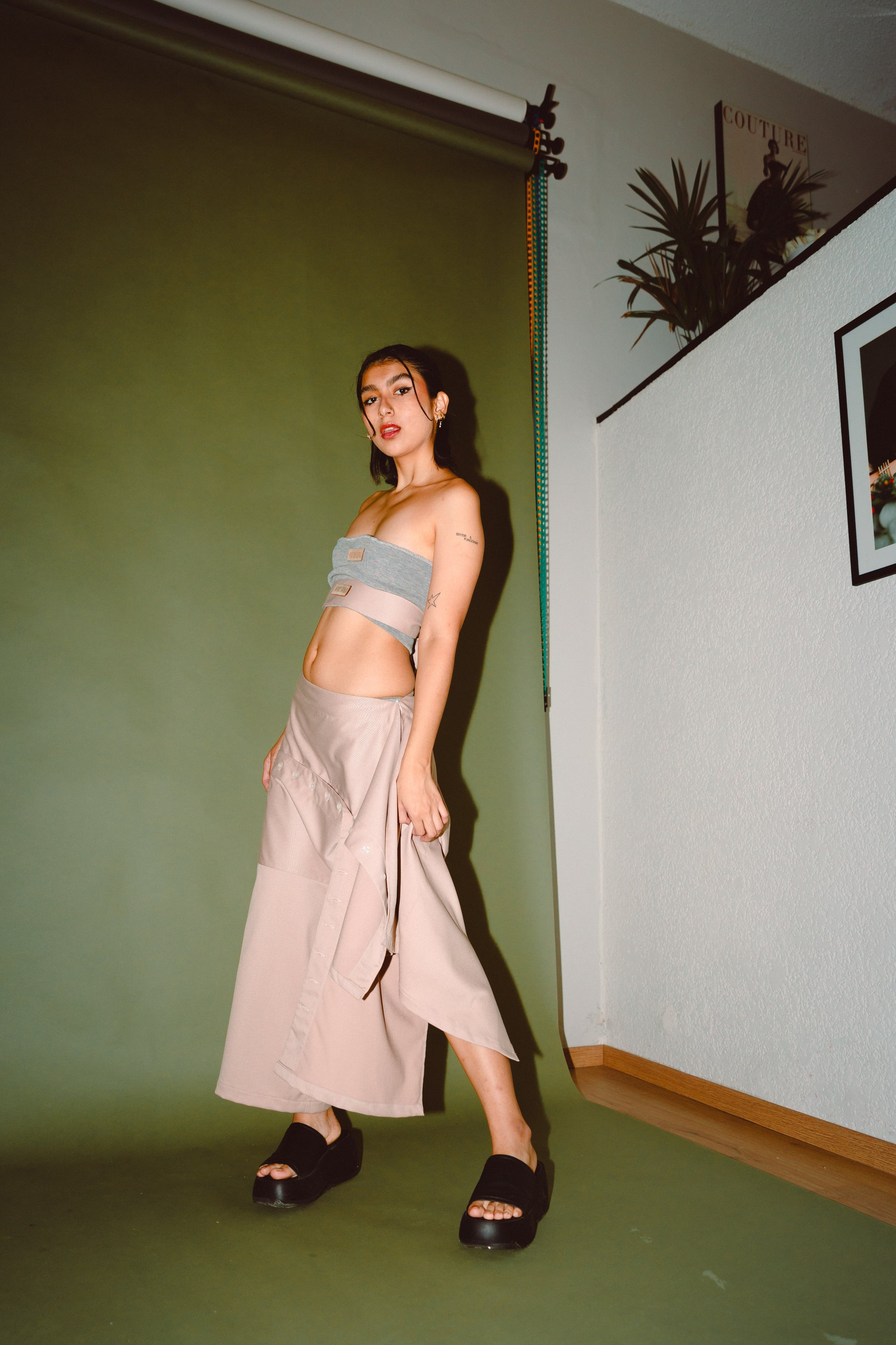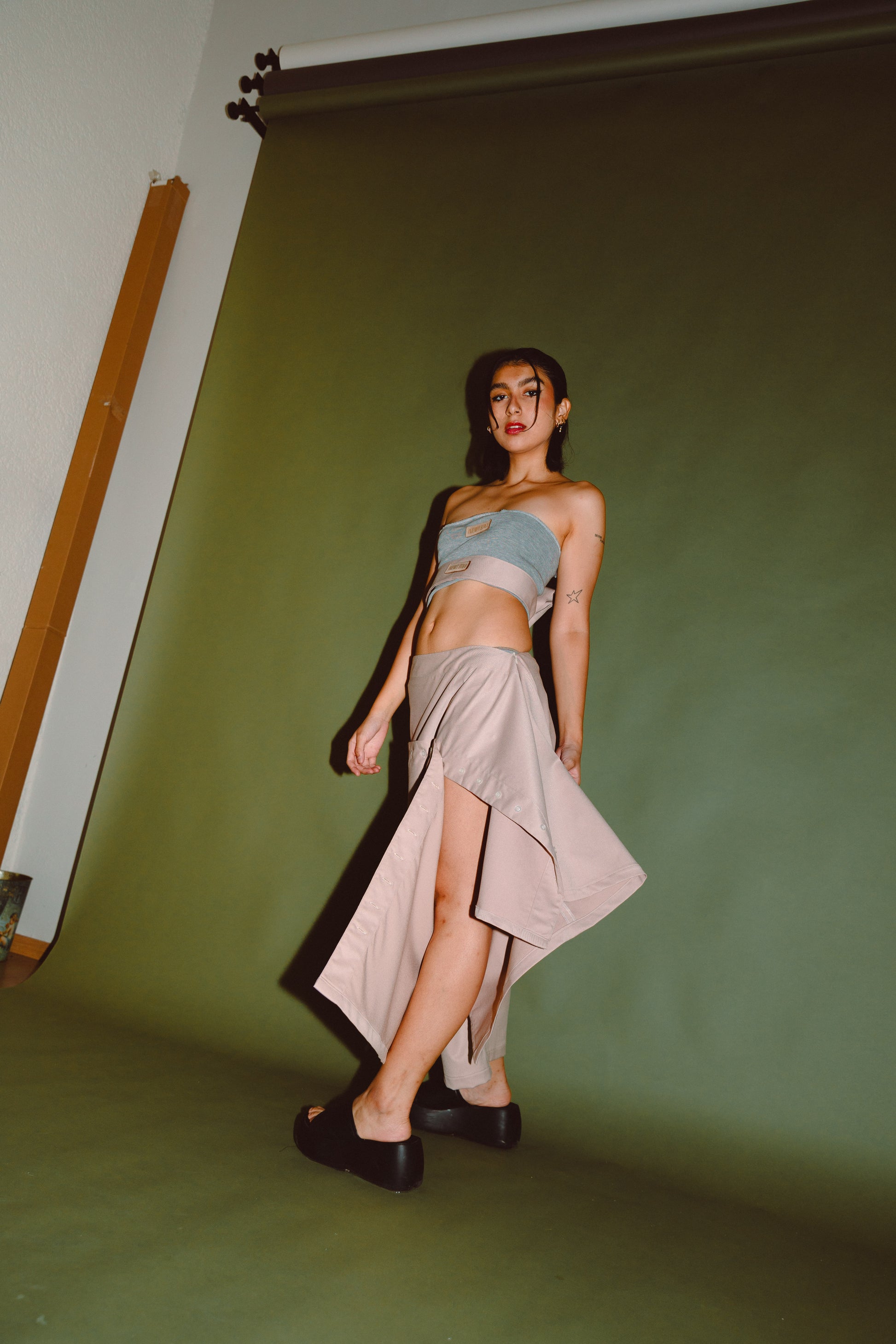 Lleva un zipper invisible en el costado y letillas de ojal y botón por el frente que al cerrarse completamente le otorga el look de pantalón.