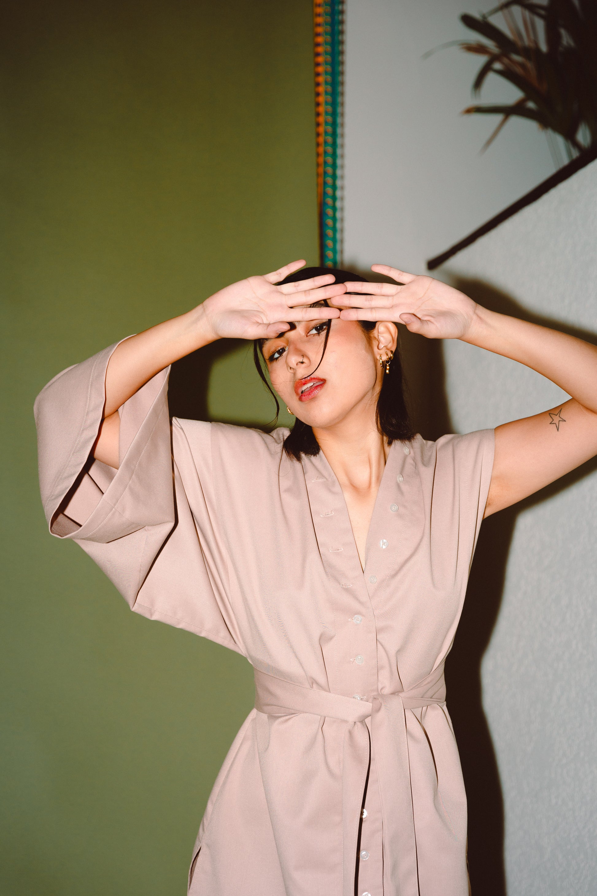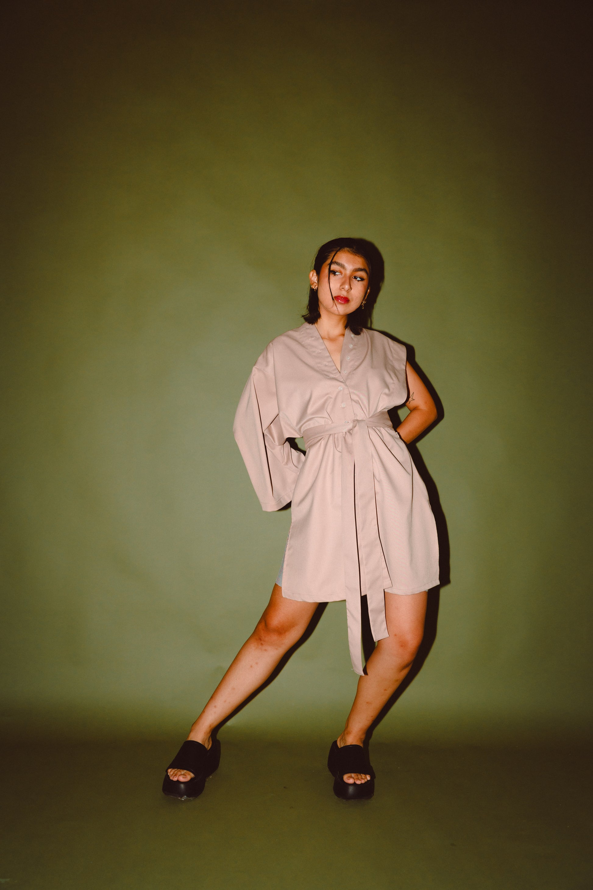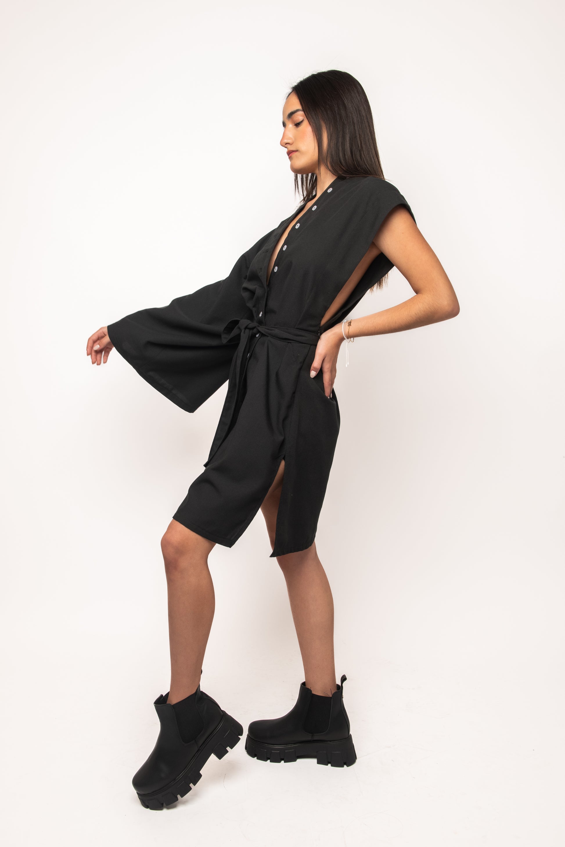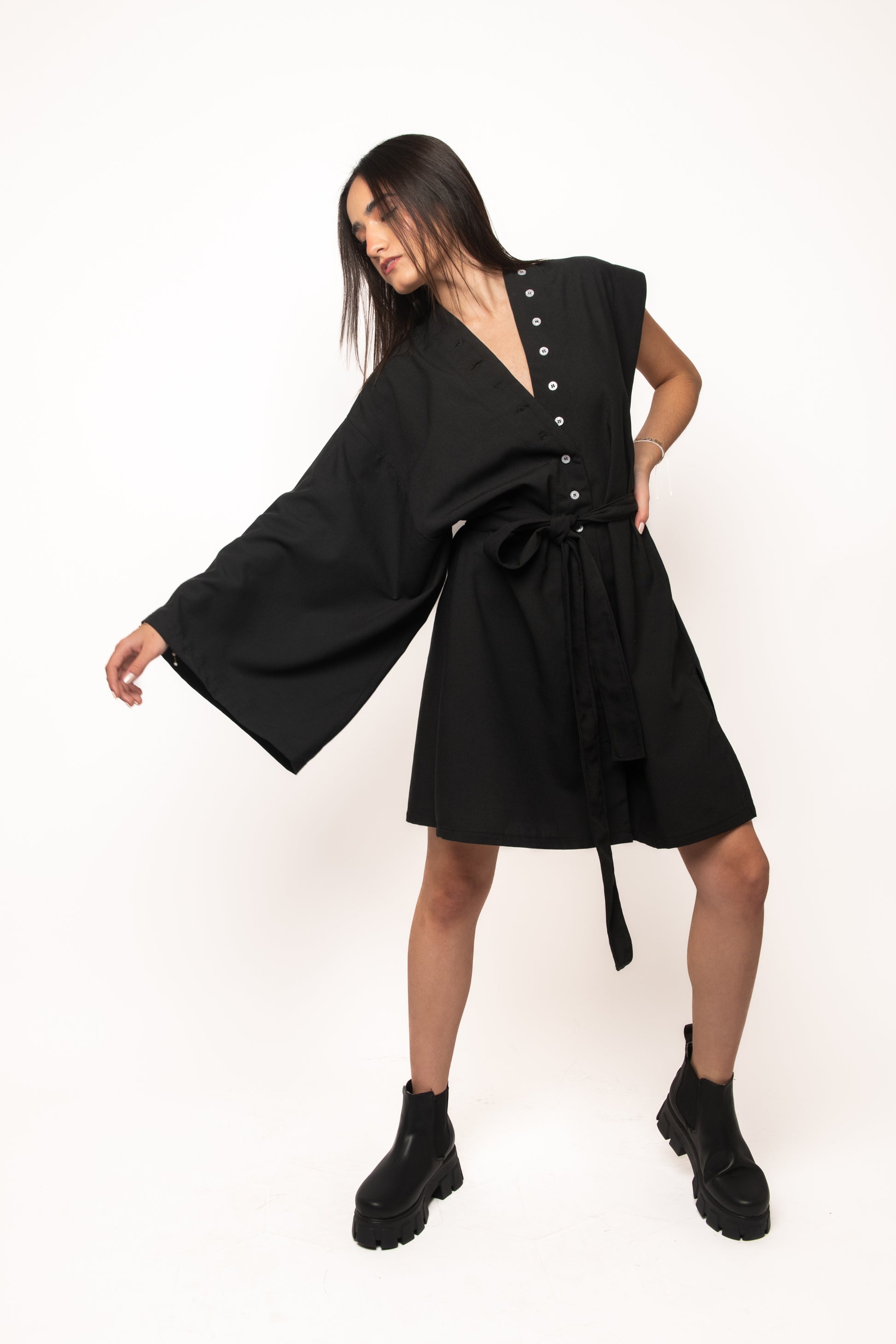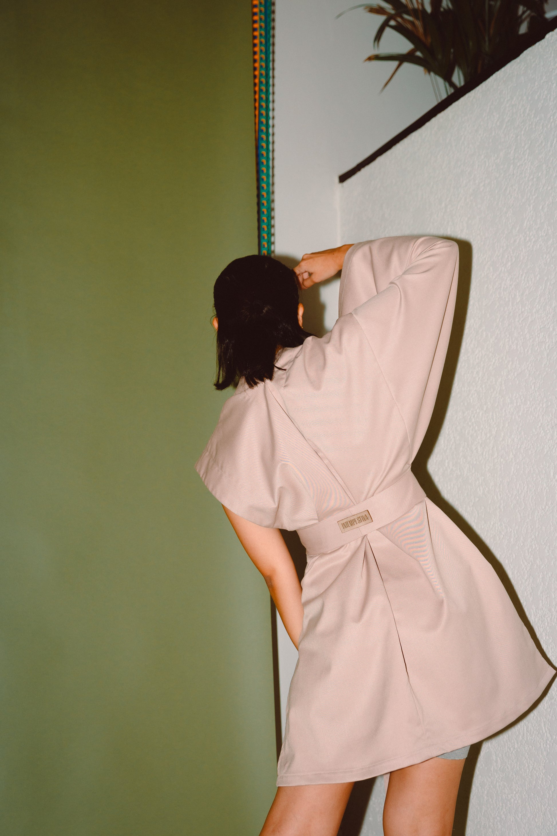 Fabricado en tela casimir con un ligero satín. Esta prenda está diseñada para utilizarse como vestido kimono y como pantalón.