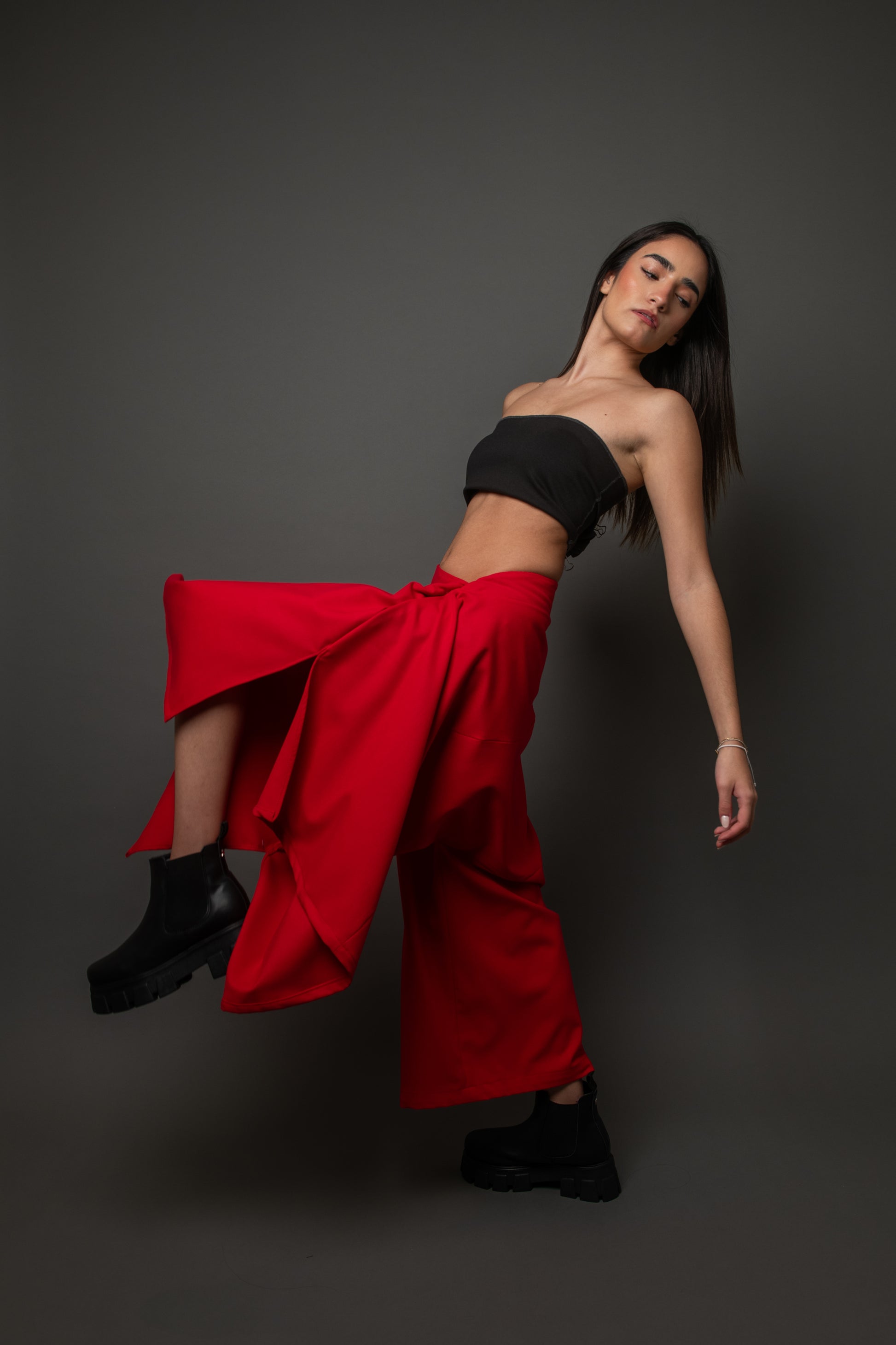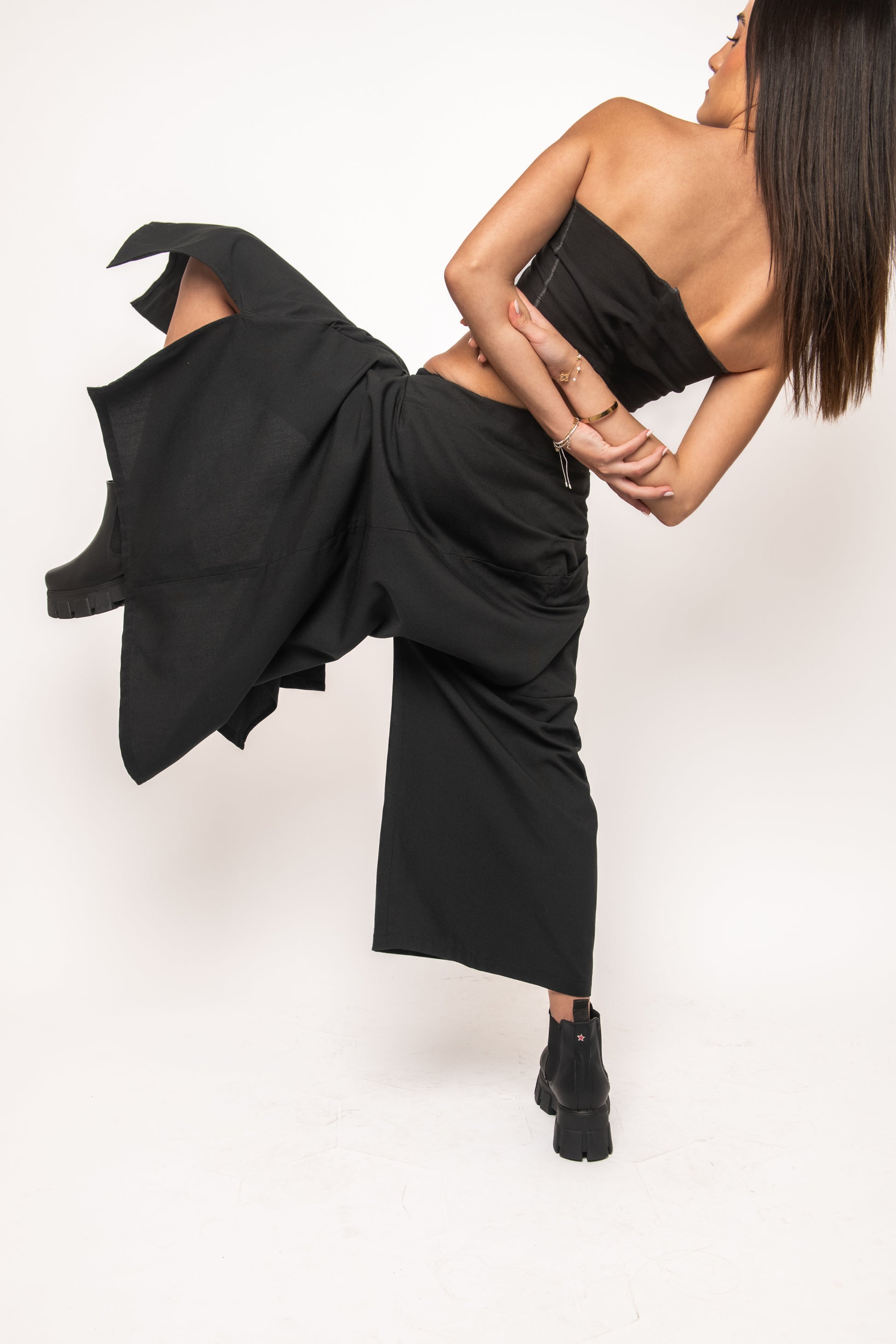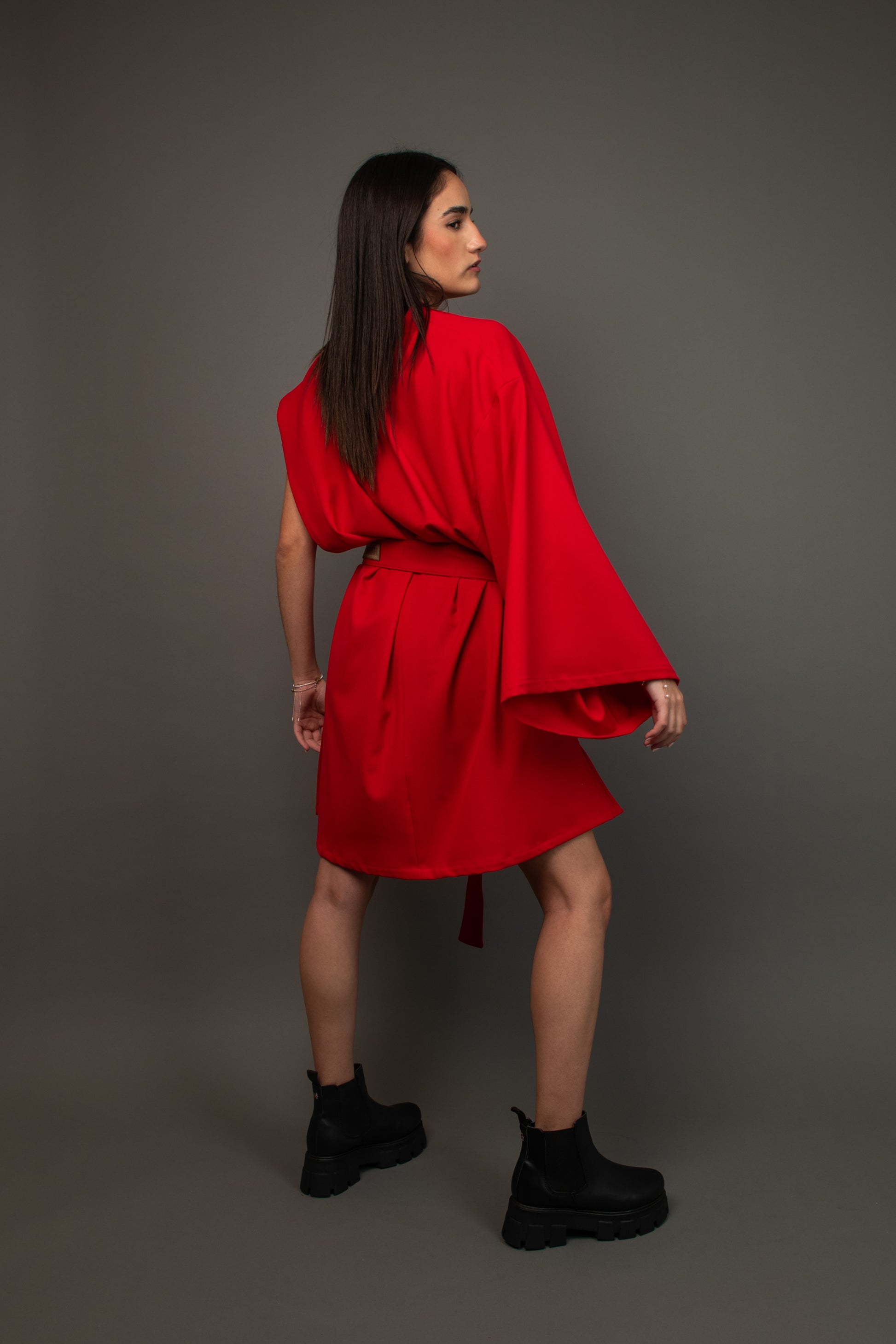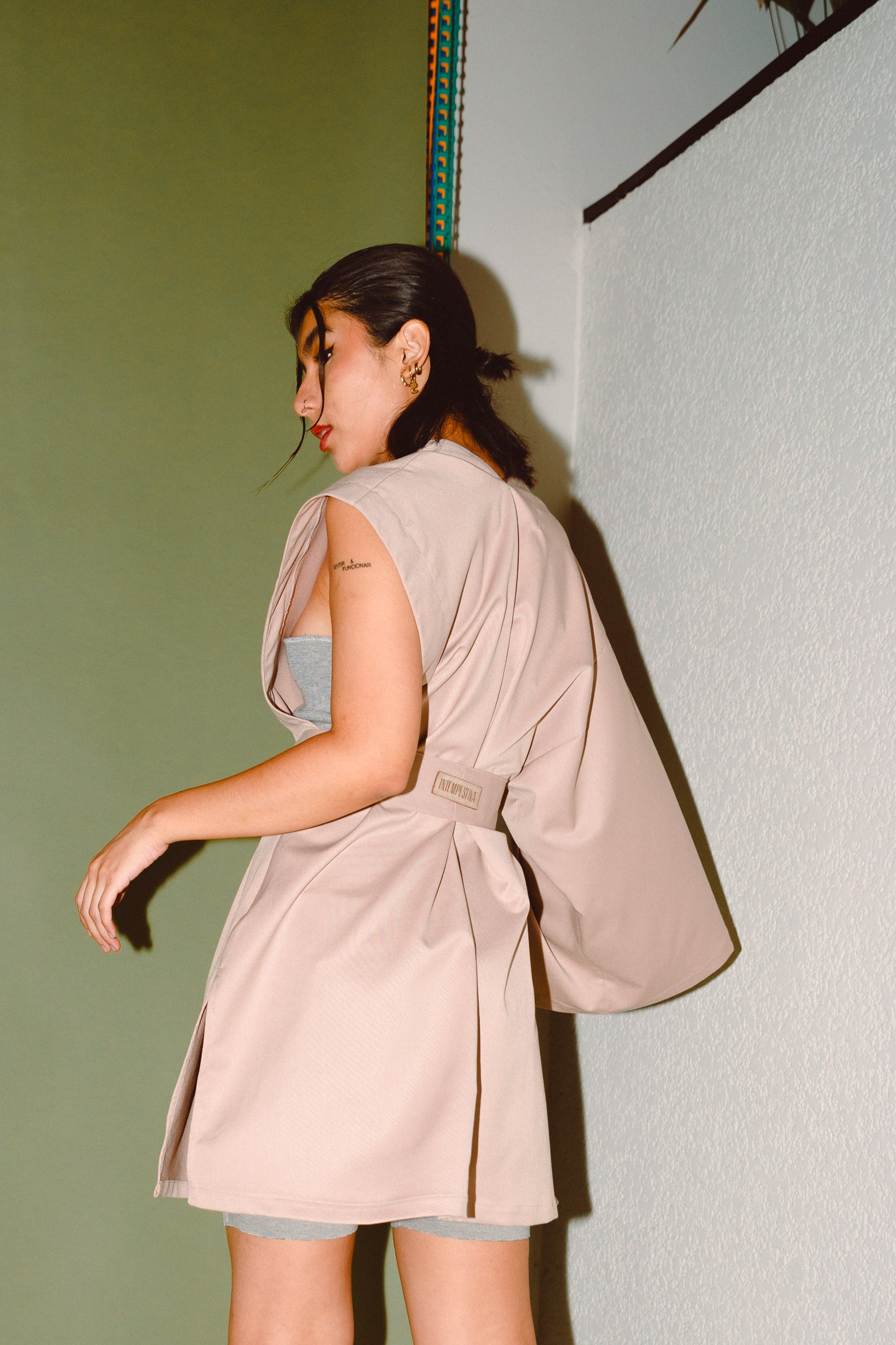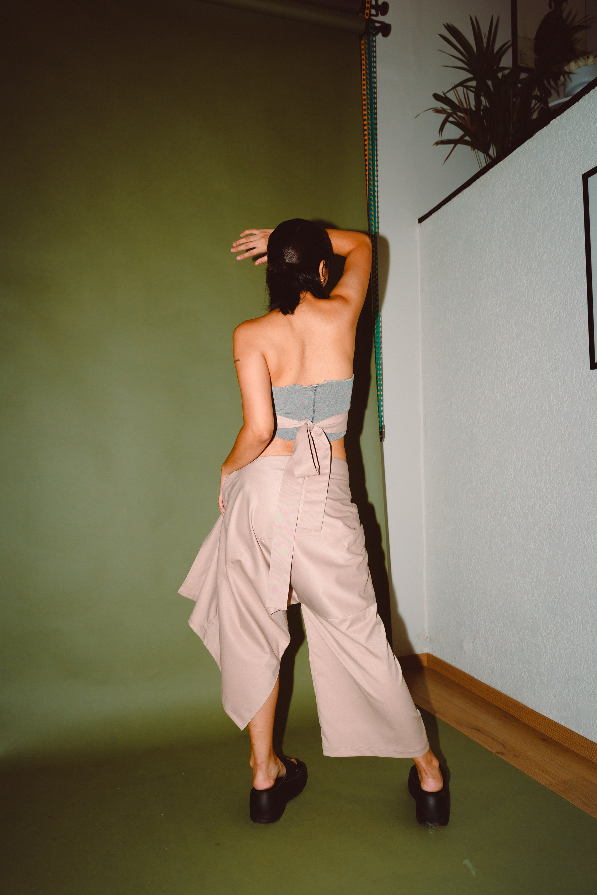 Fabricado en tela casimir con un ligero satín. Esta prenda está diseñada para utilizarse como vestido kimono y como pantalón.