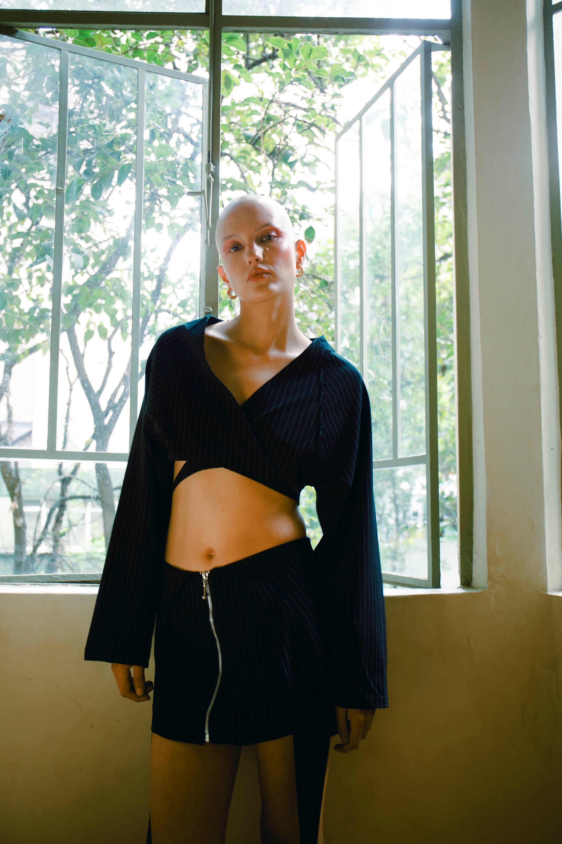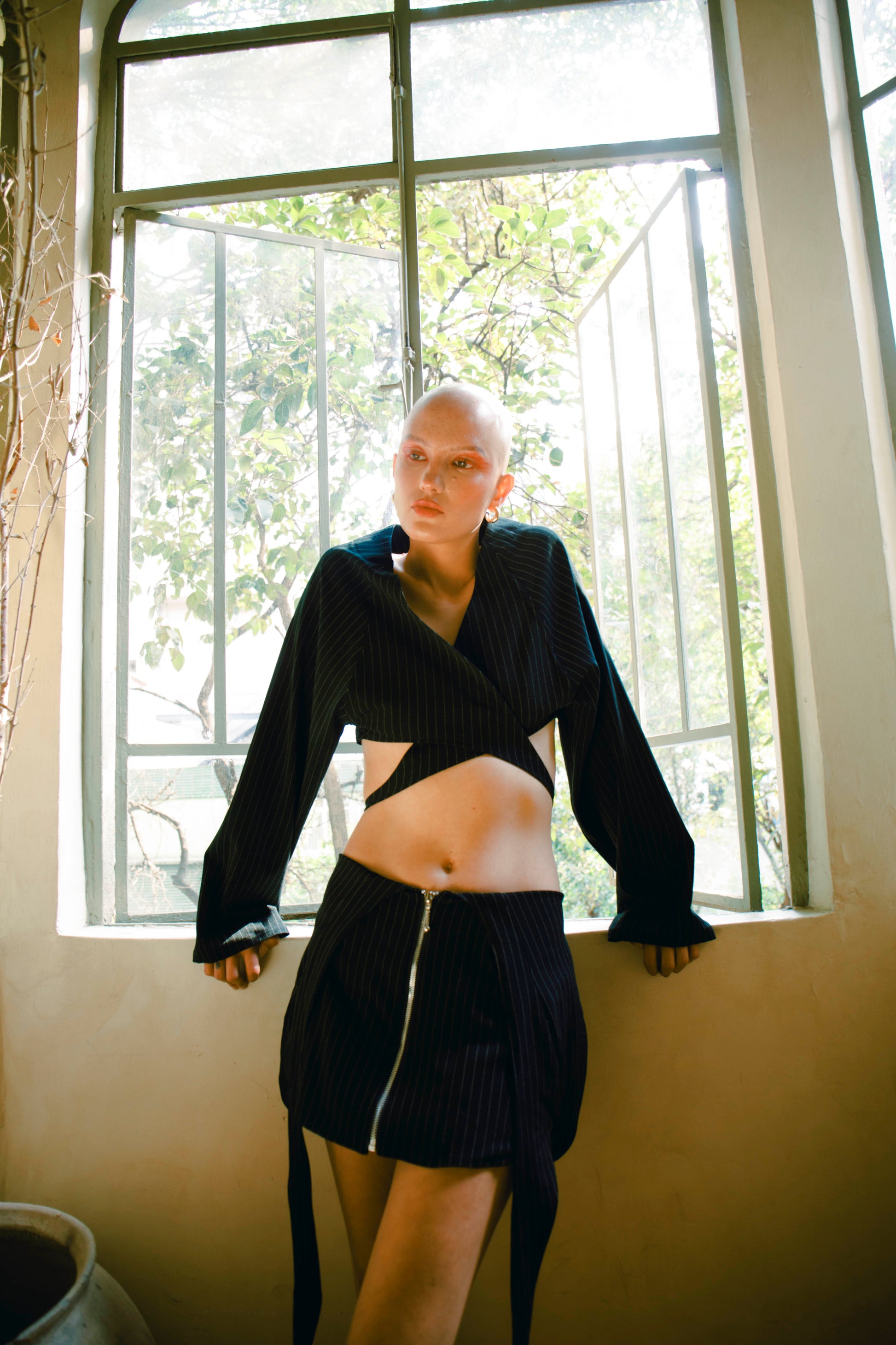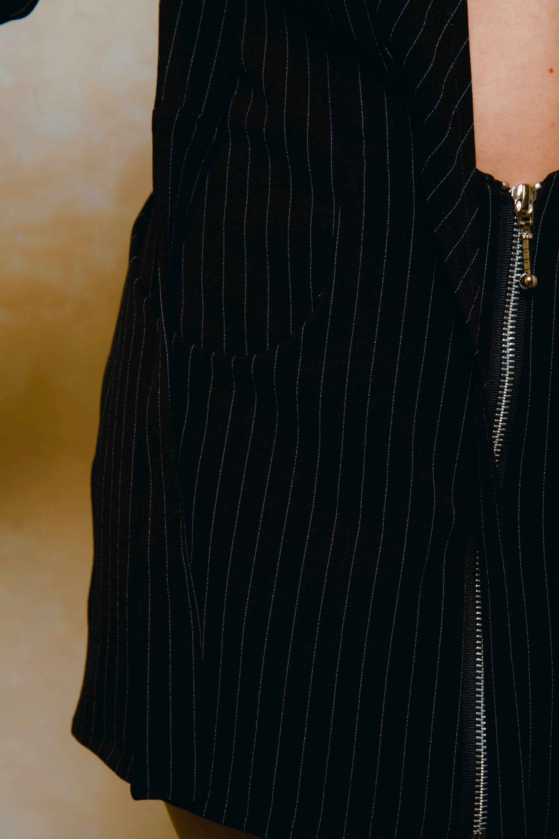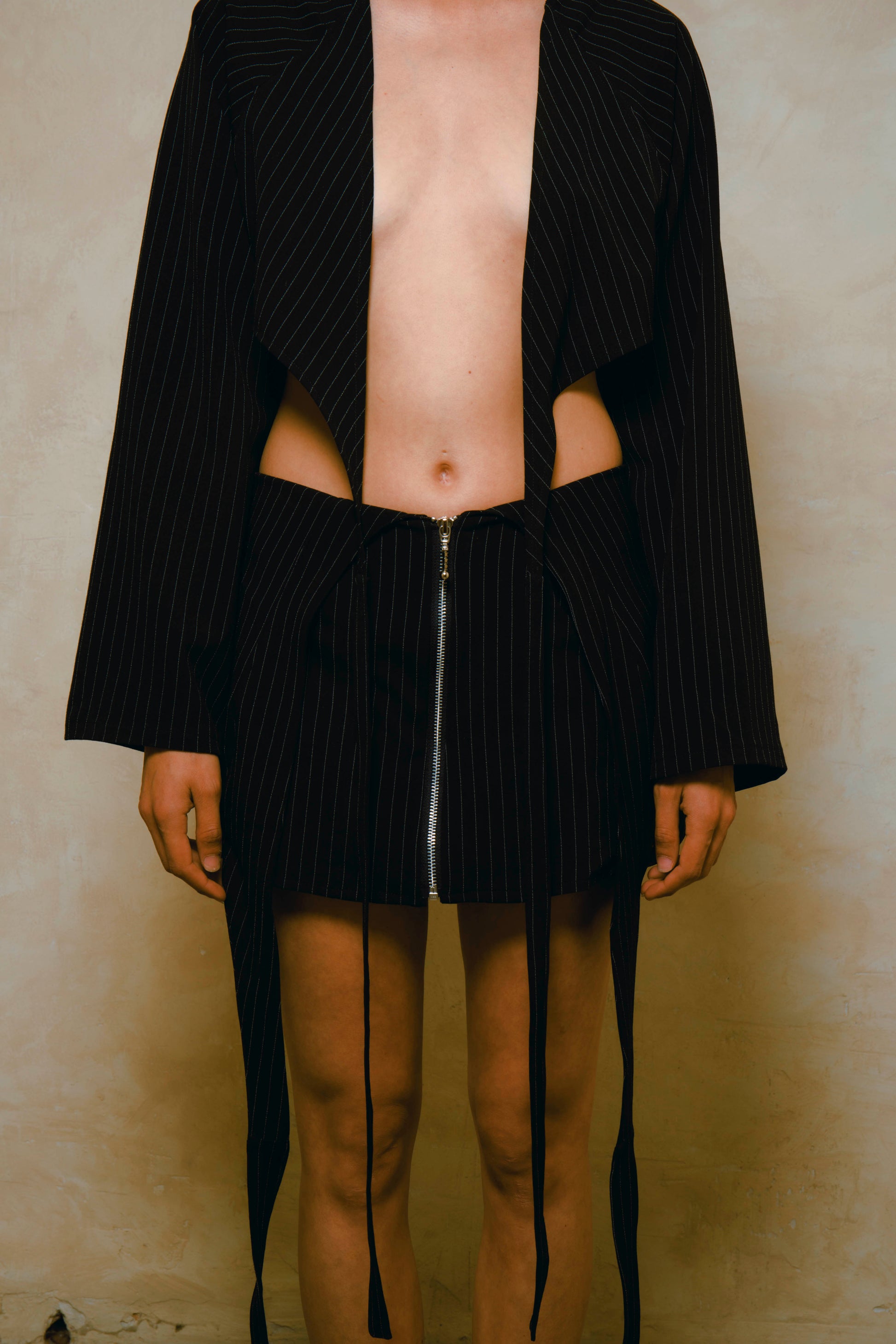 This versatile garment mimics the silhouette of a traditional blazer, but is actually two separate pieces: a bullfighter jacket that covers the arms and chest, and a structured dress.