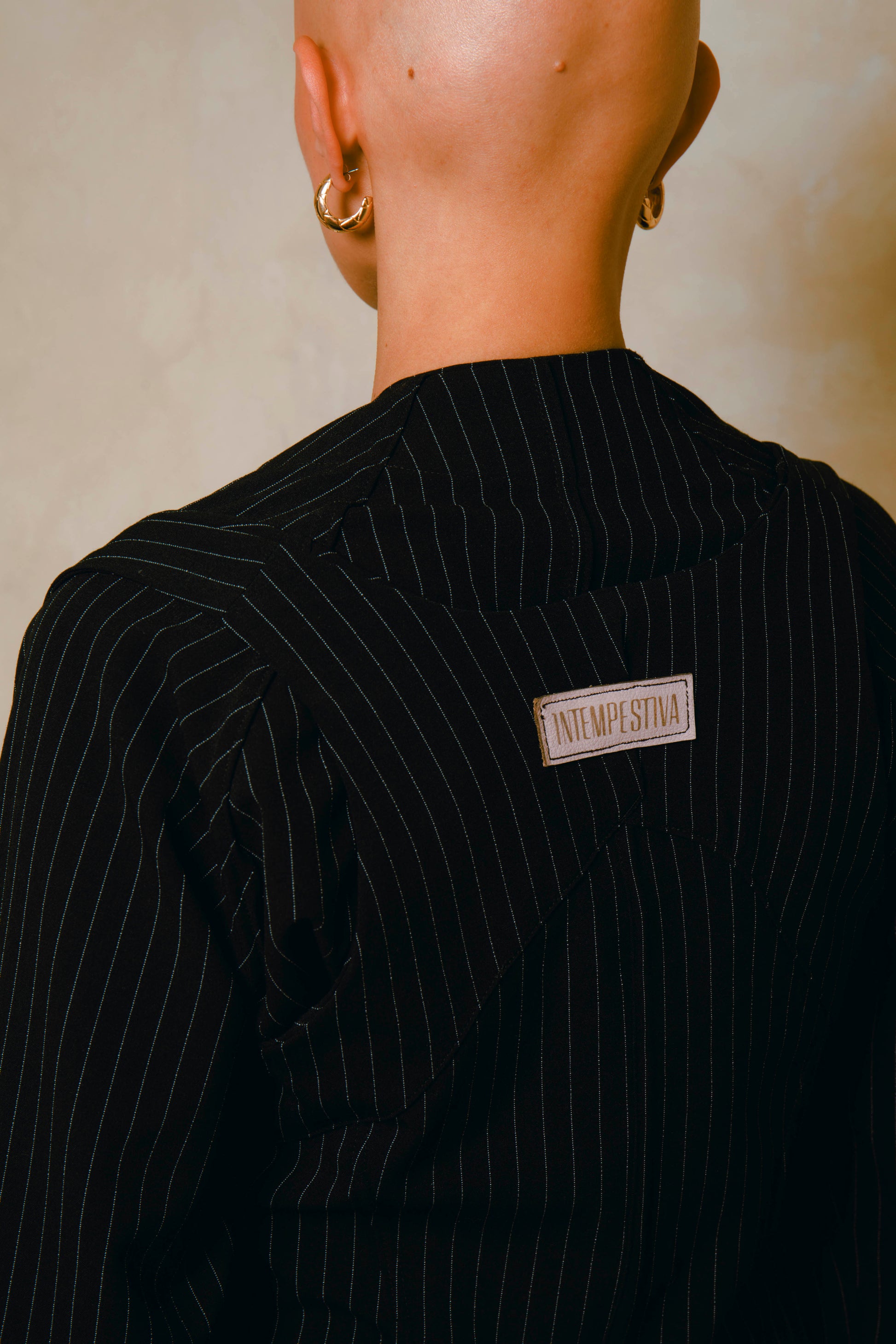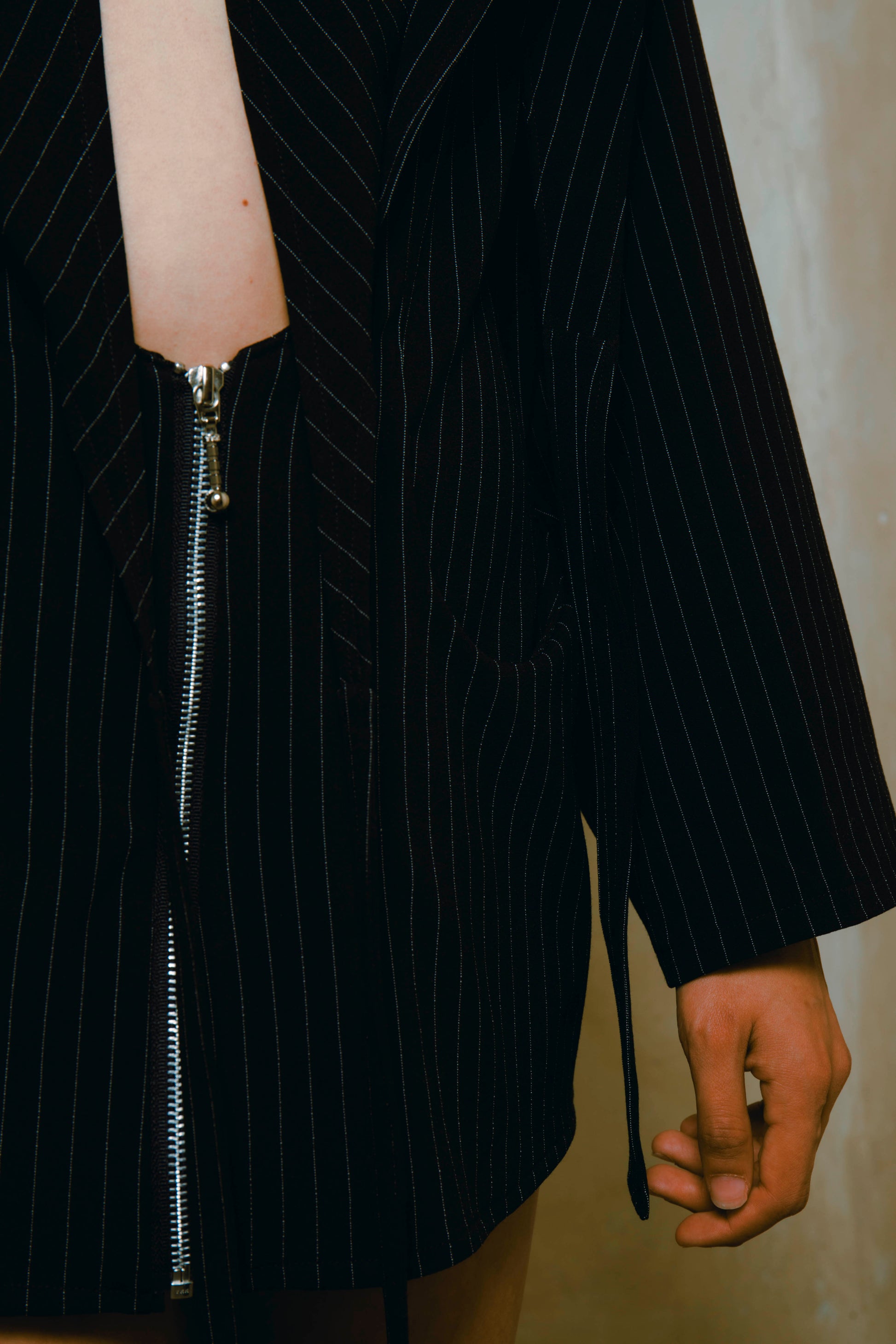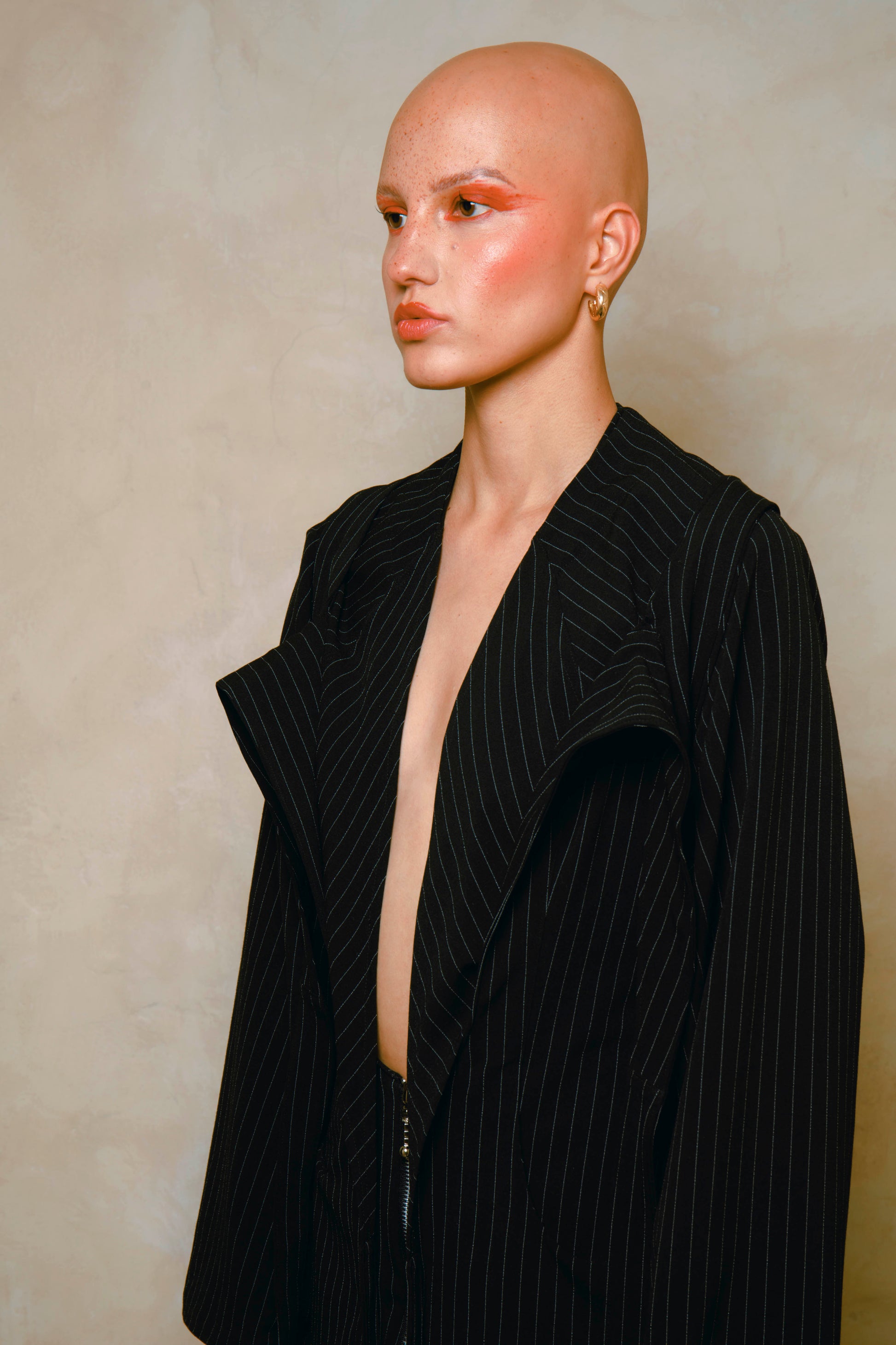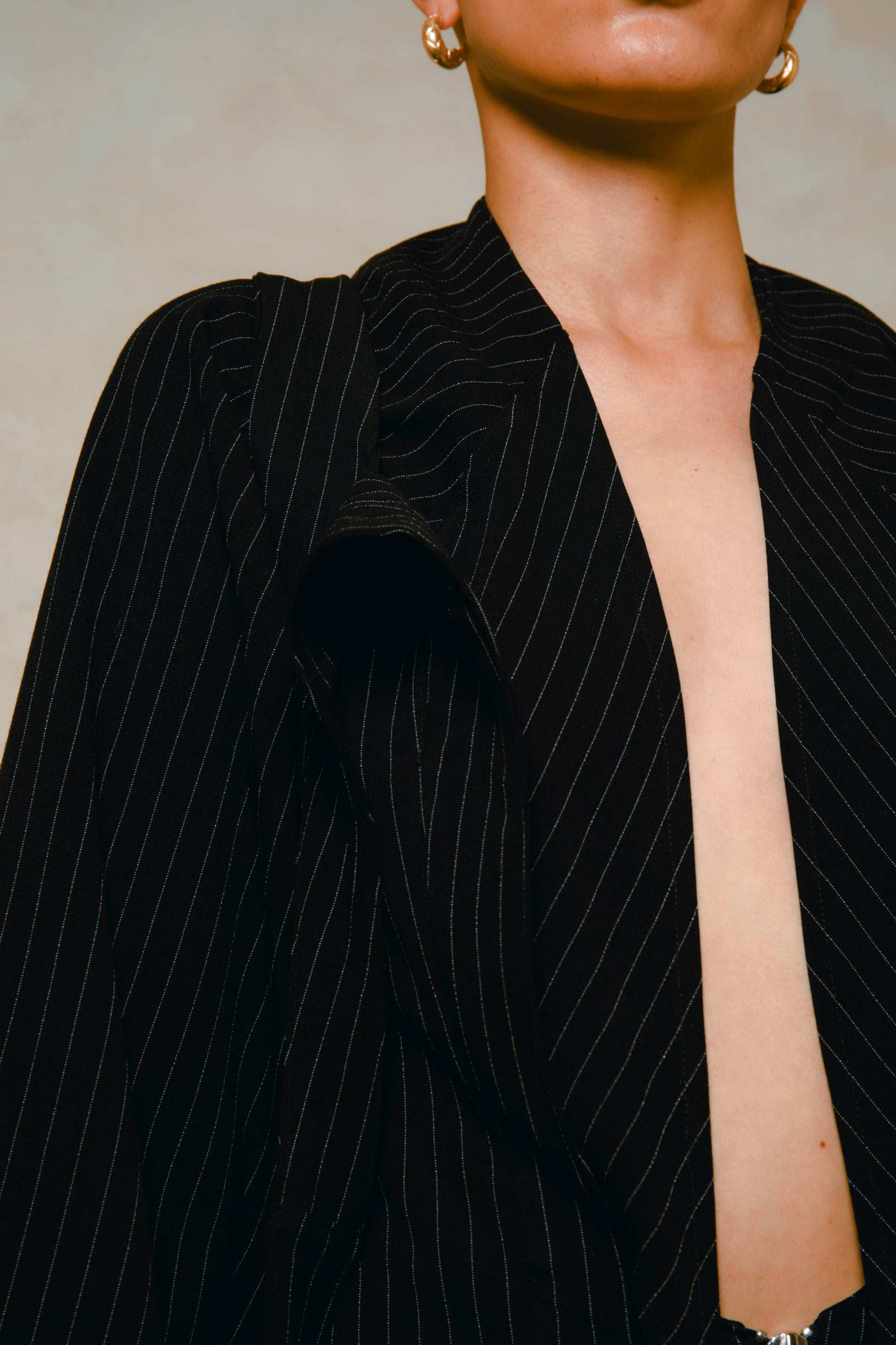 The Modular Blazer/Dress features an adjustable neckline that can be arranged in a criss-cross design, draping elegantly over the chest and secured at the back of the neck.