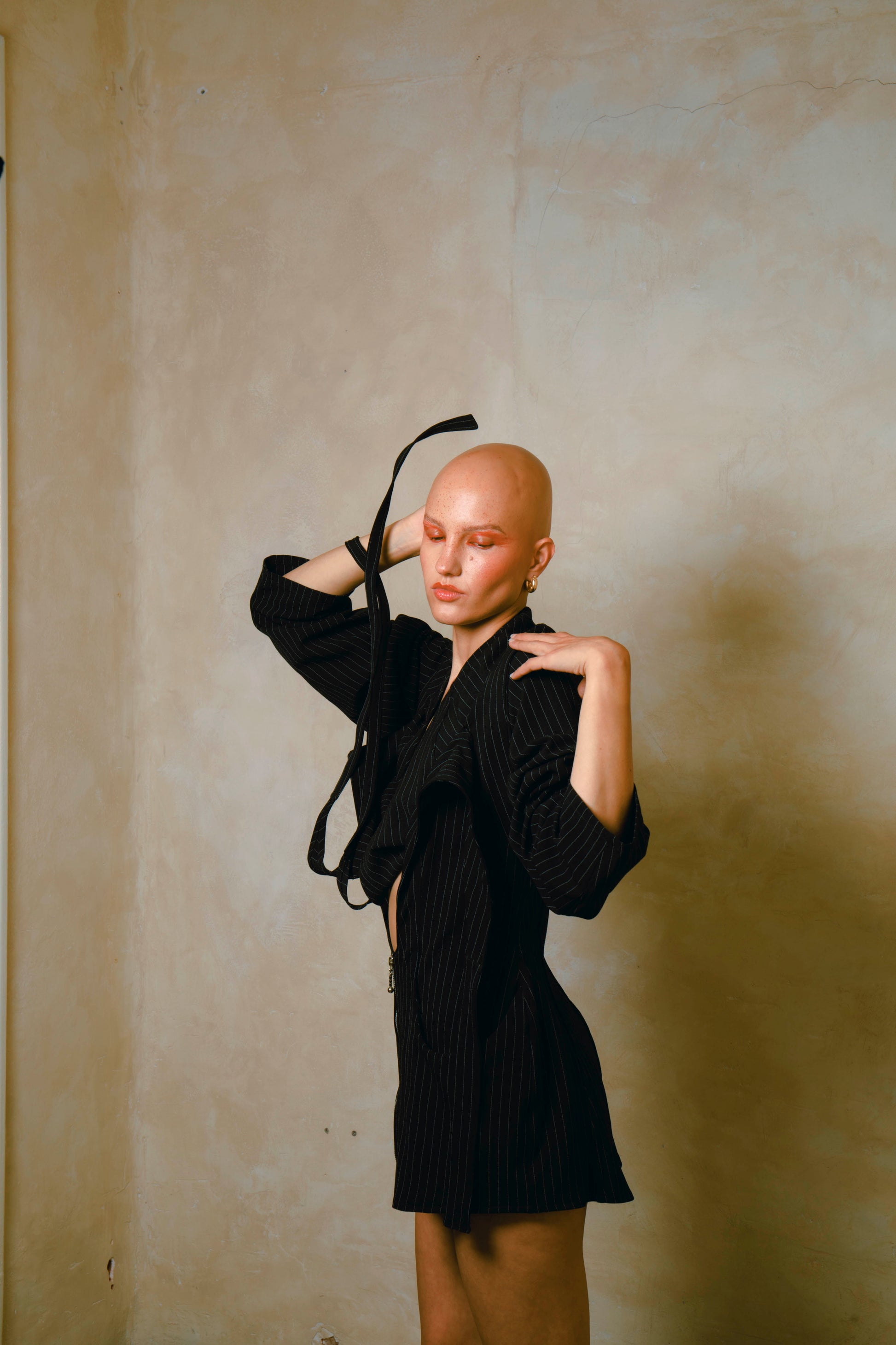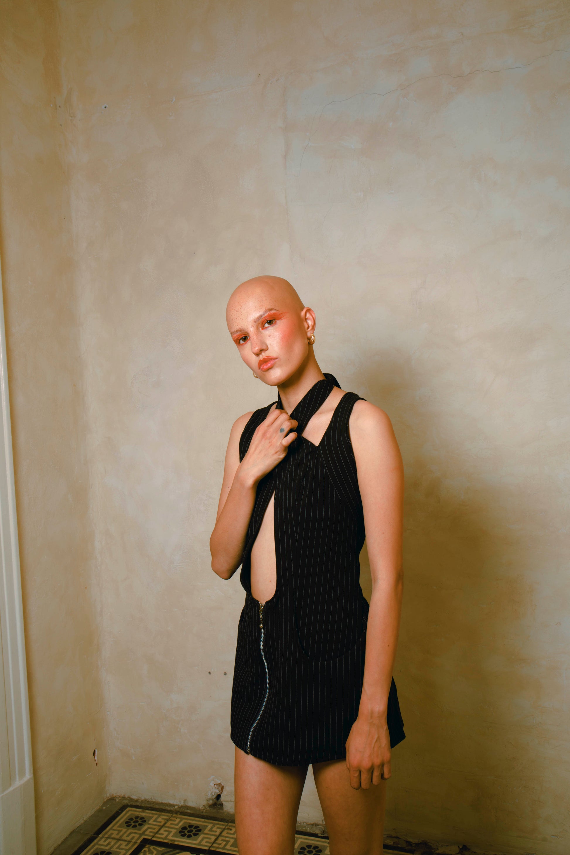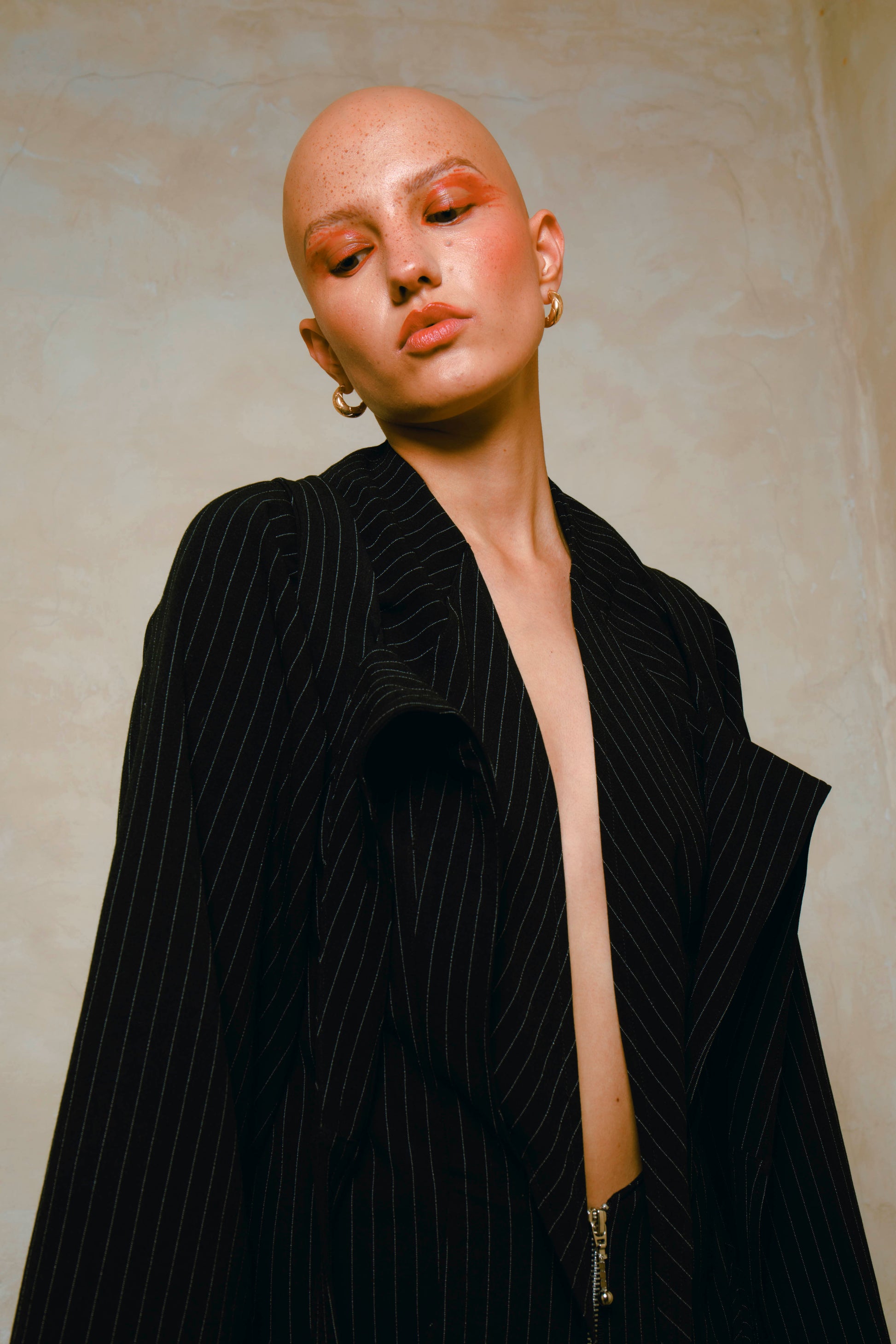The Modular Blazer/Dress features an adjustable neckline that can be arranged in a criss-cross design, draping elegantly over the chest and secured at the back of the neck.
