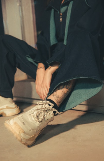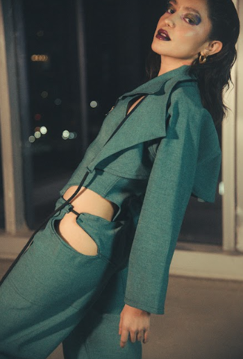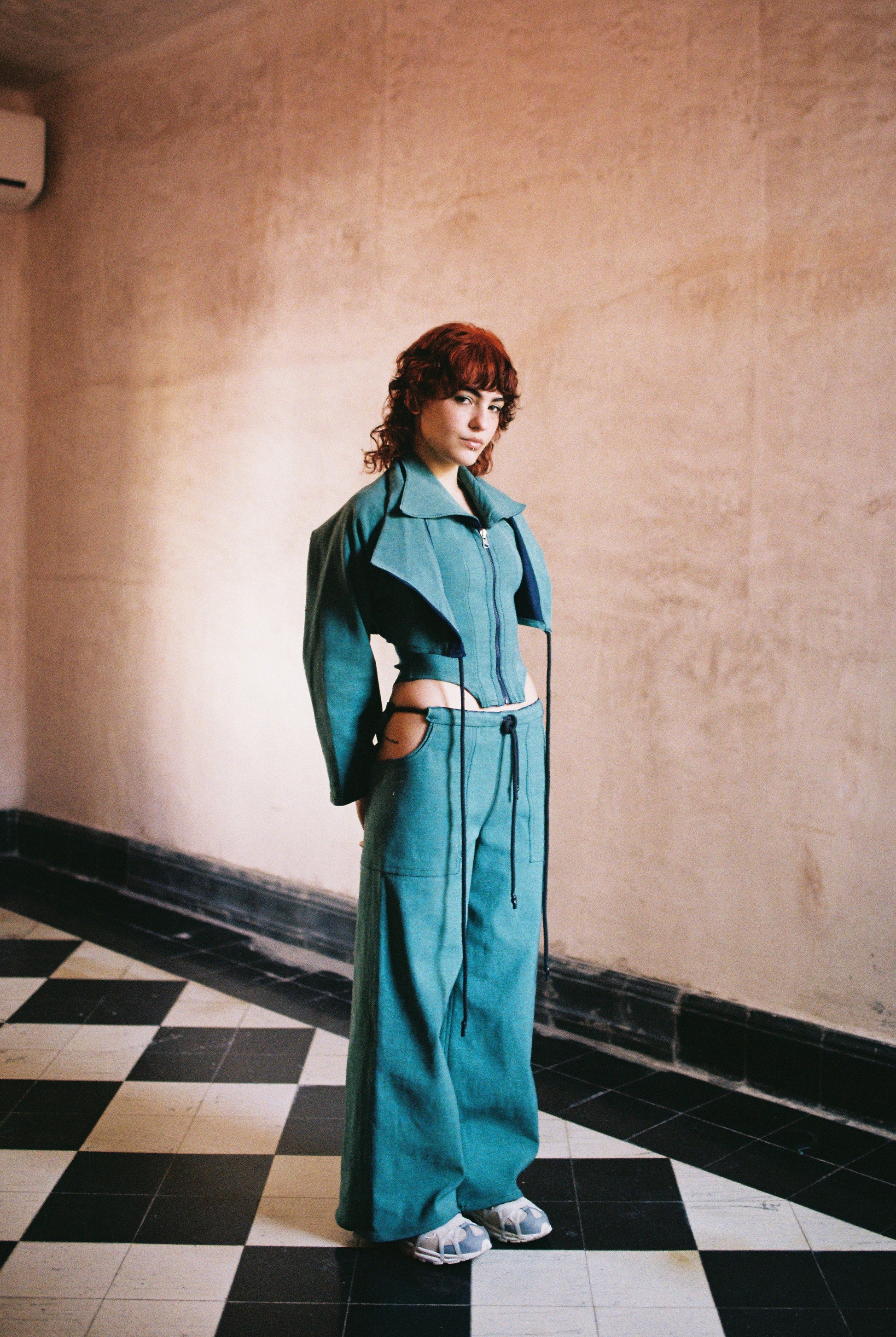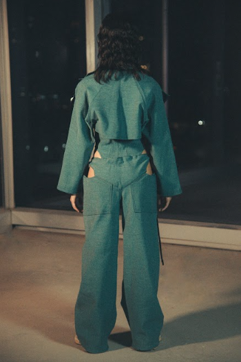 Es fabricado en una tela doble vista que por un lado es denim índigo y del otro lado es verde campo de golf. Por lo que se utilizó solo 1 capa de tela para fabricarlo, reduciendo el consumo de recursos textiles por la mitad.