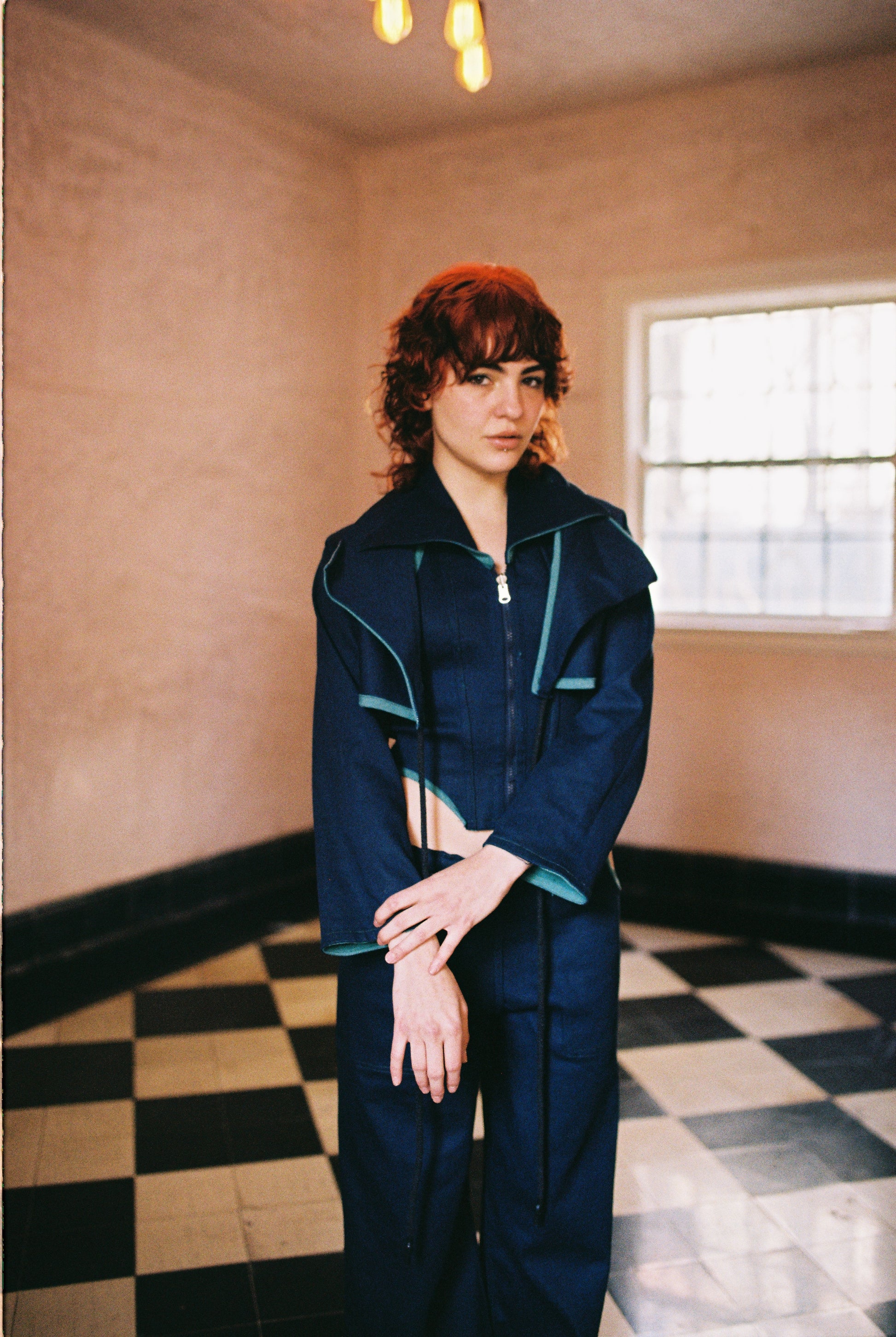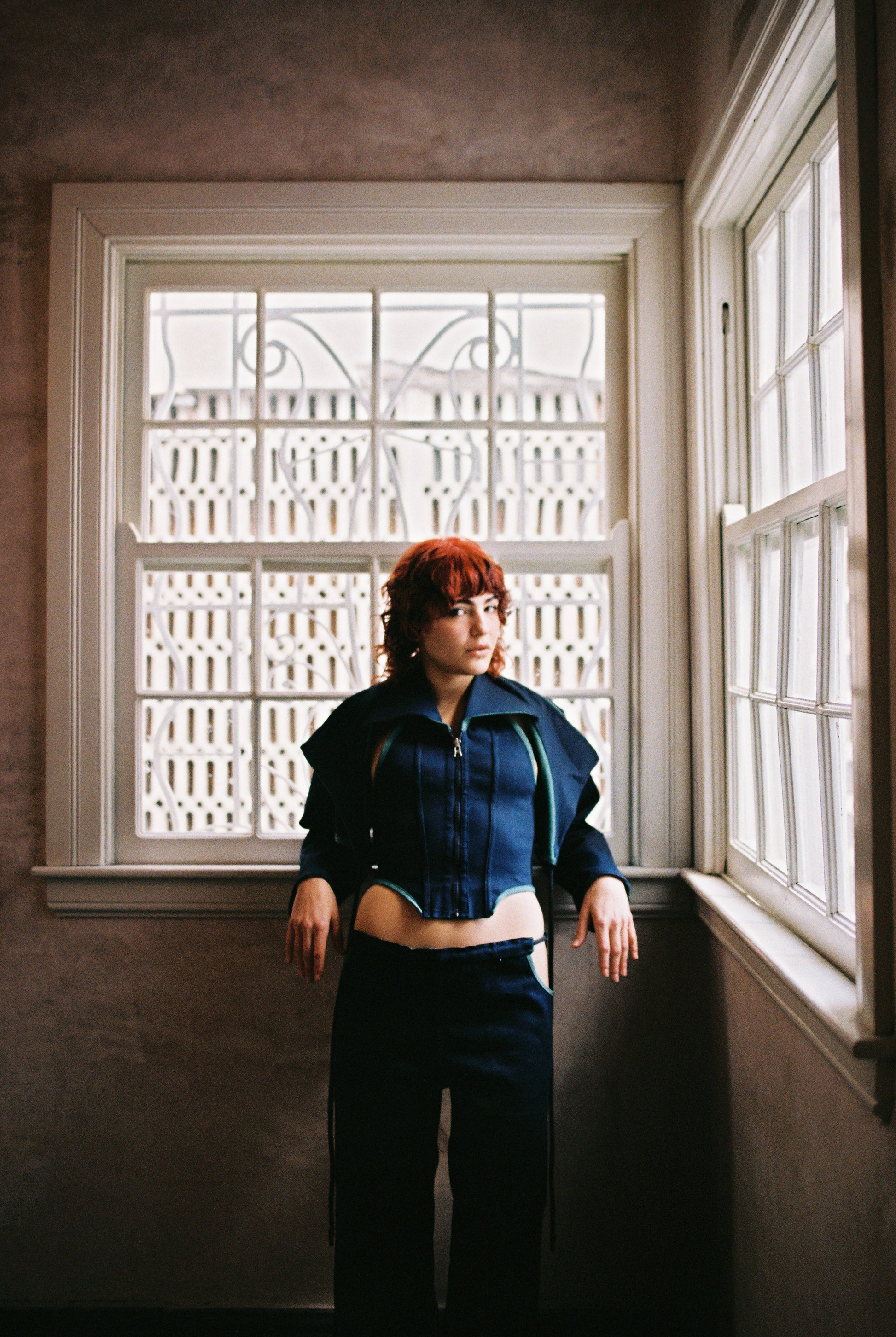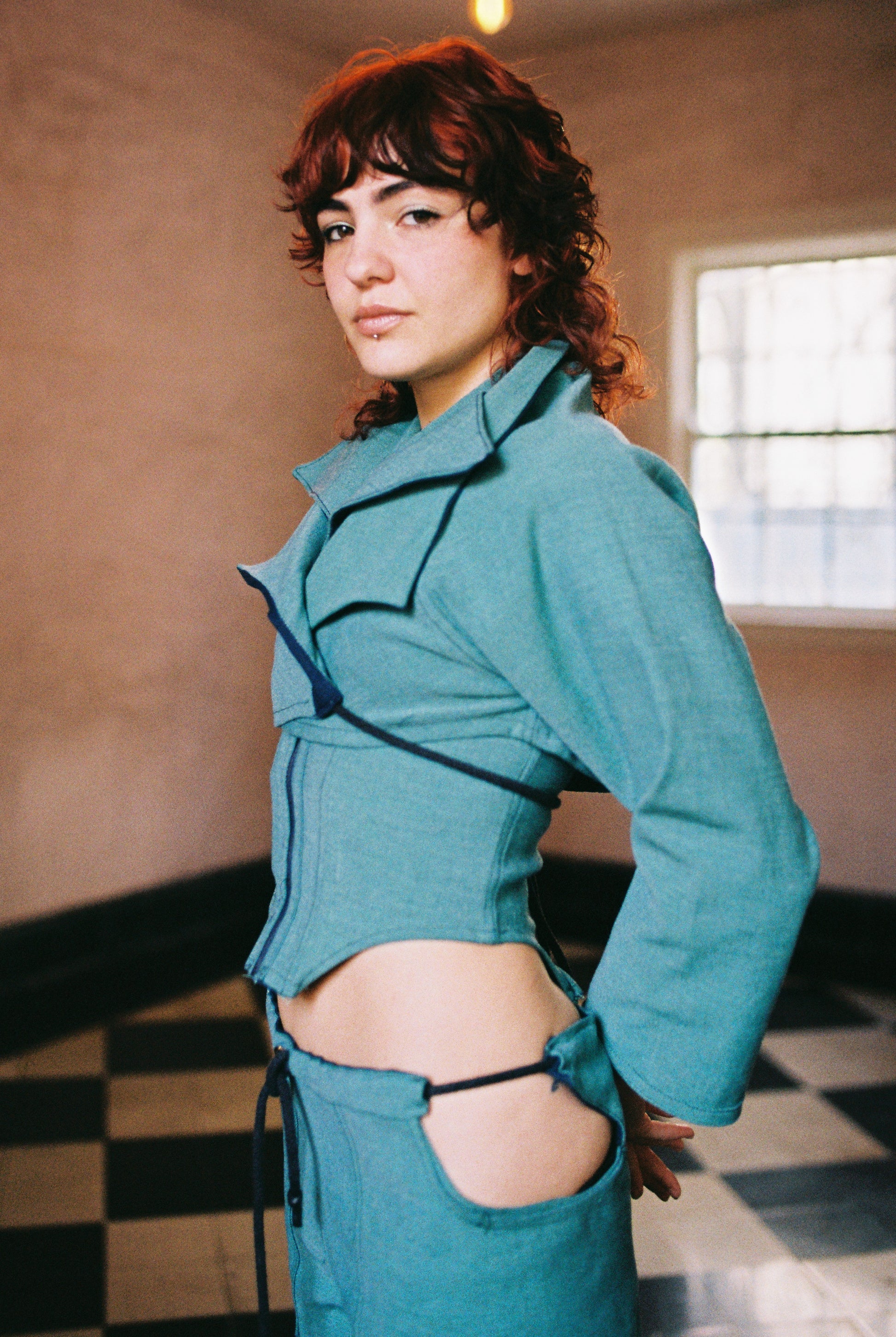 Esta torera o blazer corto esta fabricado en tela mezclilla doble vista, es de un lado color índigo y del otro es verde campo de golf. Lleva dos jaretas que cuelgan para amarrarse.