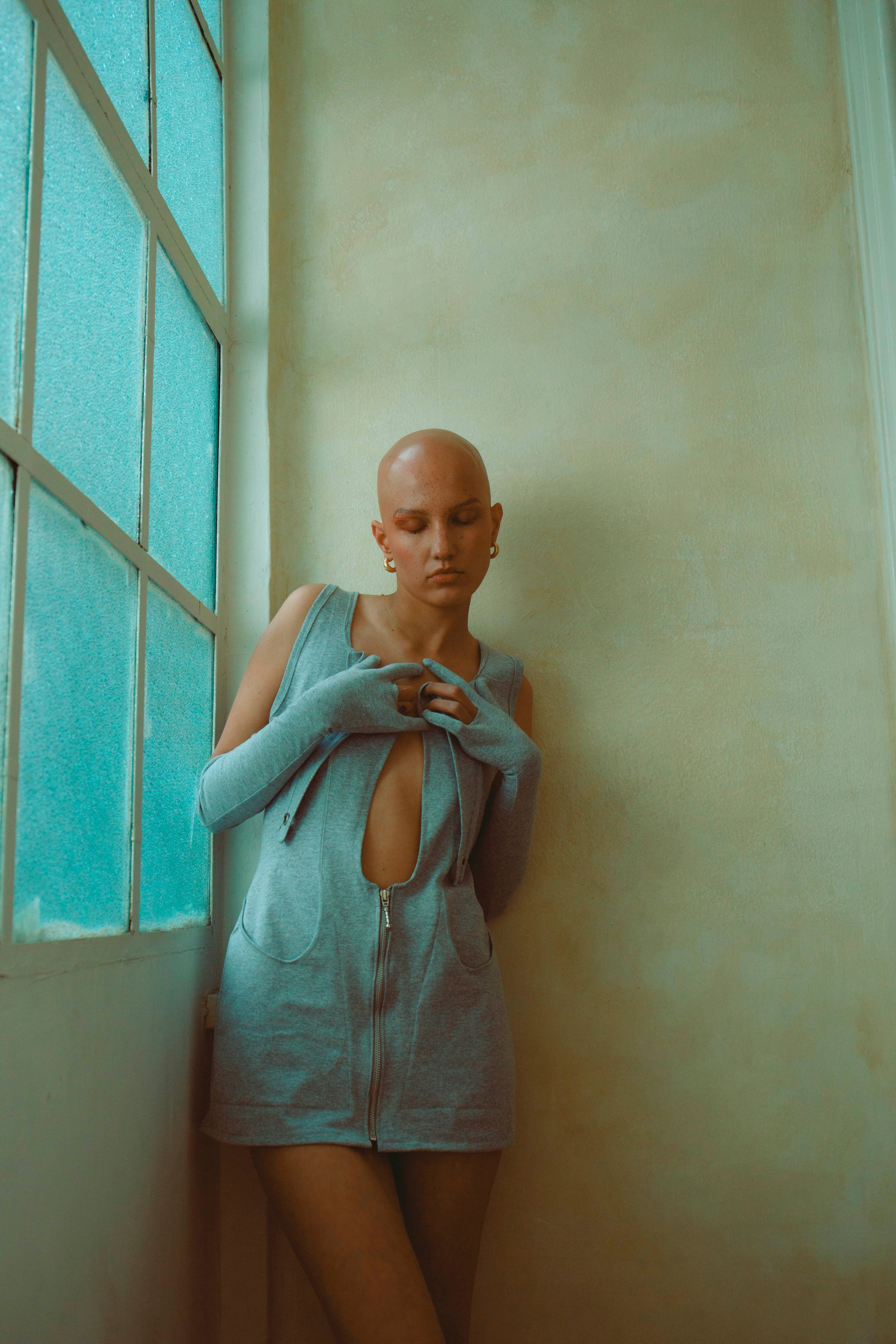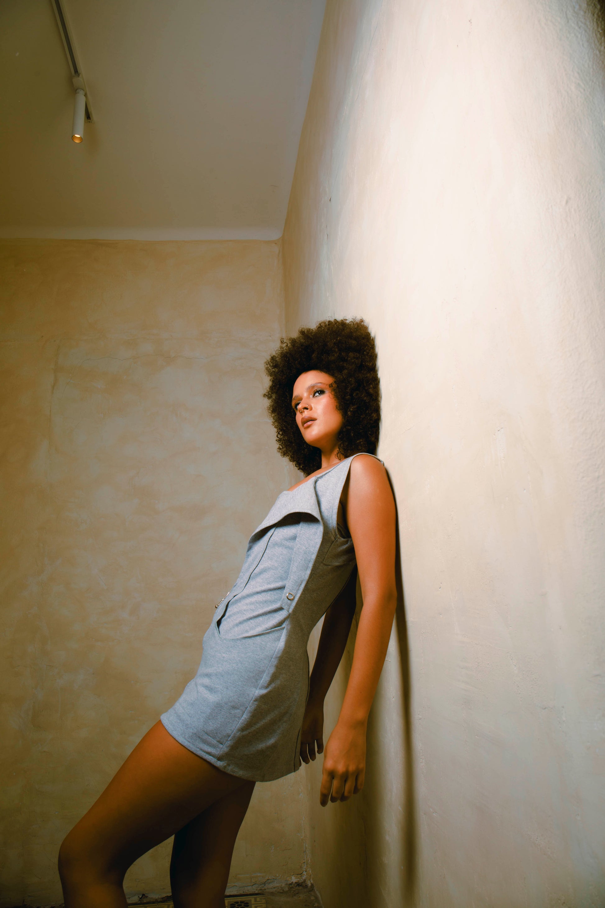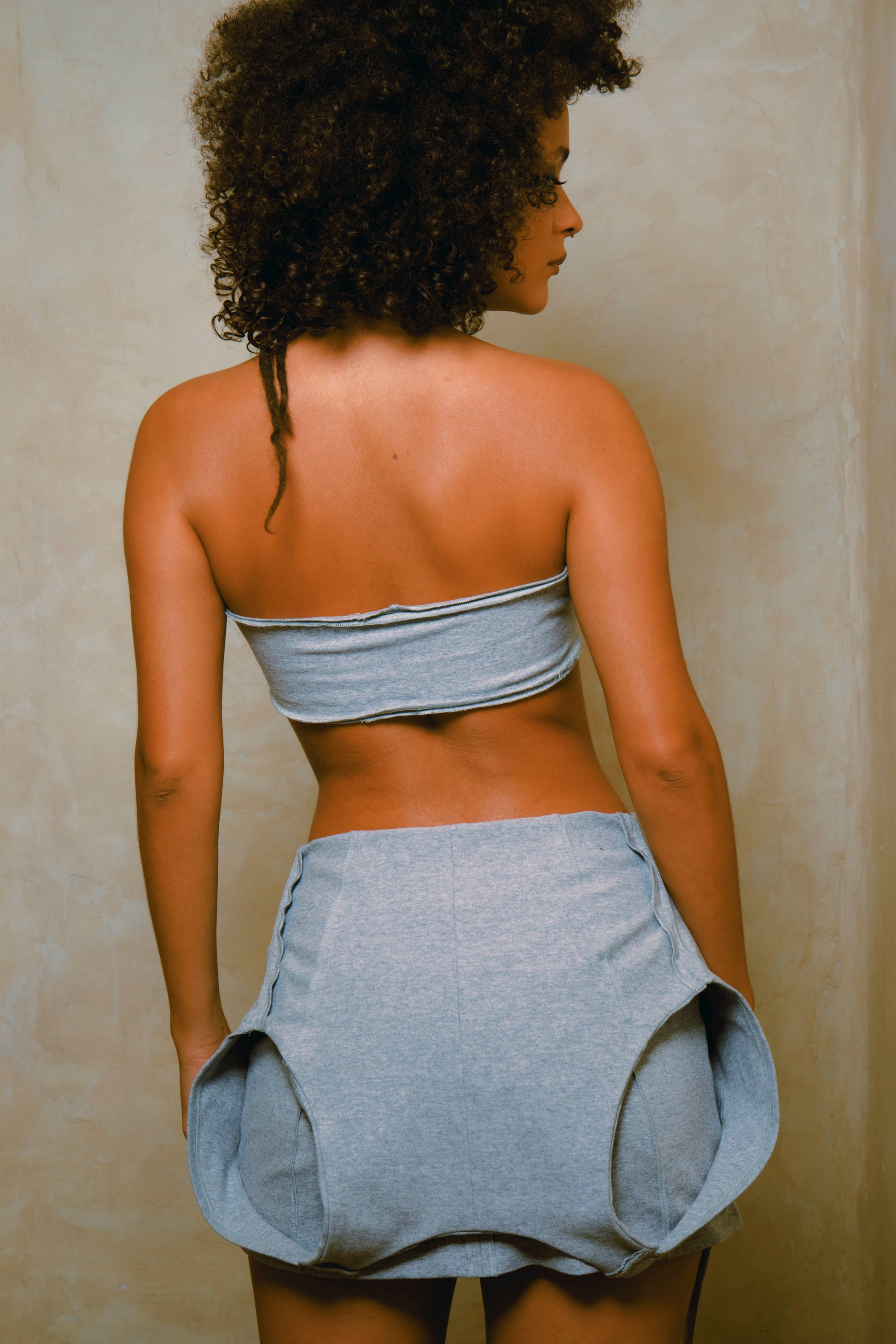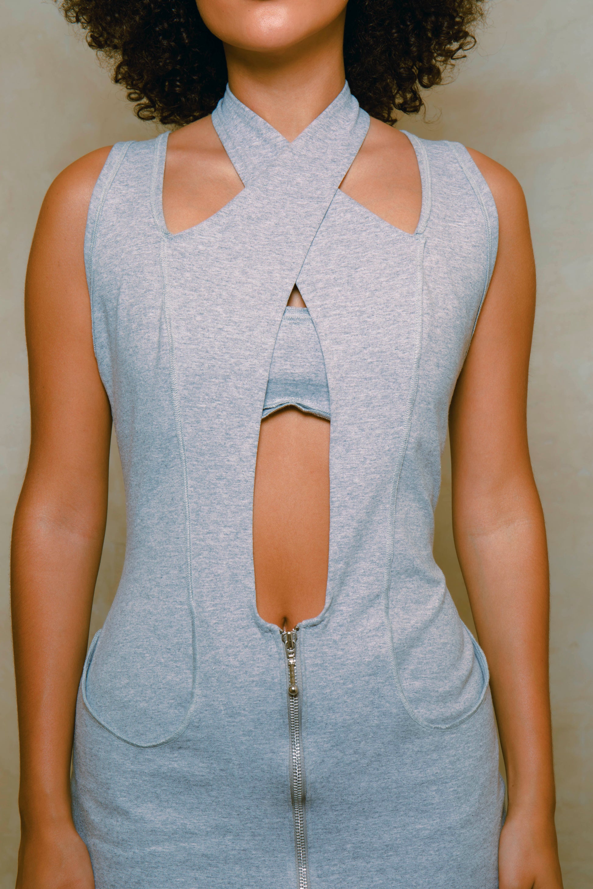 Additionally, the dress can be undone at the neck and the arms can be removed from the armhole, effortlessly transforming it into a skirt. The fitted waistline of the dressform allows it to fold smoothly along this axis.