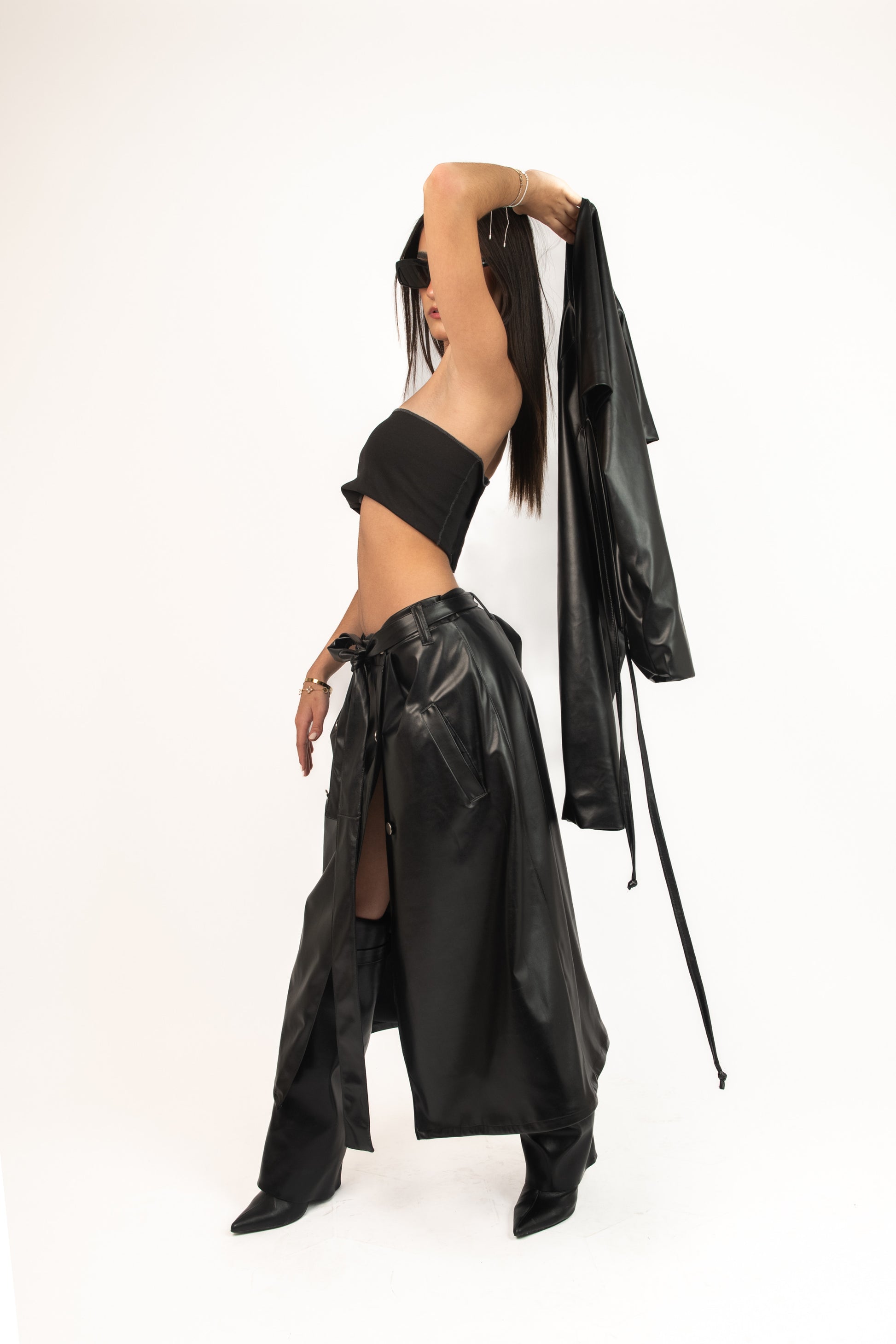 Este Trenchcoat se divide en 3 piezas, un chaleco, un croptop cruzado de manga larga y una falda. Puedes jugar con el acomodo de sus piezas a placer. por ejemplo, el croptop y el chaleco juntos crean una chamarra corta. El chaleco y la falda crean un chaleco largo. También puedes utilizar el croptop con la falda para hacer un look más coqueto, sin mencionar todas las maneras en las que puedes utilizar sus piezas combinándolas con prendas que ya tienes en tu clóset. Está fabricado en piel vegana. Hecho en México de manera ética.