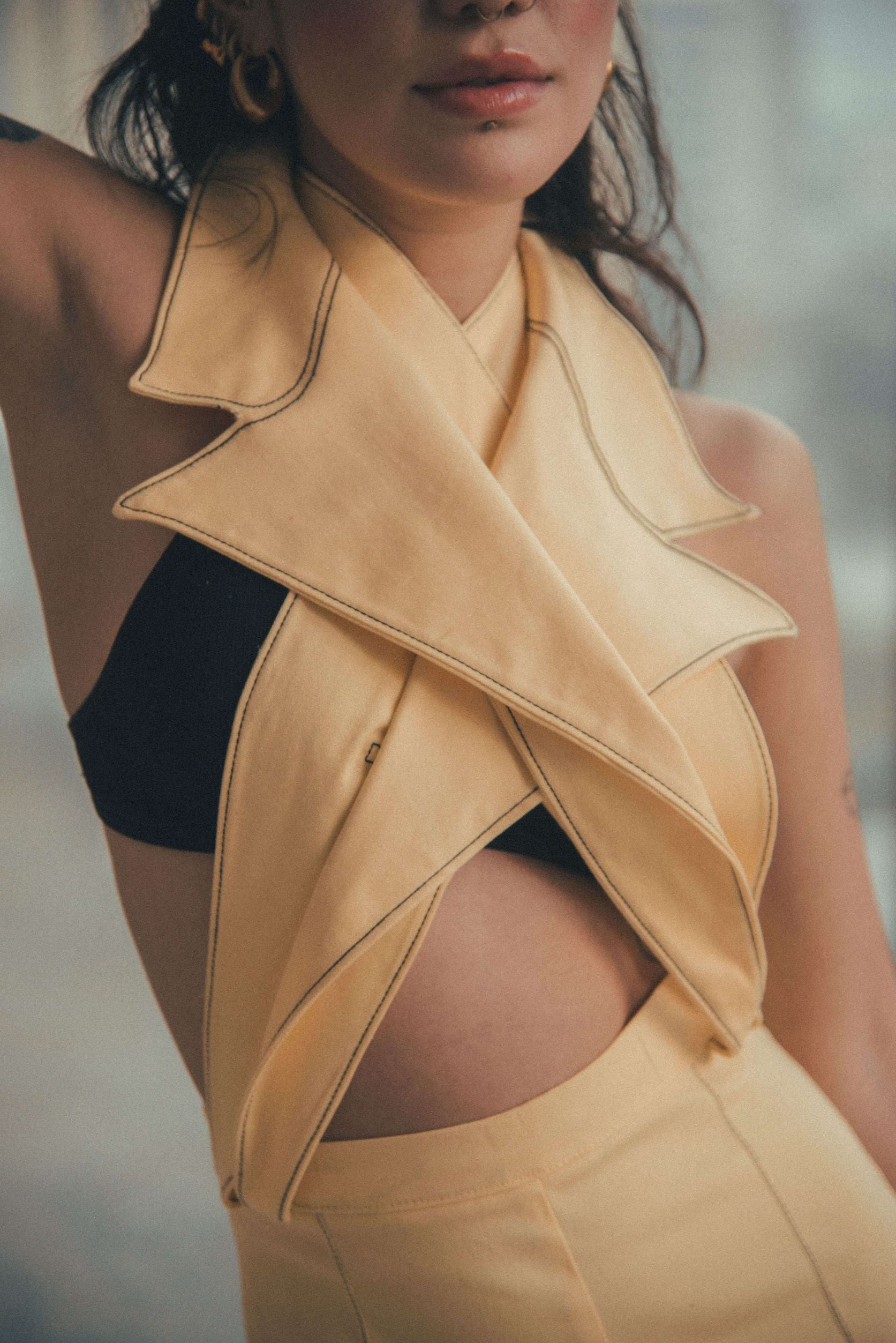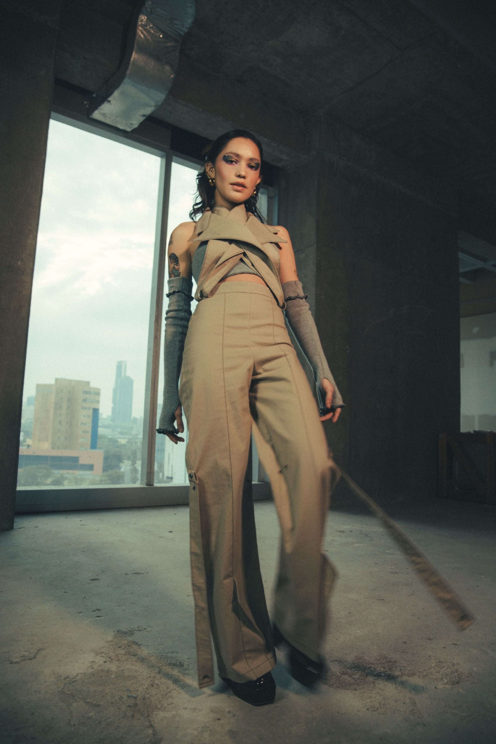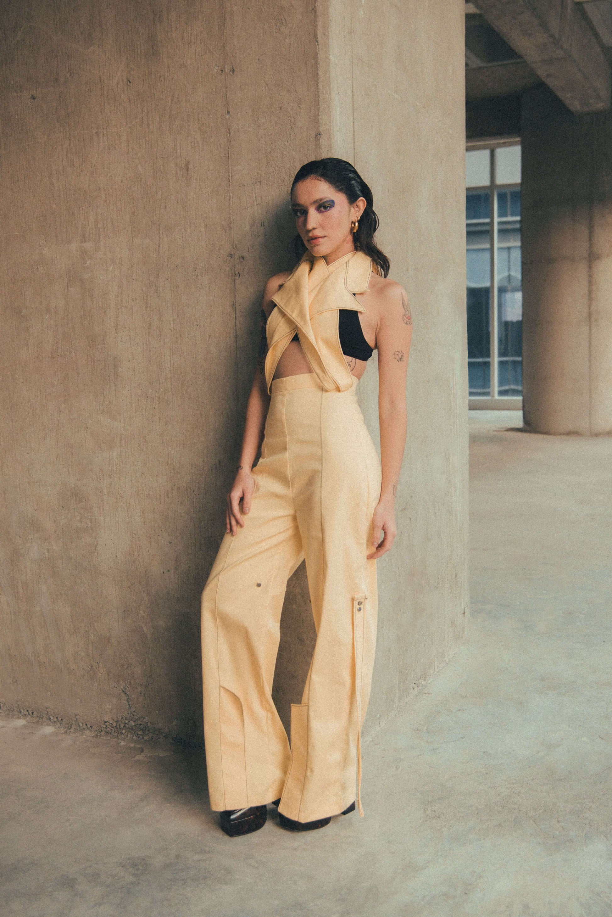 Prenda multiuso que puede utilizarse como pantalón o como enterizo. Las piezas del costado se cruzan y se atan en el cuello, así como las solapas, se cruzan por el pecho y en el cuello se abotonan unas con otras. Logrando así la transformación del look. Las tiras inferiores de los costados se abrochan para ajustar en el ancho del pantalón por de bajo de la rodilla, también pueden soltarse y retirarse para lograr el look que desees. Fabricado en tela de algodón con spandex. Hecho en México de manera ética y sustentable. Esta prenda toma 12/20 dias en completarse