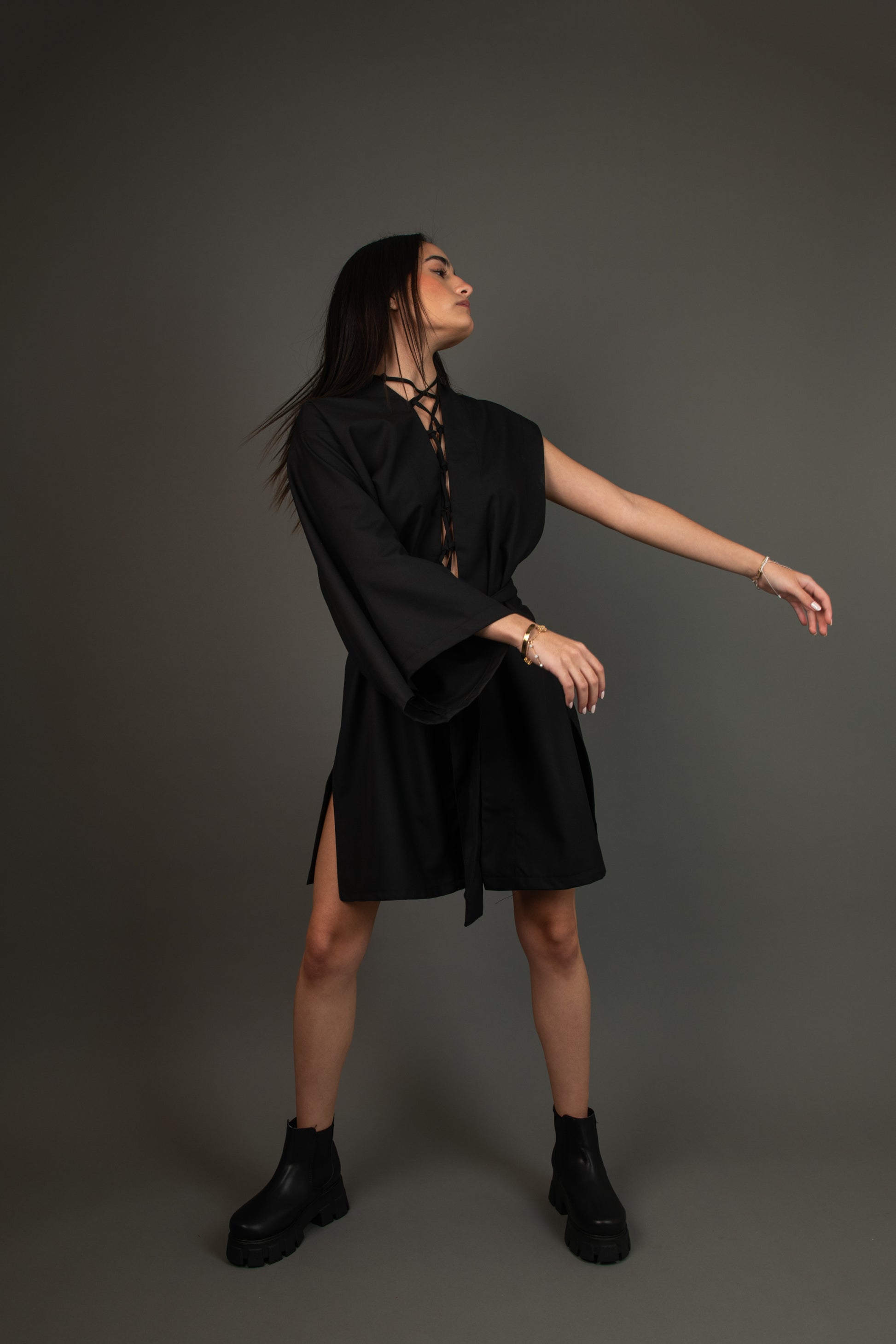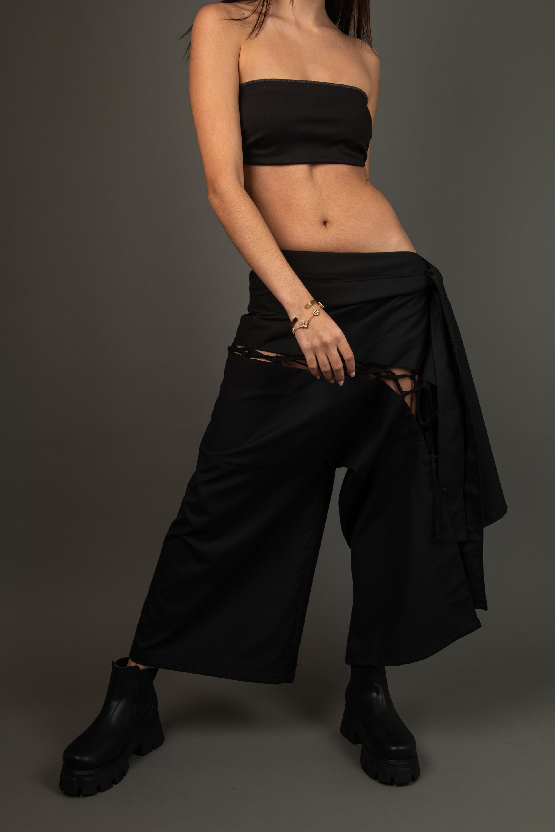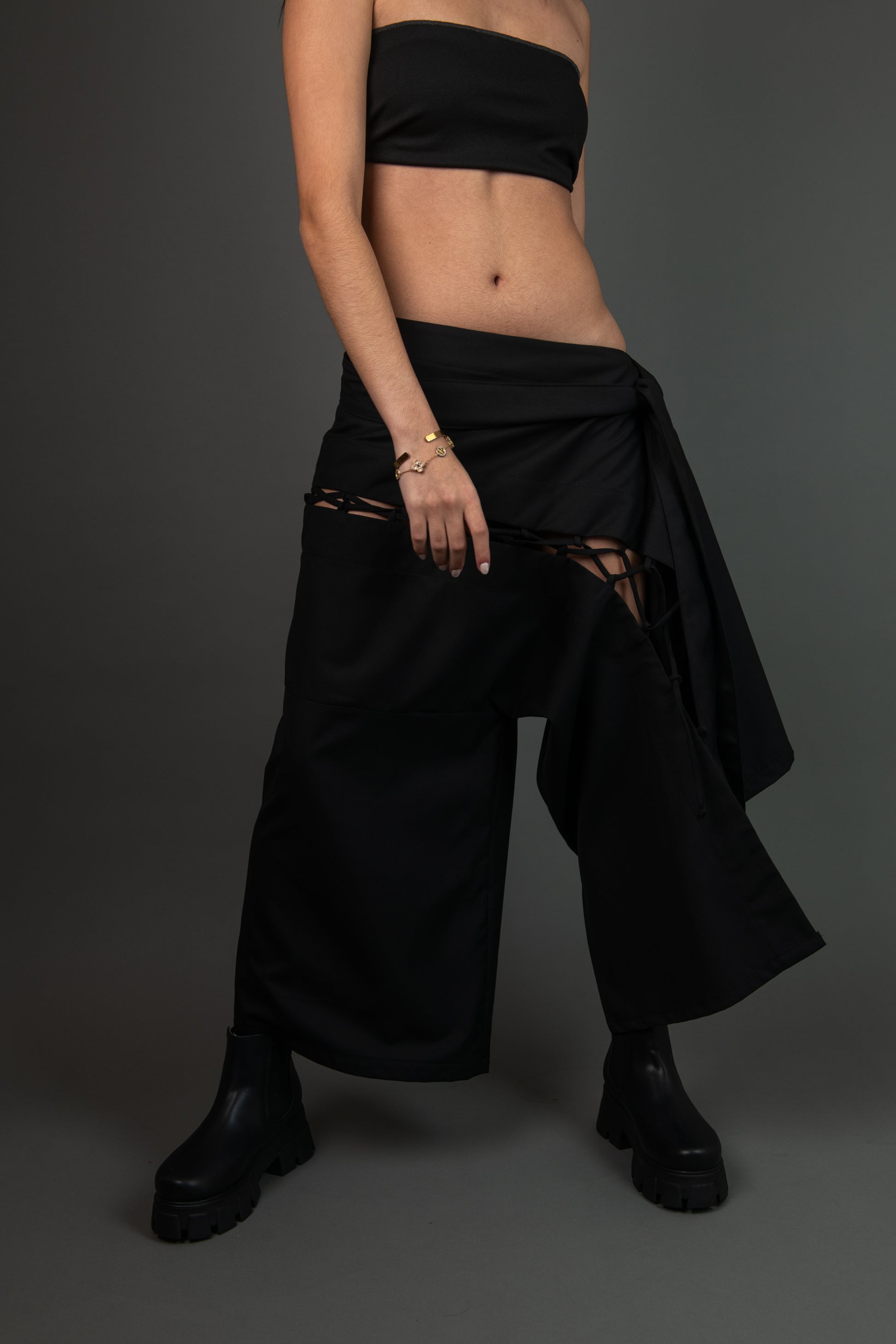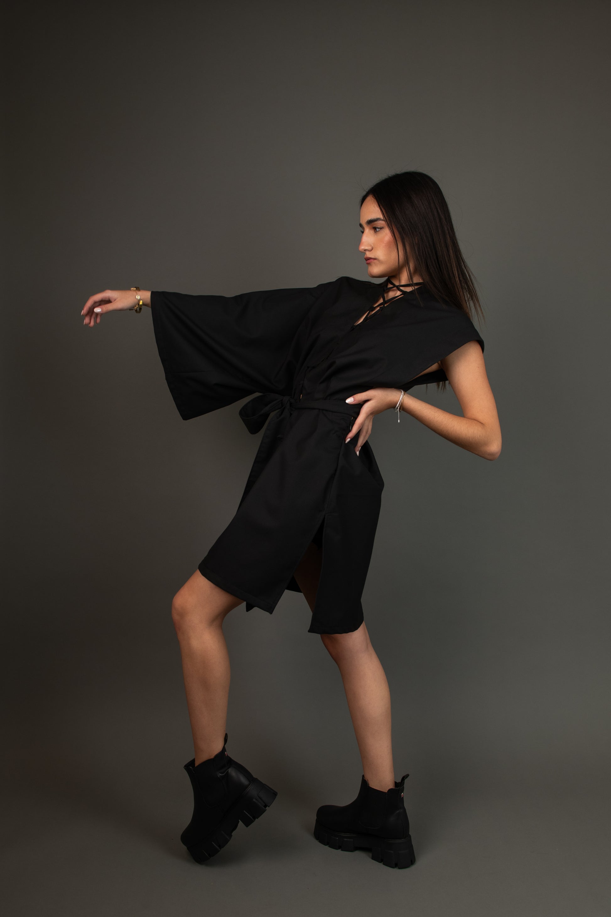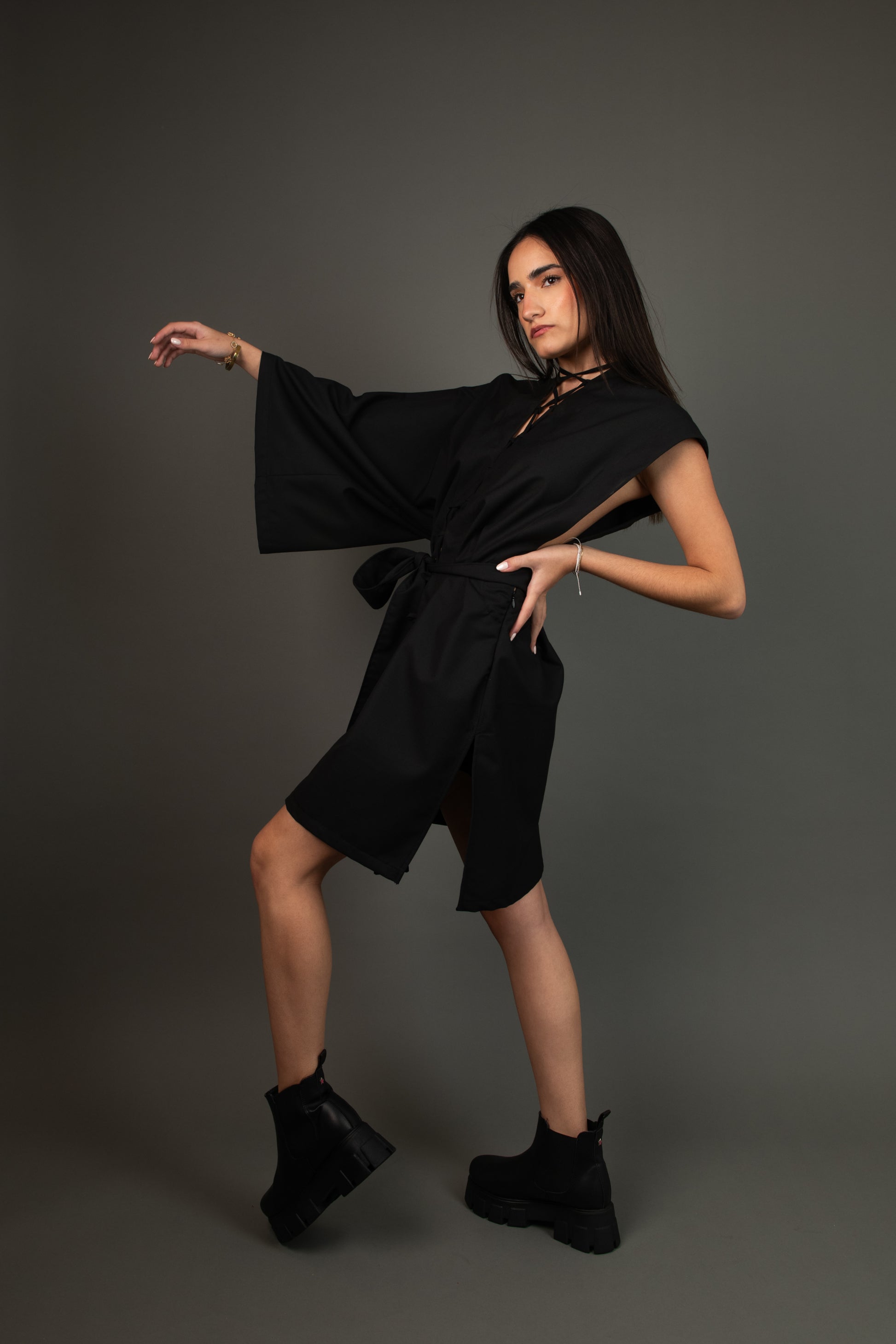 Multifunctional garment that can be used as a Kimono and as a pants, it has a closure on the side which allows adjustment at the waist at the time of transformation.
