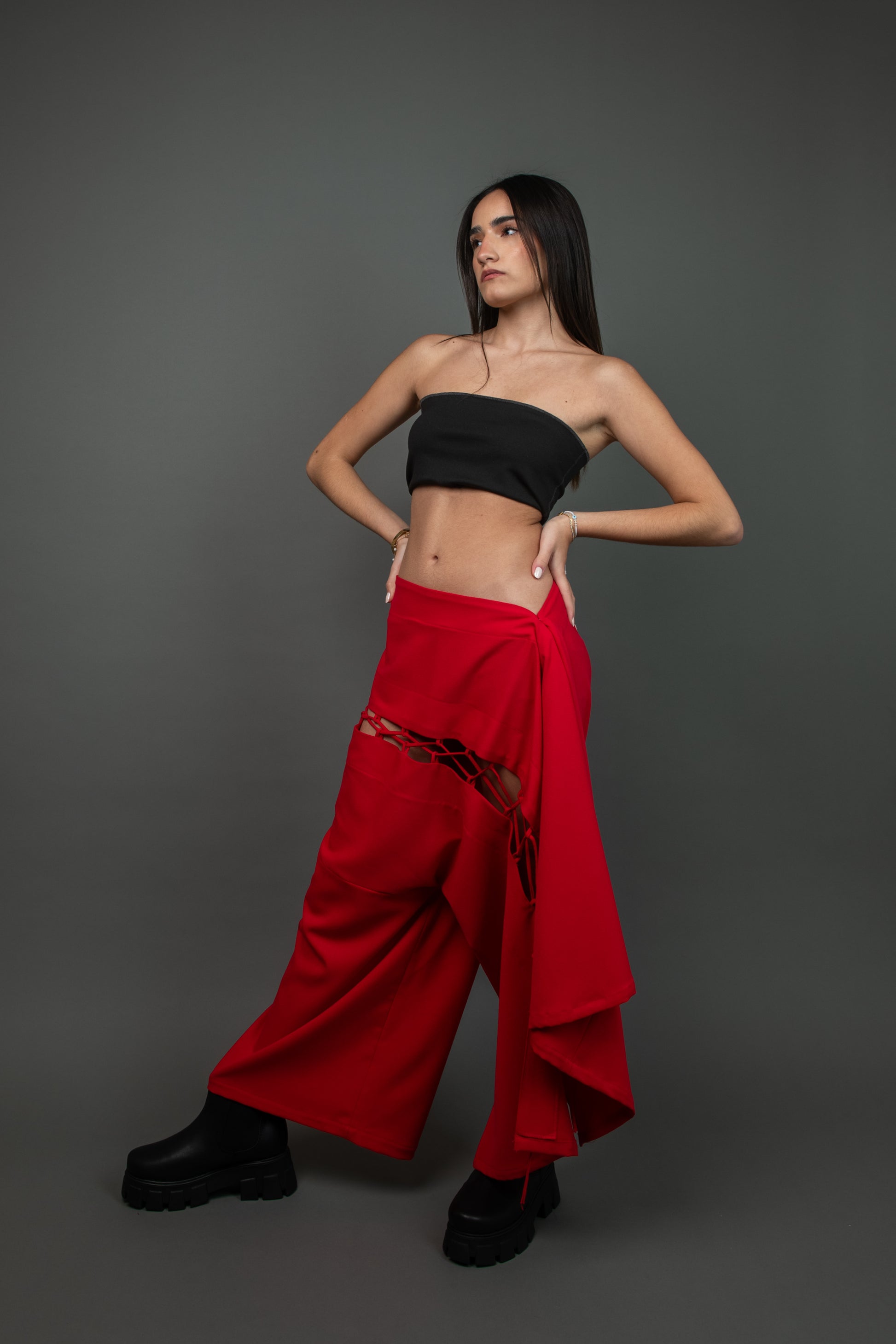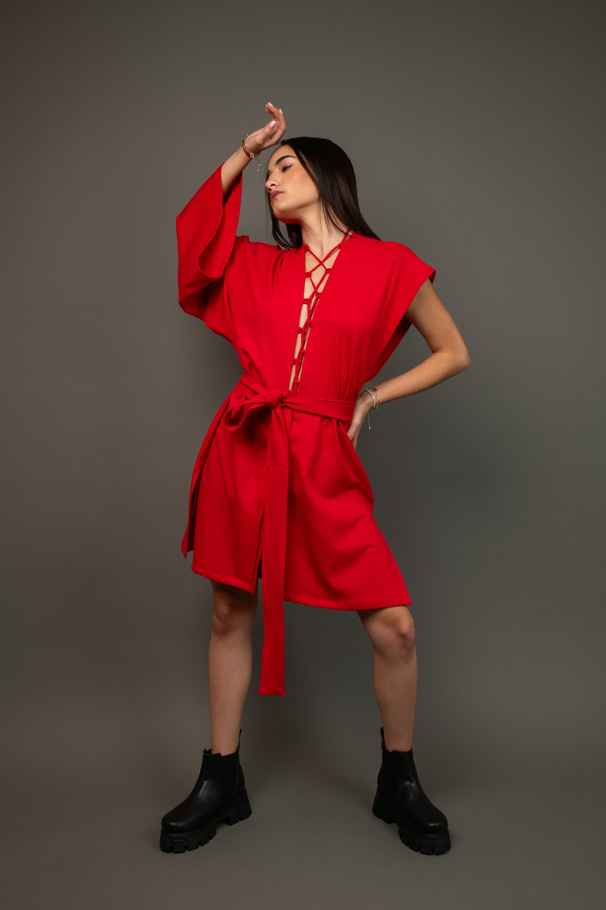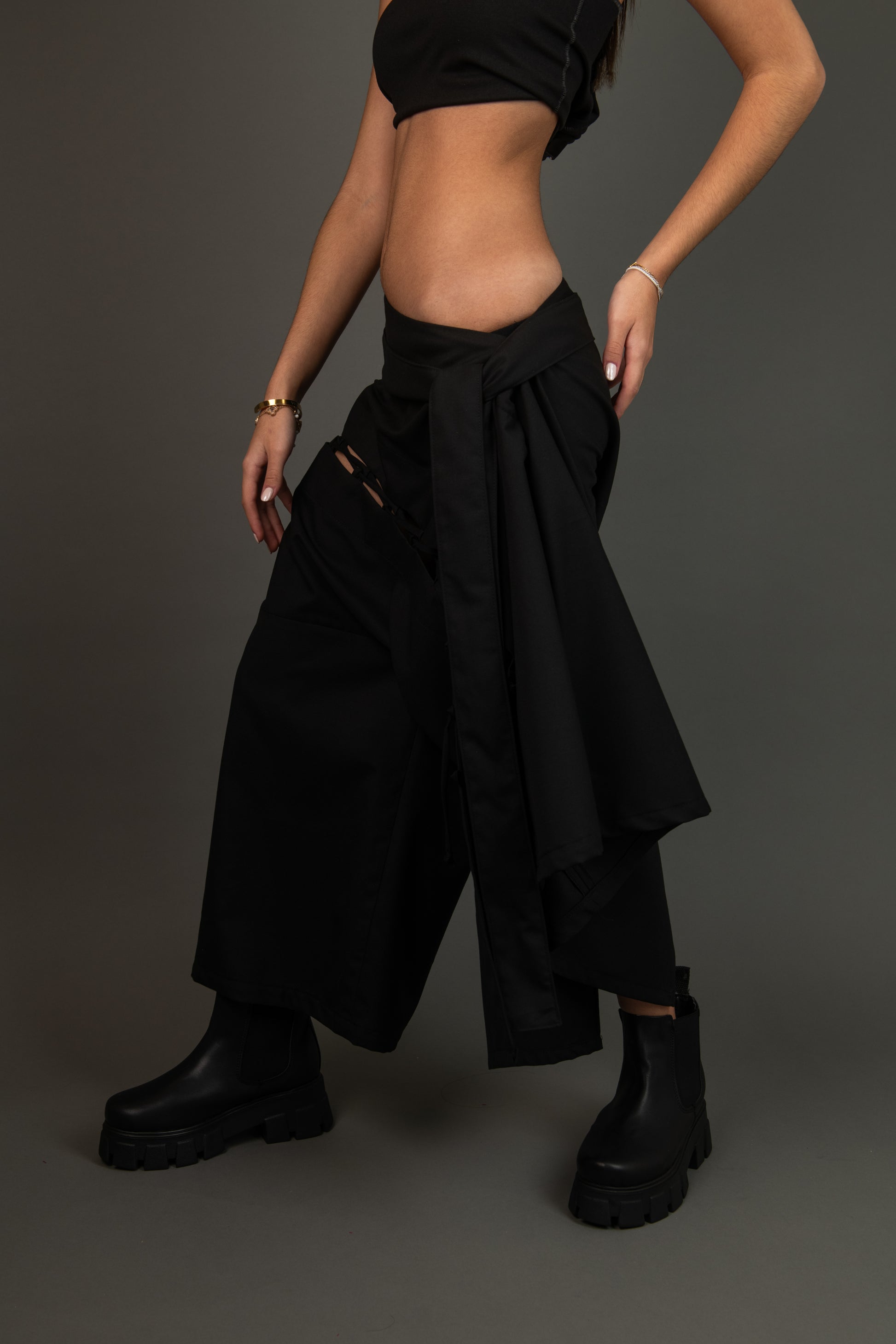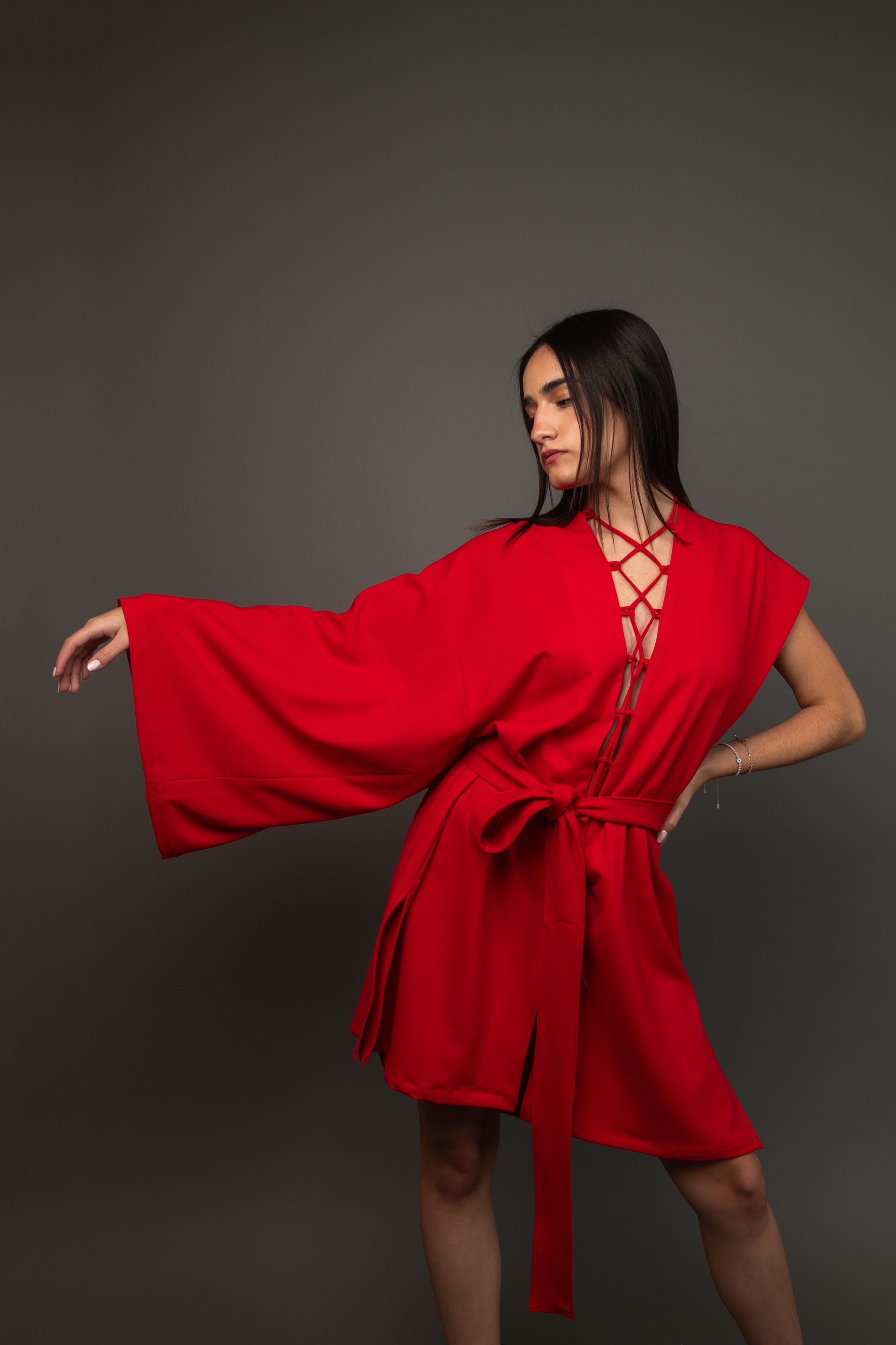 Multifunctional garment that can be used as a Kimono and as a pants, it has a closure on the side which allows adjustment at the waist at the time of transformation.