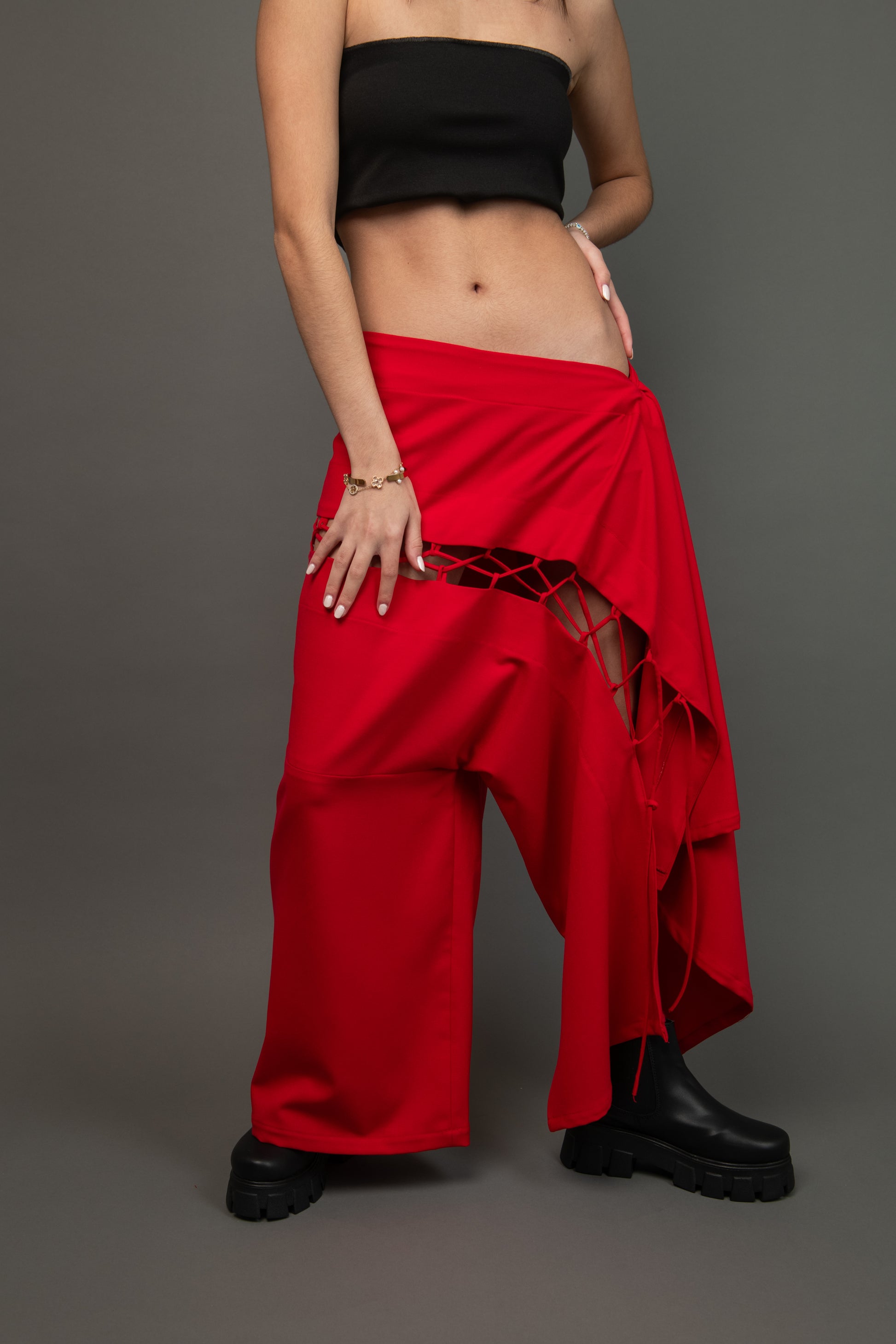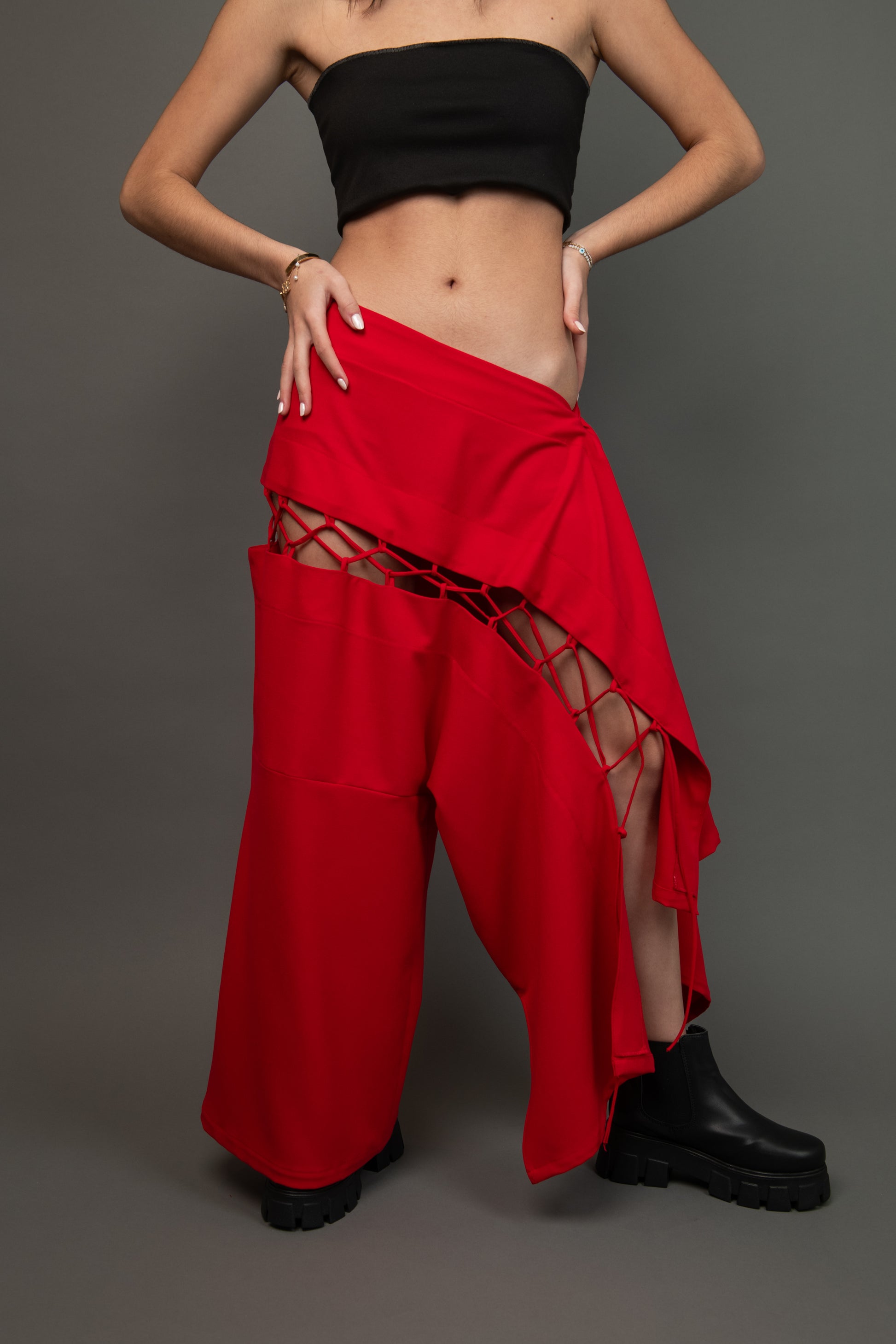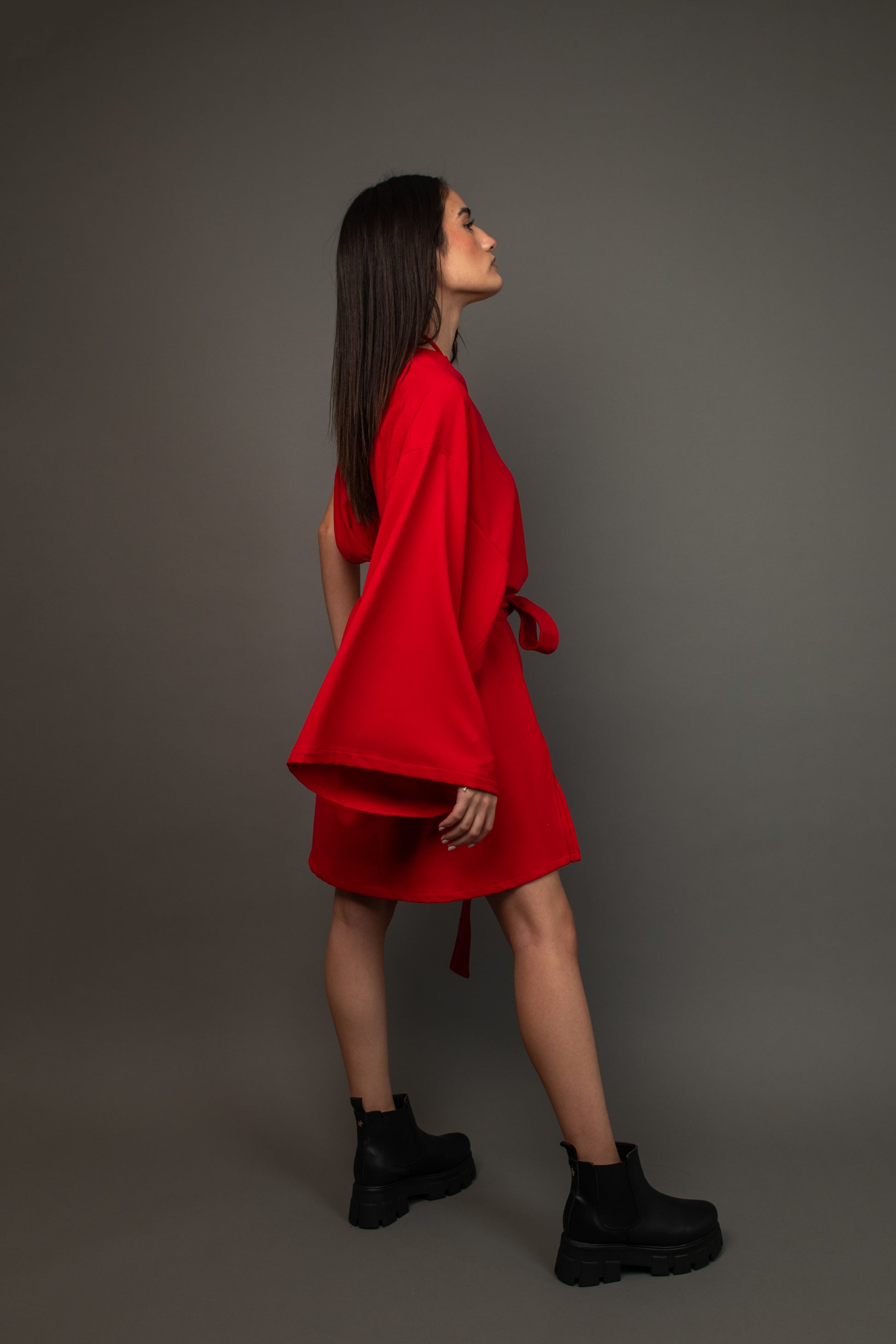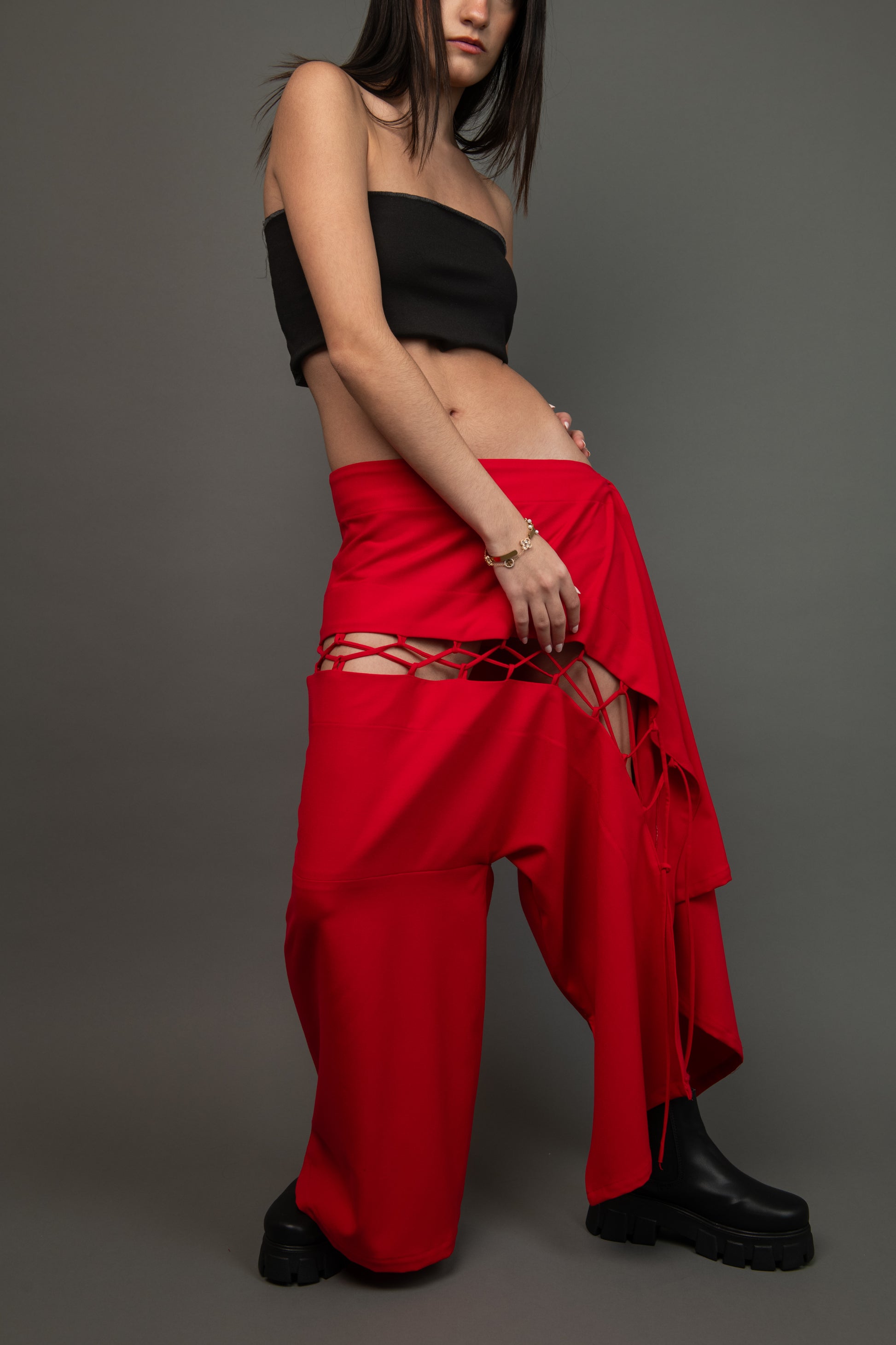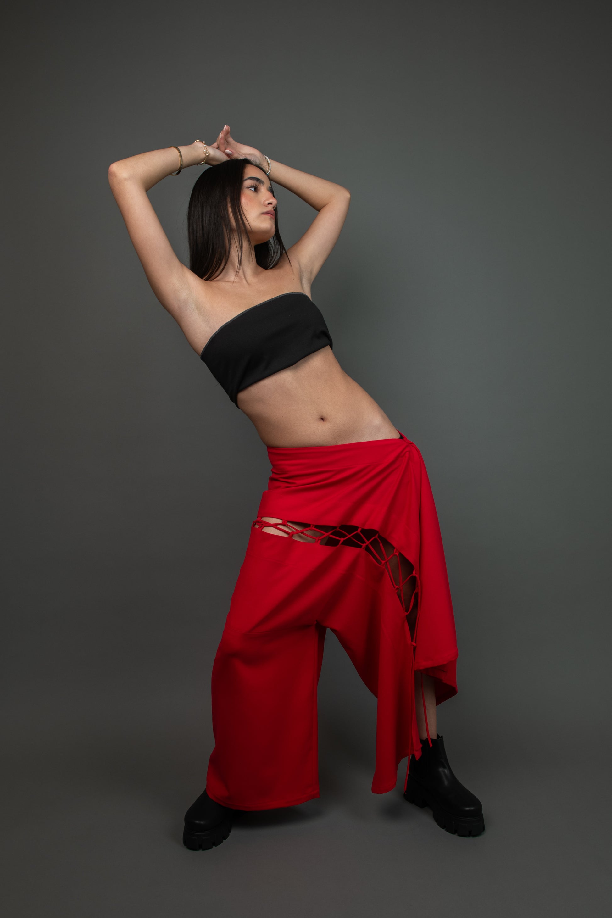 Multifunctional garment that can be used as a Kimono and as a pants, it has a closure on the side which allows adjustment at the waist at the time of transformation.