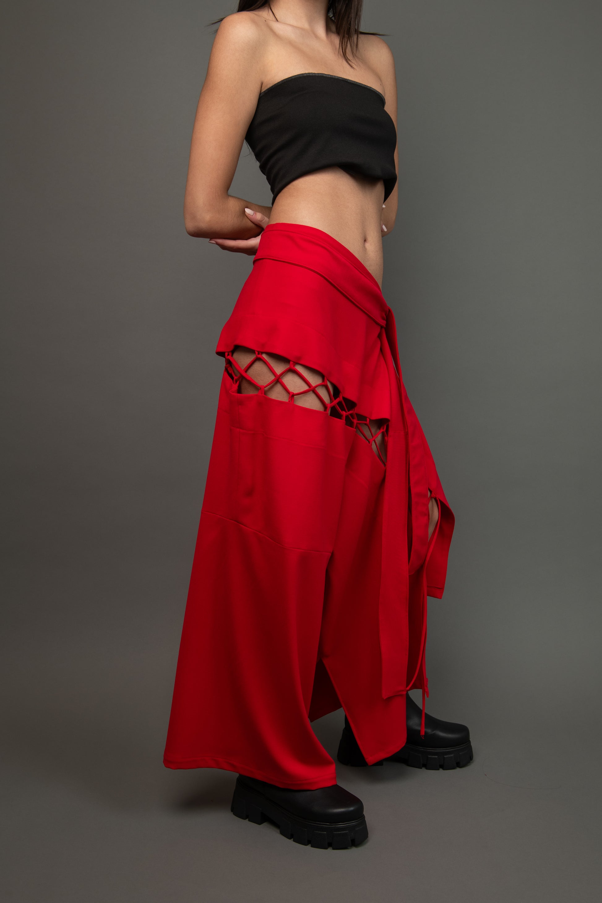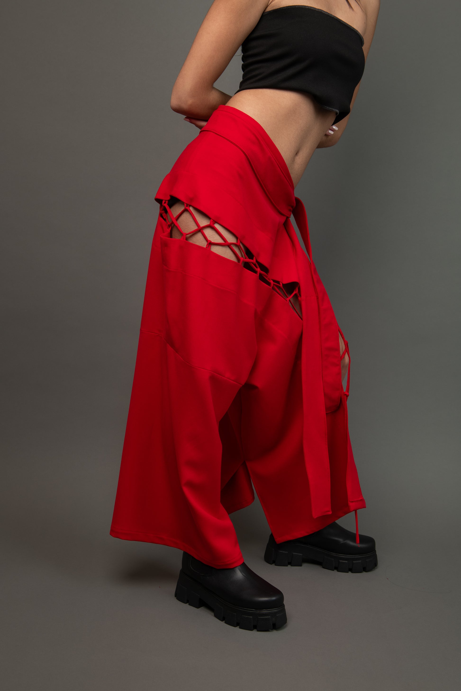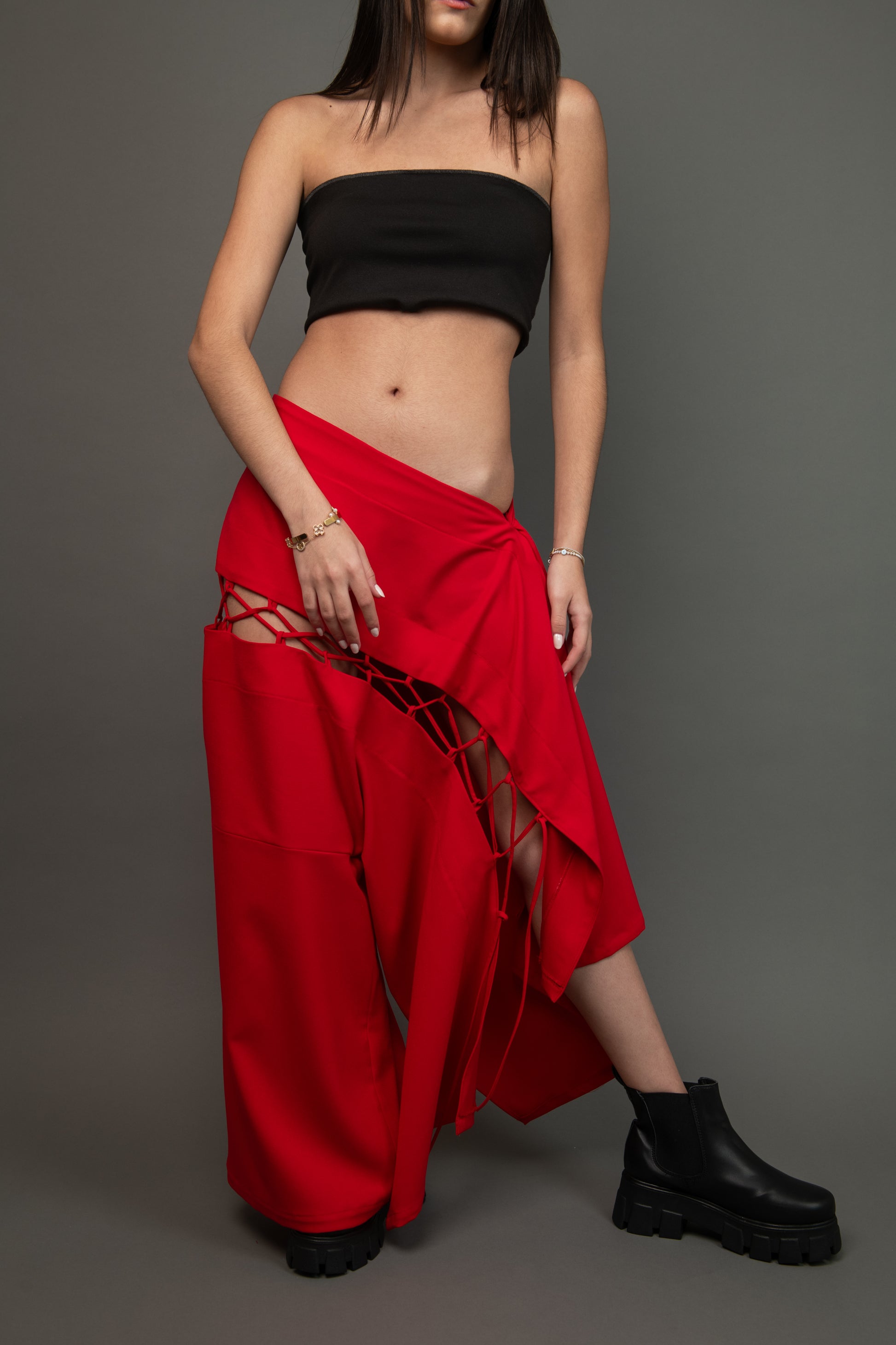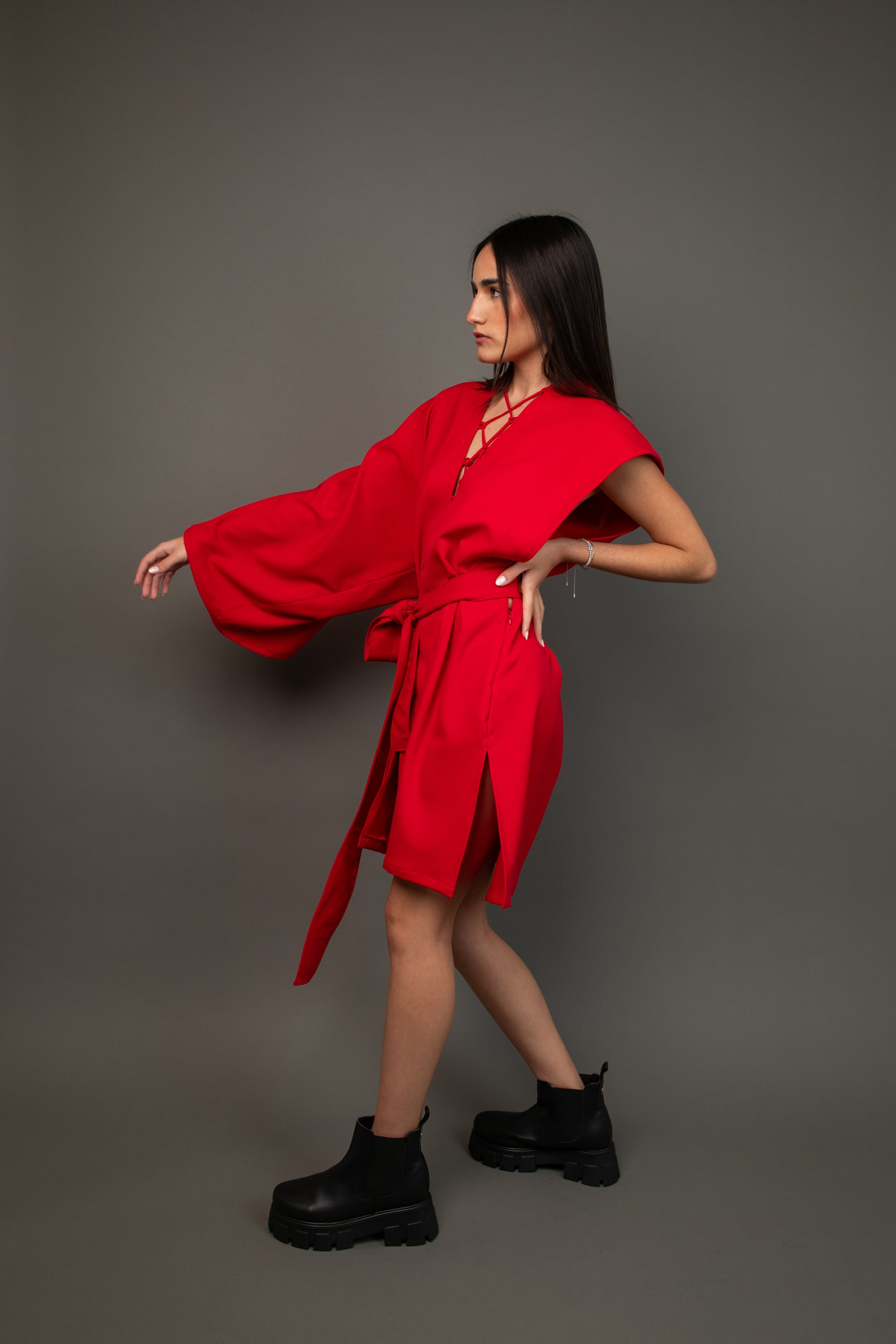 Multifunctional garment that can be used as a Kimono and as a pants, it has a closure on the side which allows adjustment at the waist at the time of transformation.